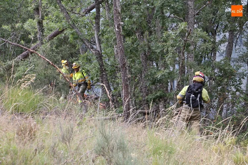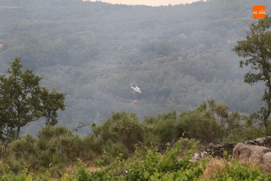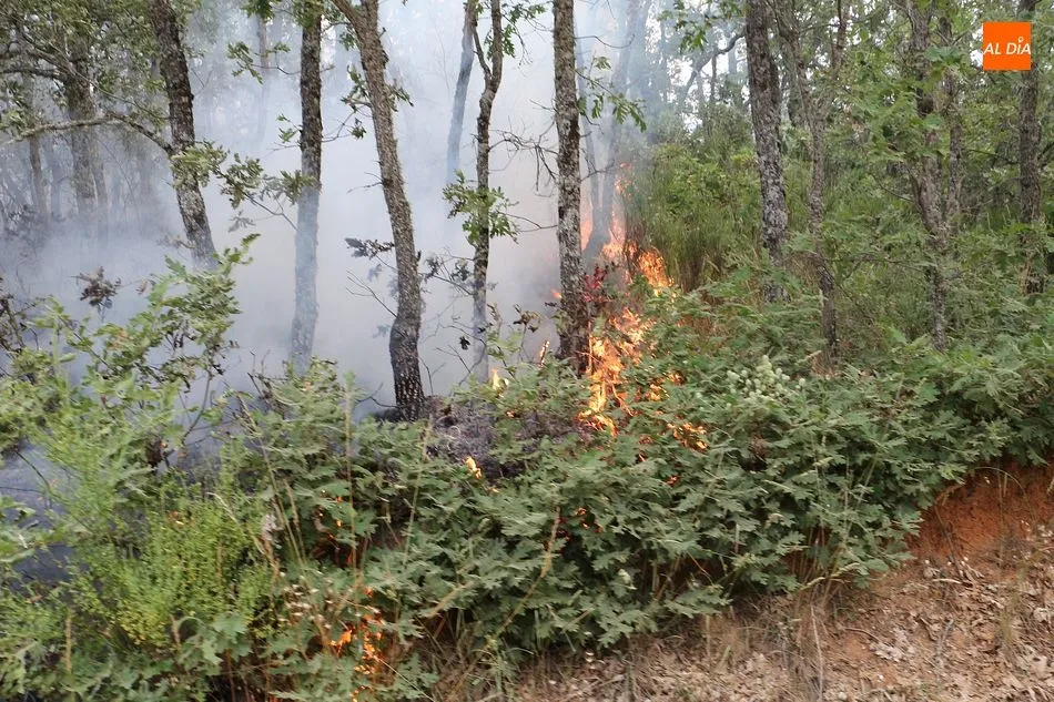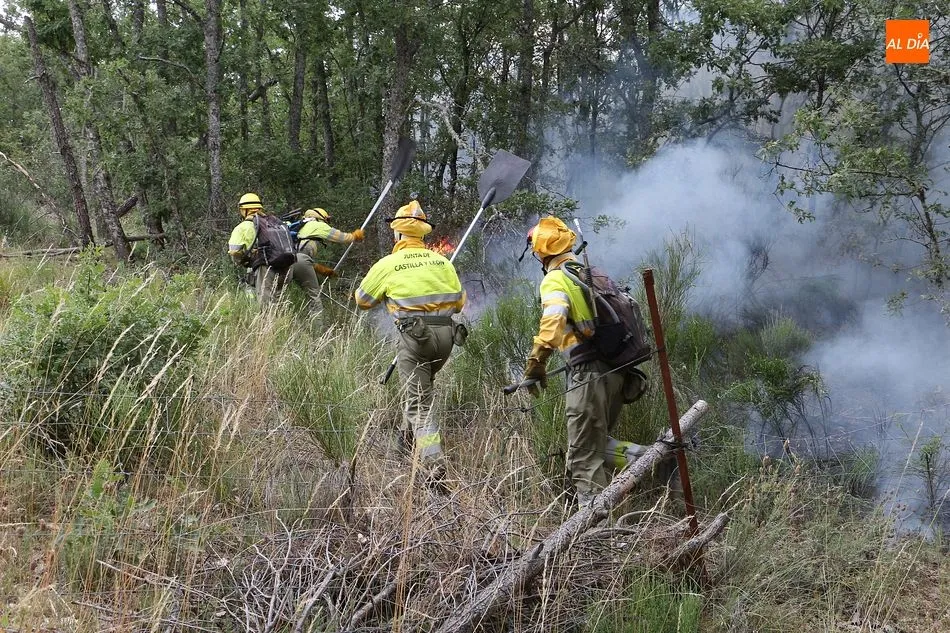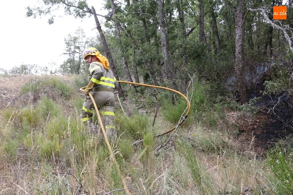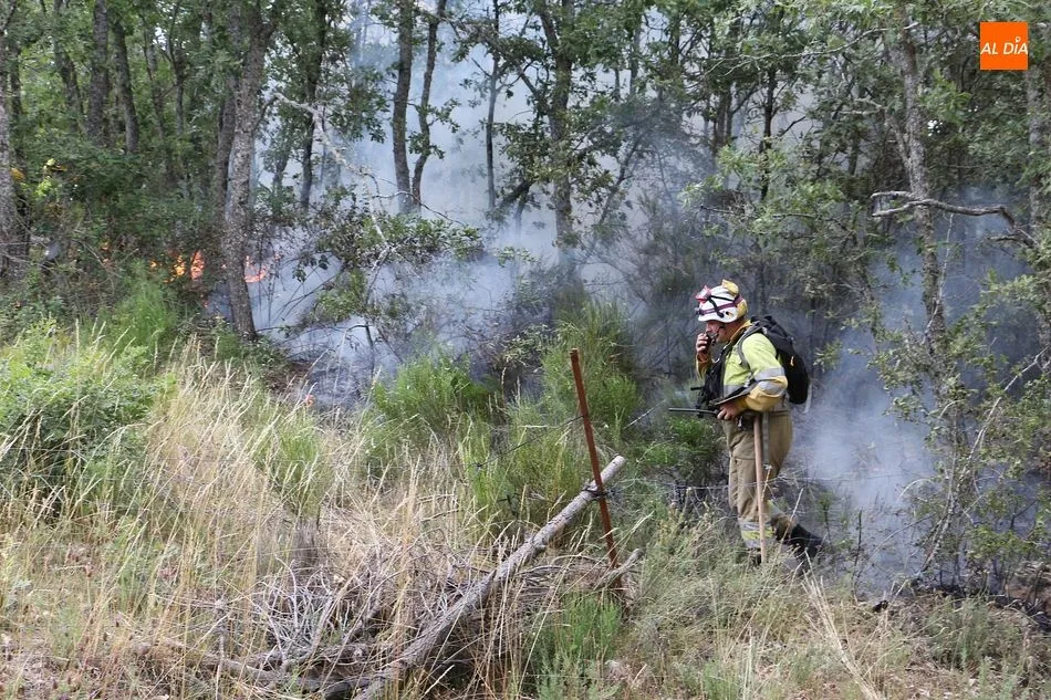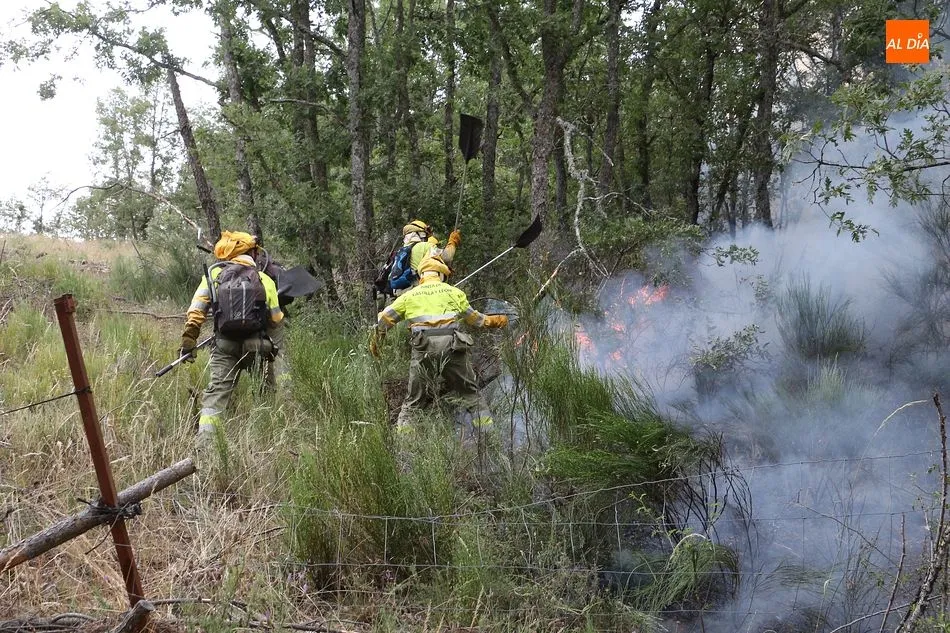 Los bomberos trabajan en la extinción de un incendio declarado en las inmediaciones de San Esteban de la Sierra, en la zona ubicada entre Entresierras y la Sierra de Francia. En torno a las 17:00 horas se dio la voz de alarma en dos focos distintos: una zona conocida como el ?prao del concejo? y en una parcela privada del polígono 5, todo ello en el término municipal de San Esteban.