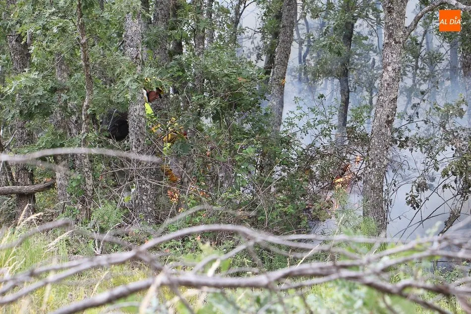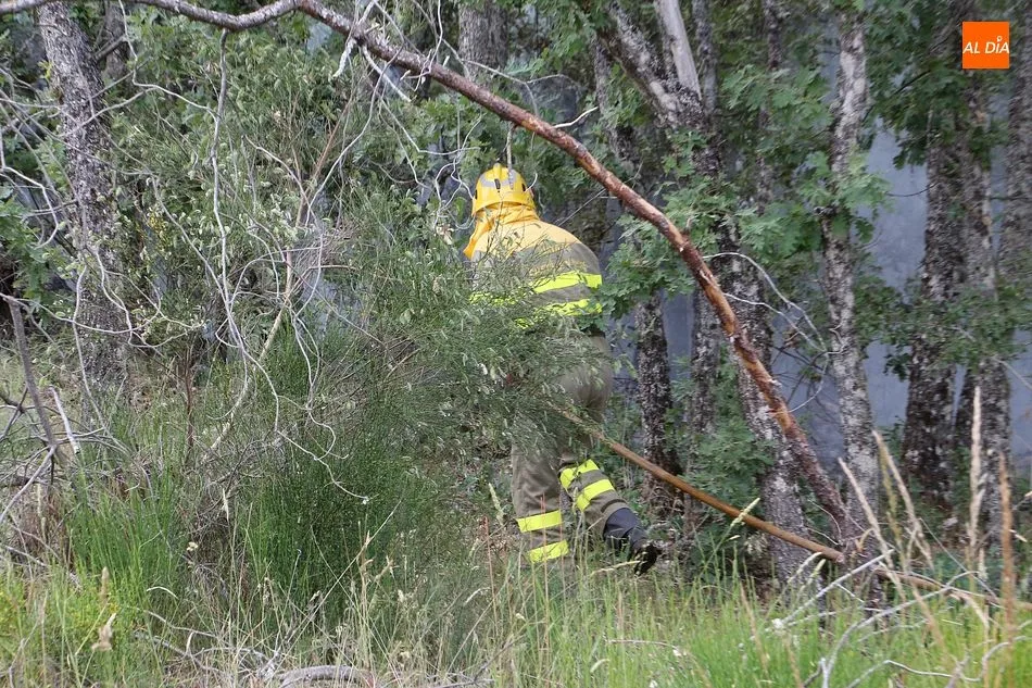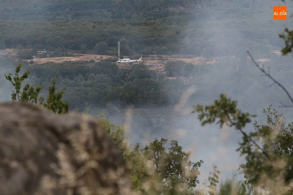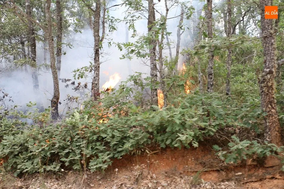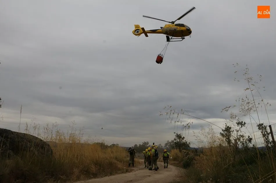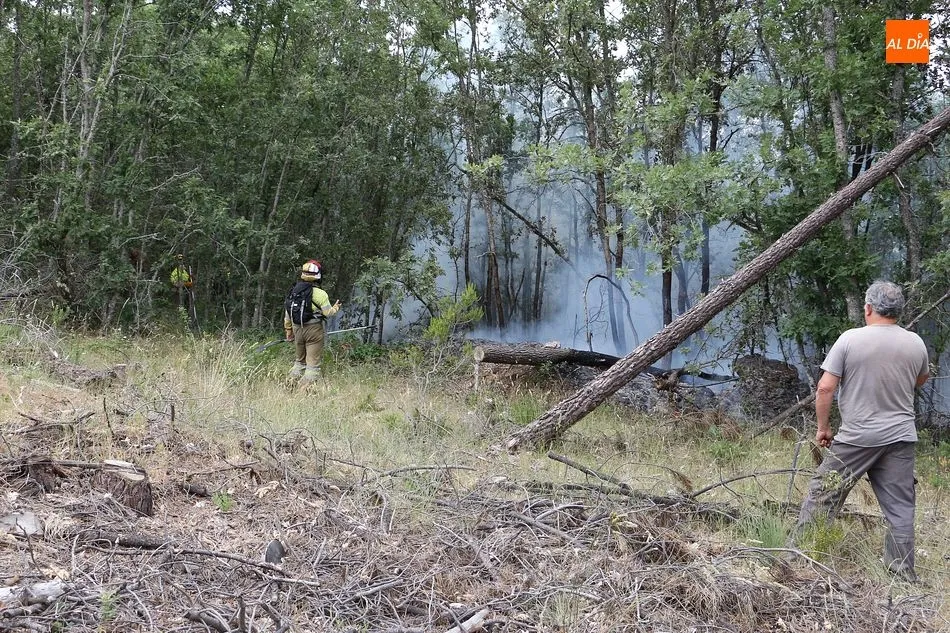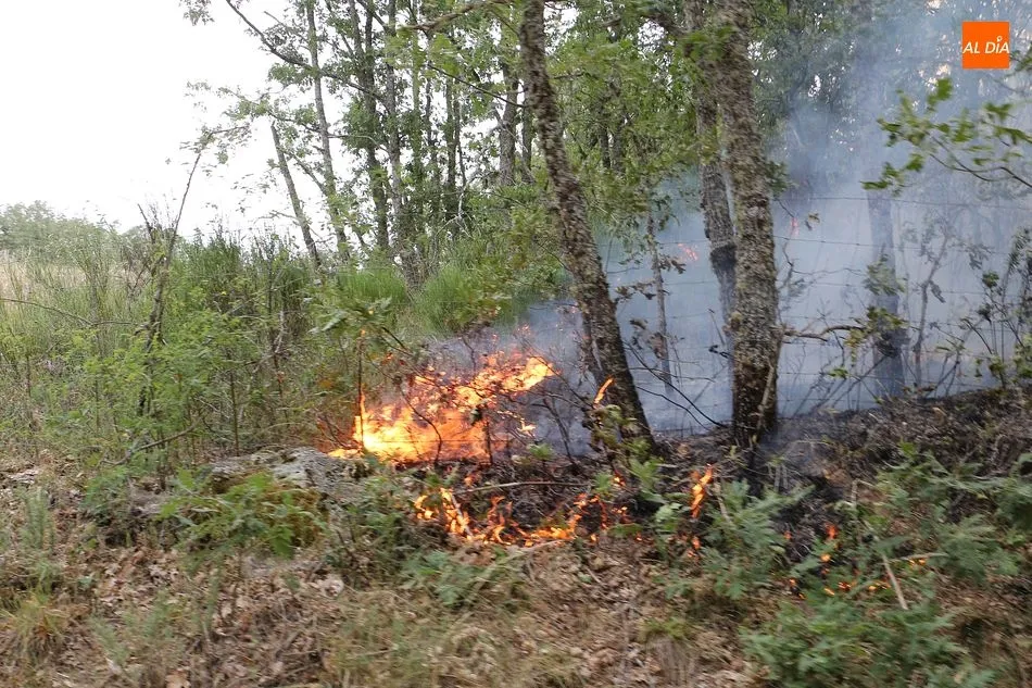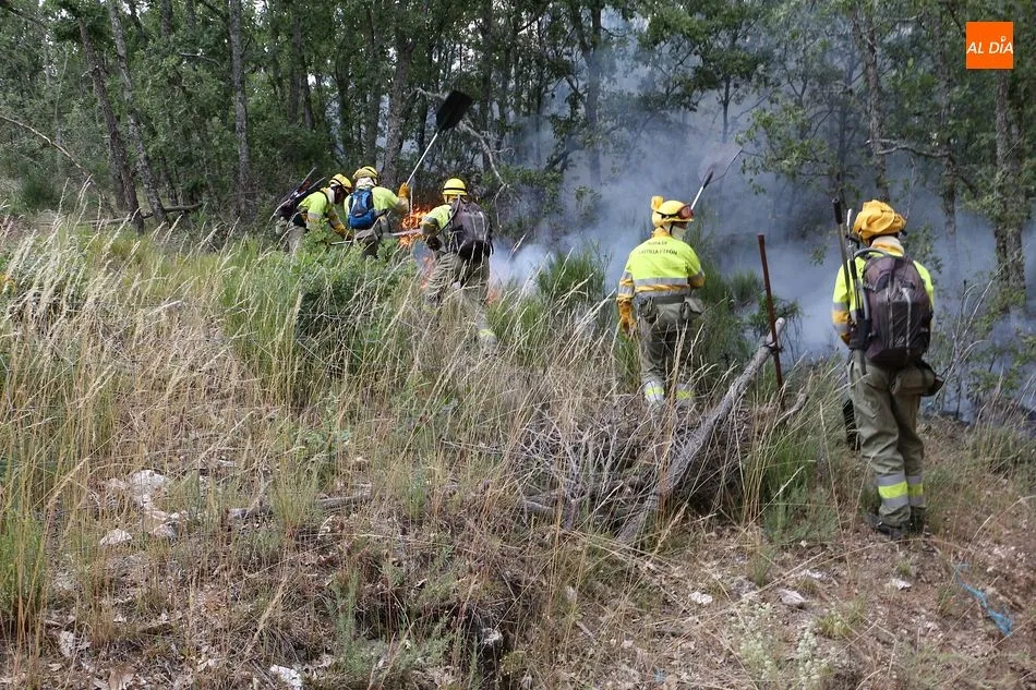 Los bomberos trabajan en la extinción de un incendio declarado en las inmediaciones de San Esteban de la Sierra, en la zona ubicada entre Entresierras y la Sierra de Francia. En torno a las 17:00 horas se dio la voz de alarma en dos focos distintos: una zona conocida como el ?prao del concejo? y en una parcela privada del polígono 5, todo ello en el término municipal de San Esteban.