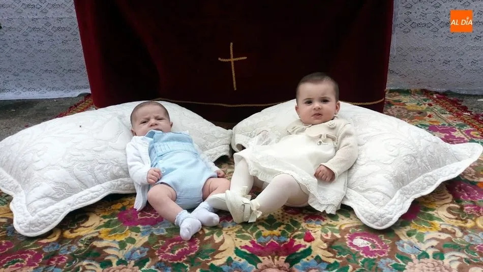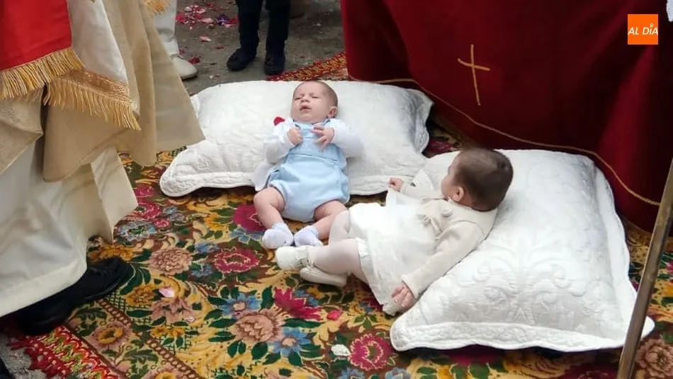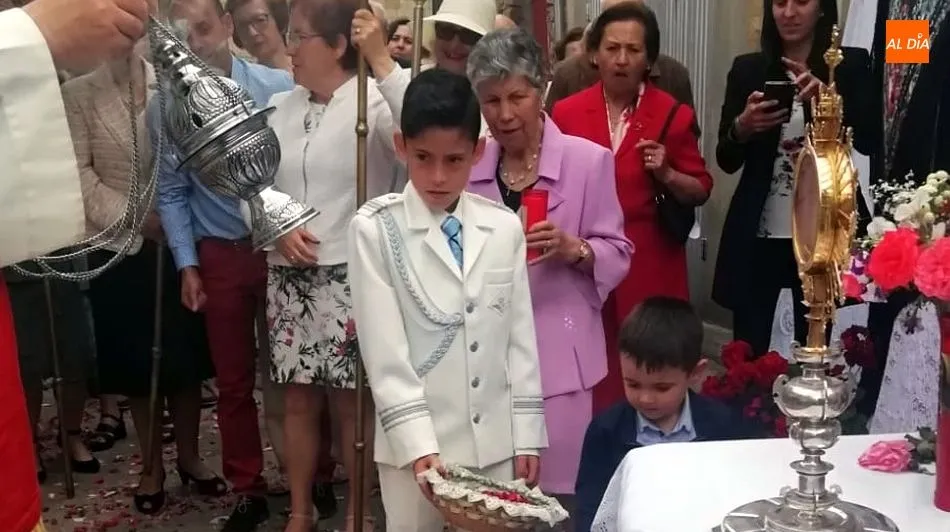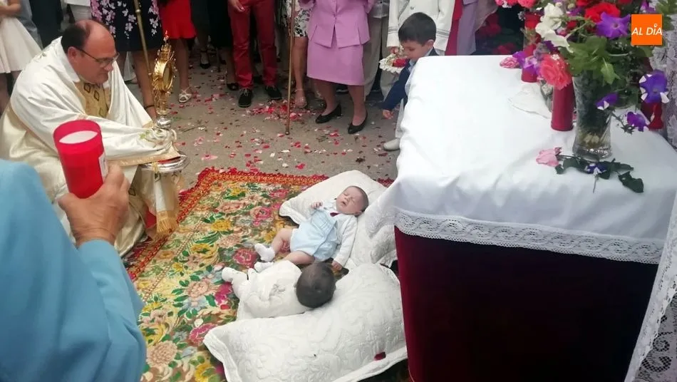 Hacía muchos años que los altares de Corpus de Sobradillo no acogían bebés para ser presentados al Santísimo durante la procesión. Hoy, en uno de los tres altares montados en la calle, los pequeños Lara y David esperaron la llegada de la Custodia del Santísimo que bajo palio recorrió el pueblo en procesión, después de la misa solemne. El párroco José Sanchez García depositó la Custodia en el altar y después de pronunciar unas oraciones, procedió a la bendición de los pequeños y del lugar con el incienso. La bendición llegó también a Héctor, el único niño de Primera Comunión que participó en la procesión.