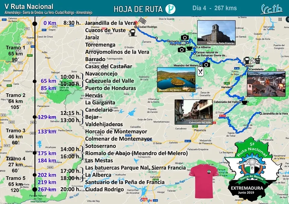 El sábado, la etapa comenzará en Jarandilla de la Vera, adentrándose en la provincia de Salamanca por Candelario. Tras recorrer la Sierra de Béjar y la Sierra de Francia (pasarán por el Santuario de la Peña de Francia en torno a las 18.00 horas), está previsto que lleguen sobre las 20.00 horas a Ciudad Rodrigo, donde pernoctarán.