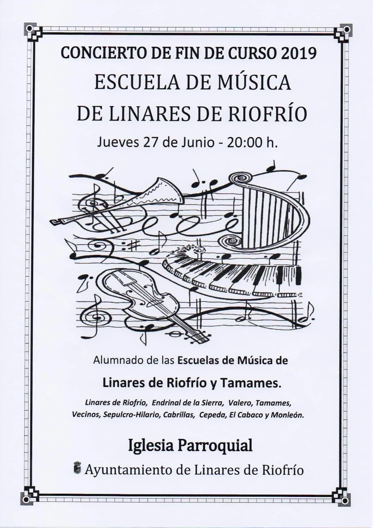 La iglesia parroquial de Linares de Riofrío acoge esta tarde el concierto de final de curso de la Escuela de Música de Linares de Riofrío y Tamames. El concierto comenzará a las 20:00 horas y contará con la participación de alumnos de música de Linares, Tamames, Valero, Vecinos, Sepulcro-Hilario, Cabrillas, Cepeda, El Cabaco y Monleón.