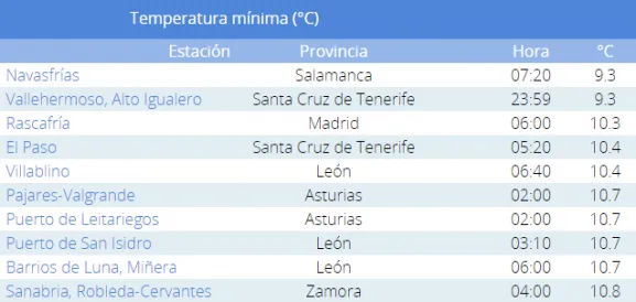 Según los datos de la AEMET, en todas las estaciones de medición de España menos esas la temperatura no bajó en toda la jornada del miércoles de los 10ºC. Evidentemente, desde las 7.20 horas en que se registró el dato más bajo en Navasfrías la temperatura fue creciendo, alcanzando durante el miércoles una máxima de 25,5ºC (a las 17.30 horas), en la línea de los datos de los últimos días (salvo el lunes, cuando la máxima no fue tan alta debido a las lluvias).