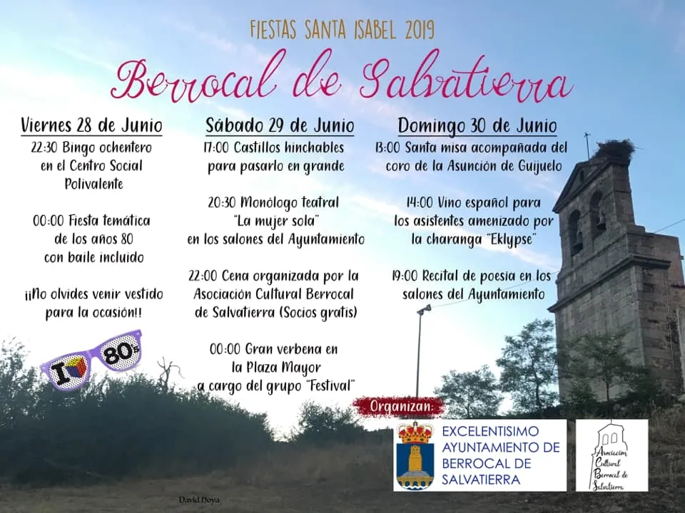 Berrocal de Salvatierra celebra este fin de semana sus fiestas en honor a Santa Isabel. Las actividades las propone el Consistorio junto a la Asociación Cultural Berrocal de Salvatierra, comenzando hoy mismo con una fiesta homenaje a los años 80 a partir de las 22.30 horas. Mañana sábado habrá teatro, cena y verbena, mientras que el domingo será el día reservado para honrar a la patrona.