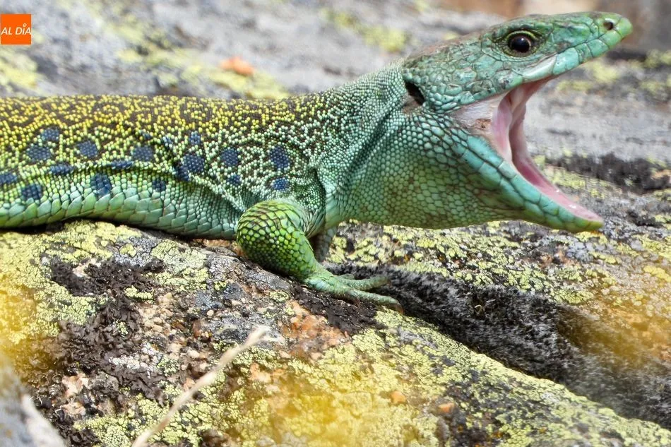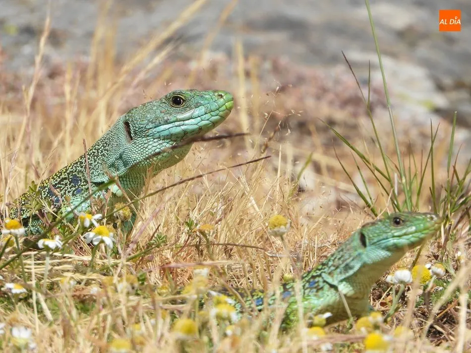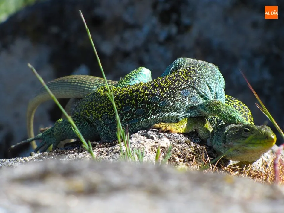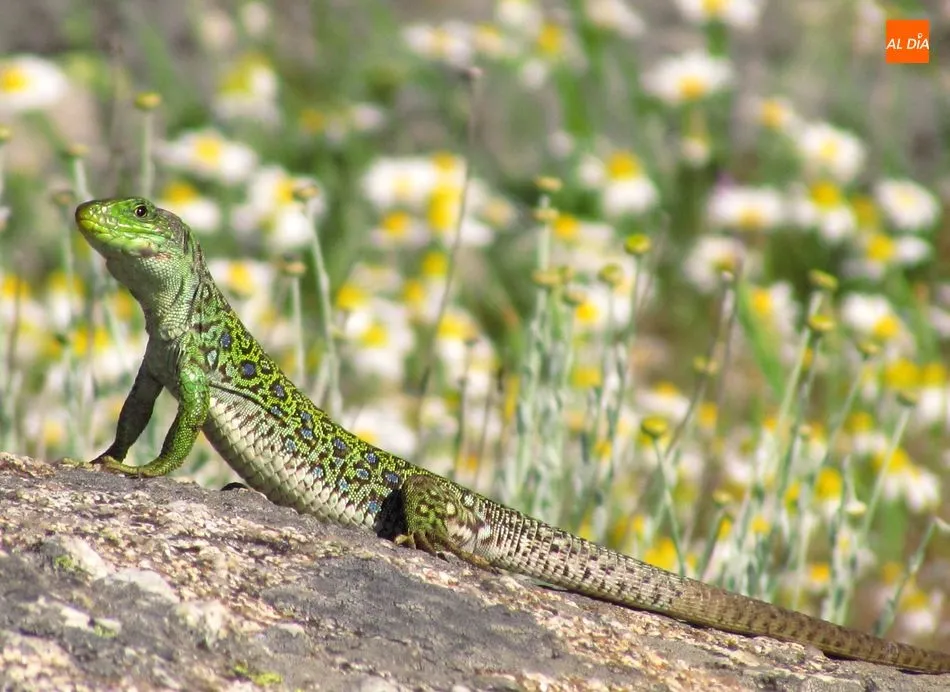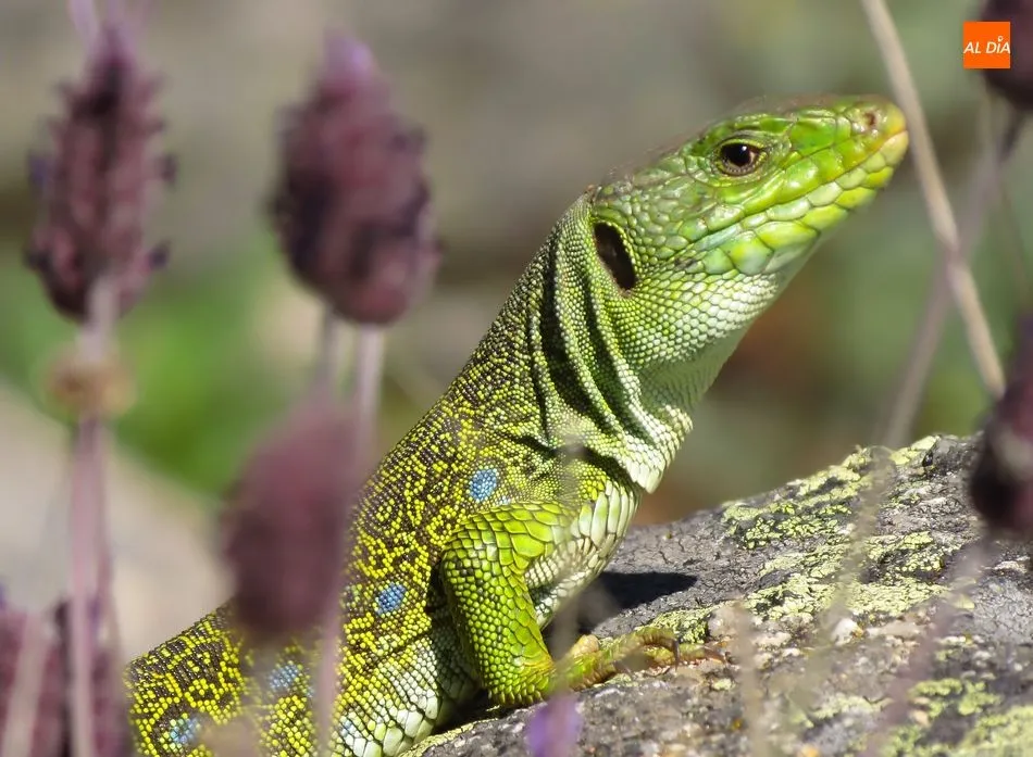 En Béjar tenemos el privilegio de tener al lado de casa unos saurios de 70 cm de longitud y la posibilidad de admirarlos. Su nombre le viene de las dos franjas de ojos azules que lucen en el dorso de su cuerpo, unos ocelos que parecen estar alerta ante la mirada del observador, estas manchas de su piel son más brillantes en el macho, que también es más grande y con un verde más intenso que la hembra, por eso del cortejo...