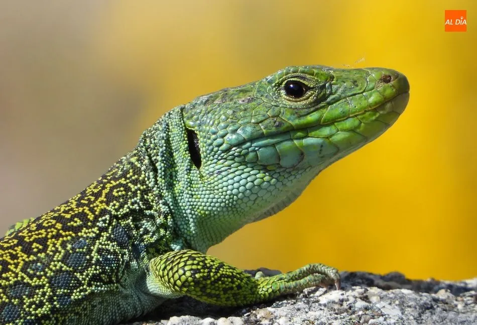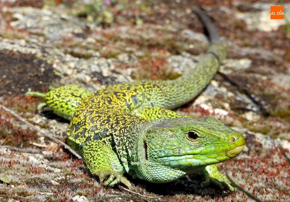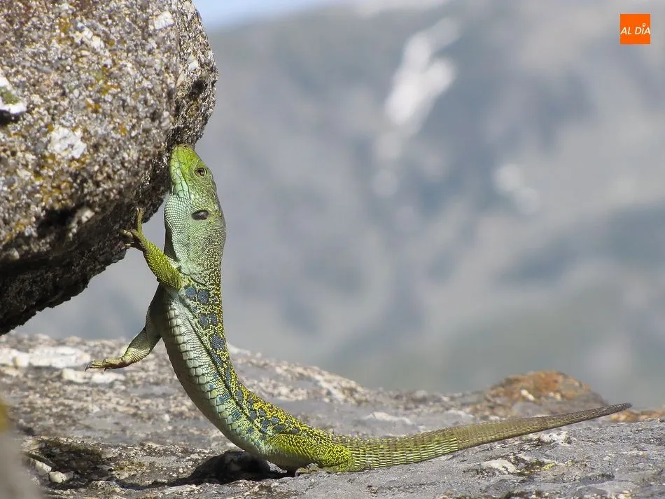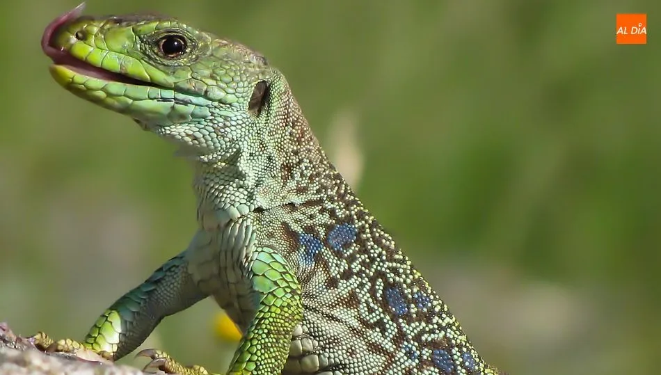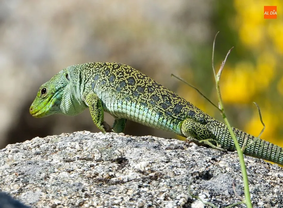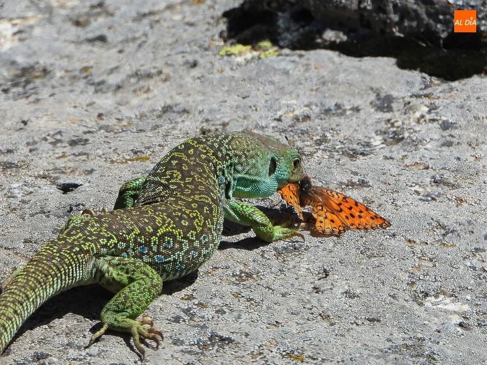 En Béjar tenemos el privilegio de tener al lado de casa unos saurios de 70 cm de longitud y la posibilidad de admirarlos. Su nombre le viene de las dos franjas de ojos azules que lucen en el dorso de su cuerpo, unos ocelos que parecen estar alerta ante la mirada del observador, estas manchas de su piel son más brillantes en el macho, que también es más grande y con un verde más intenso que la hembra, por eso del cortejo...