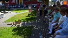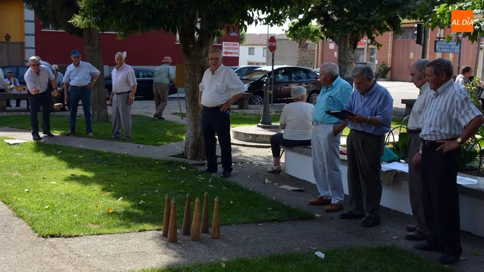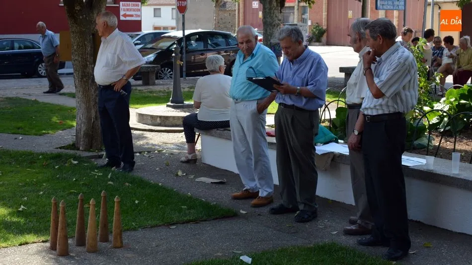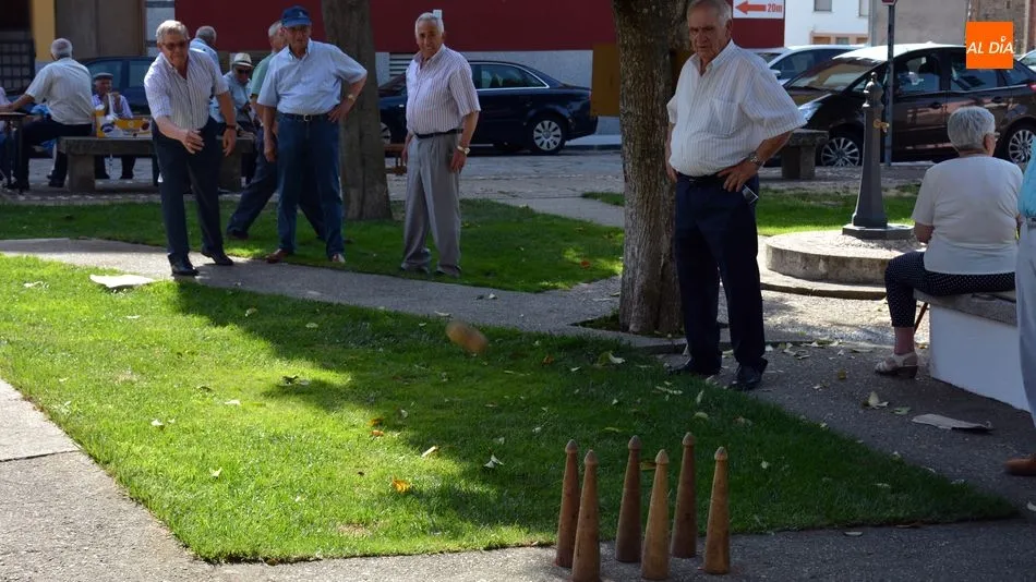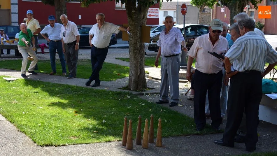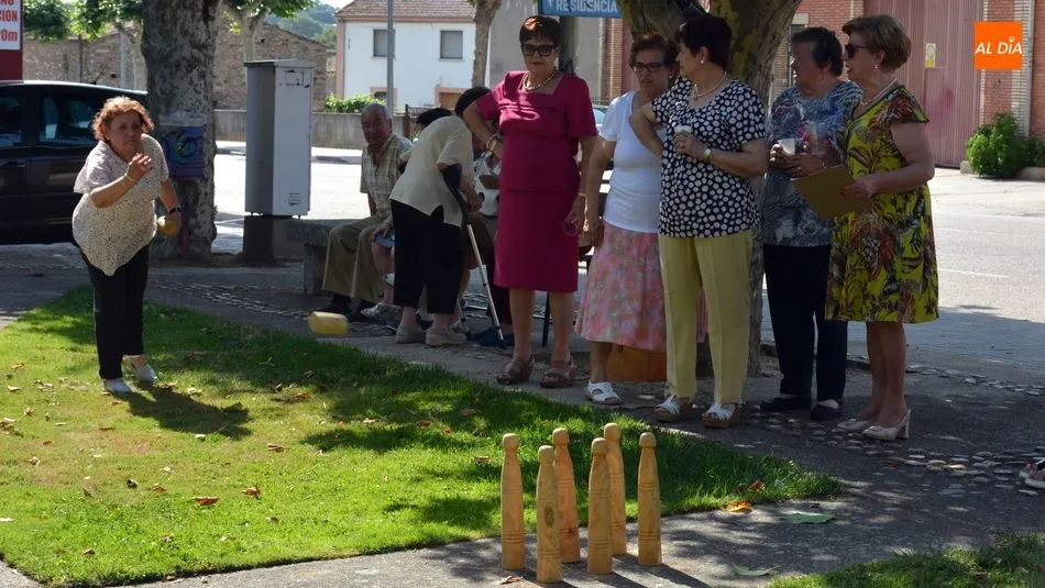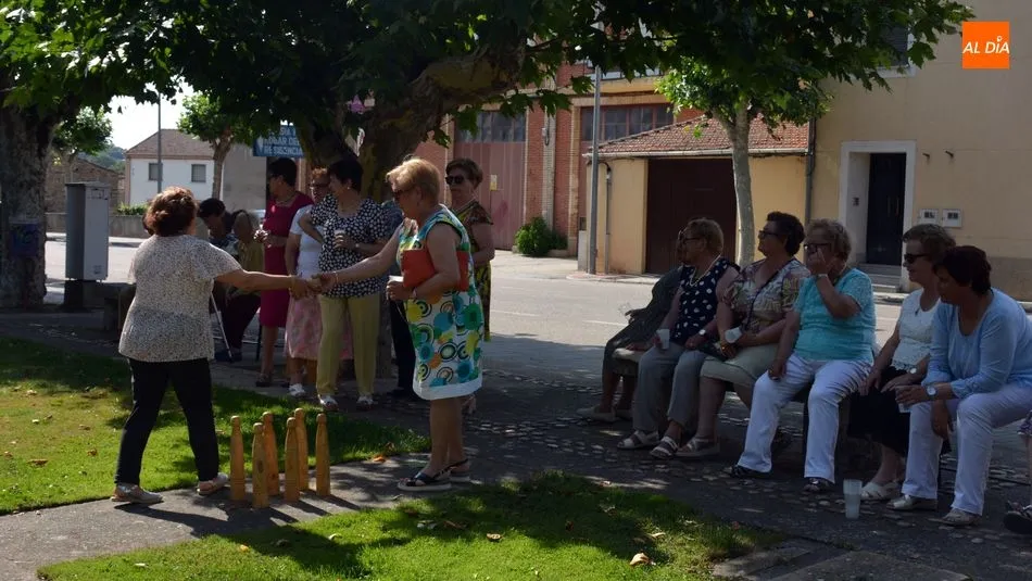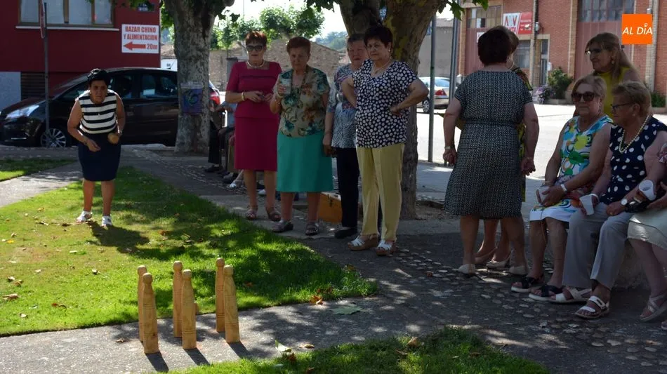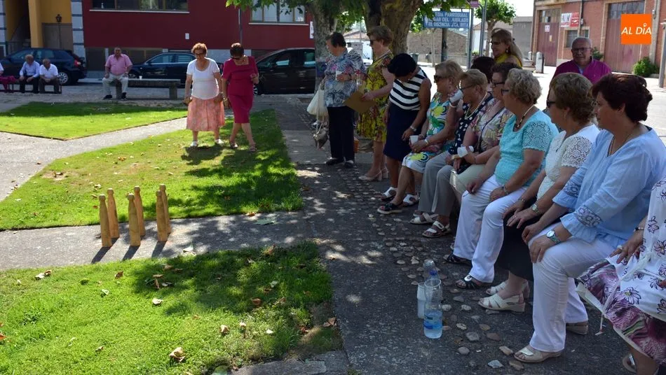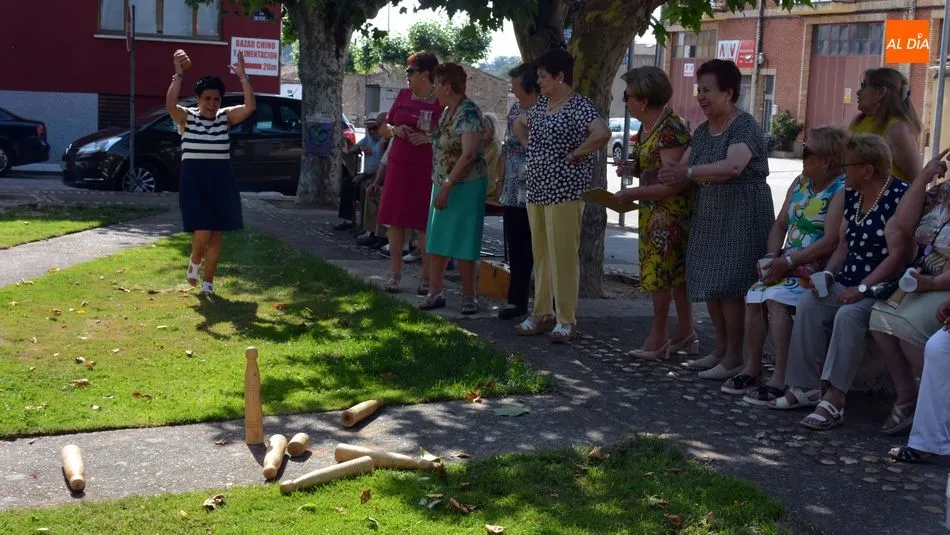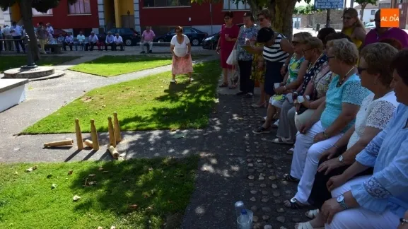 Después de la comida y de los postres con canciones populares, muchos de los asistentes a la fiesta regresaron al parque para disfrutar con los tradicionales juegos de los bolos y la rana, mientras que otros se reunían en el hogar del jubilado huyendo del intenso calor. Mujeres y hombres participaron en sendas competiciones de bolos, que estuvieron muy disputadas. Y un nutrido grupo de hombres demostró su buena puntería jugando a la rana.
