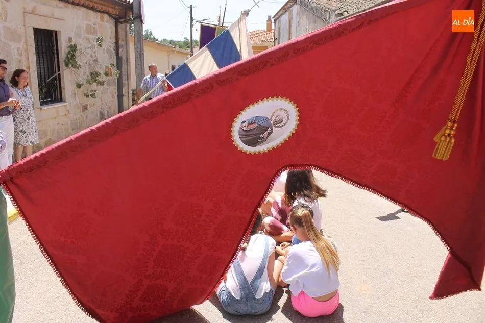 Más de 430 euros en la subasta de seis pendones y estandartes, previa a la procesión en la que las imágenes de San Pedro y la Virgen pasan por encima de los niños para recibir su protección