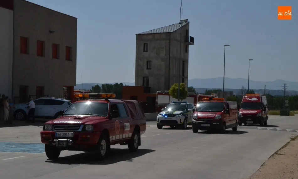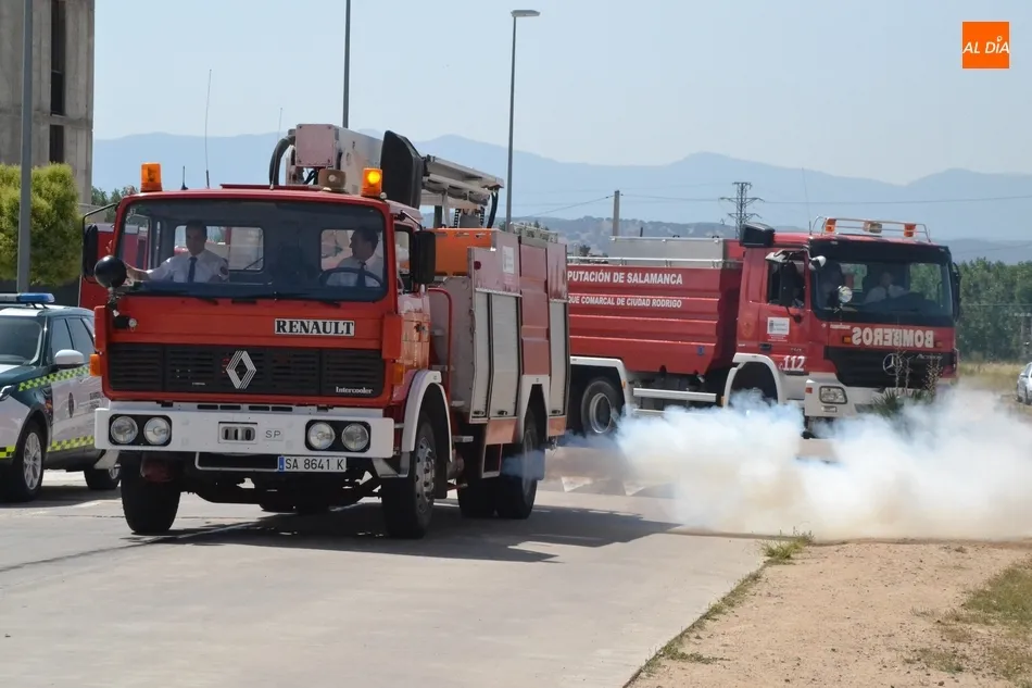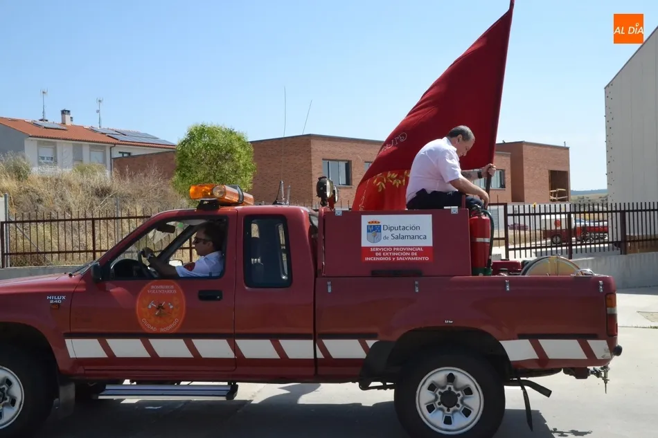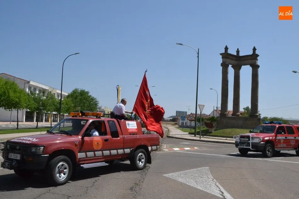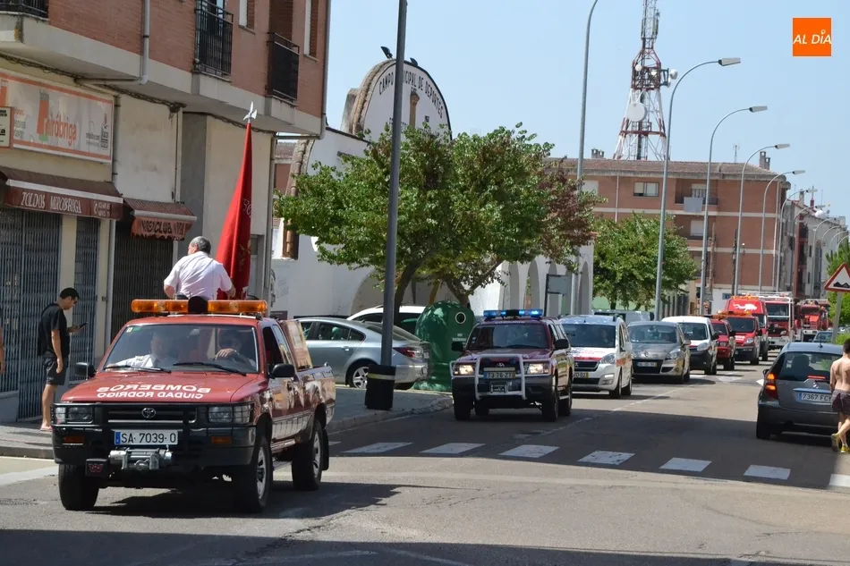 Tras realizarse la plantilla de Bomberos una foto de familia delante de sus vehículos, fue turno para la procesión, encabezada por la Policía Local y un jeep de los Bomberos en el que iba la bandera del Cuerpo. Tras ellos desfilaron los vehículos de los Bomberos foráneos, los del Cuerpo mirobrigense, y para cerrar, un vehículo de la Guardia Civil.
