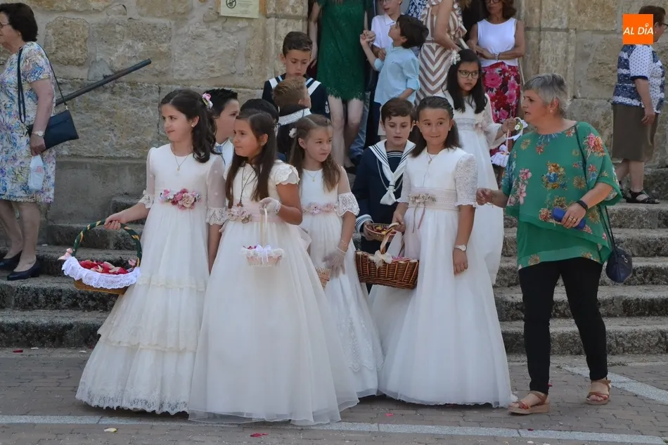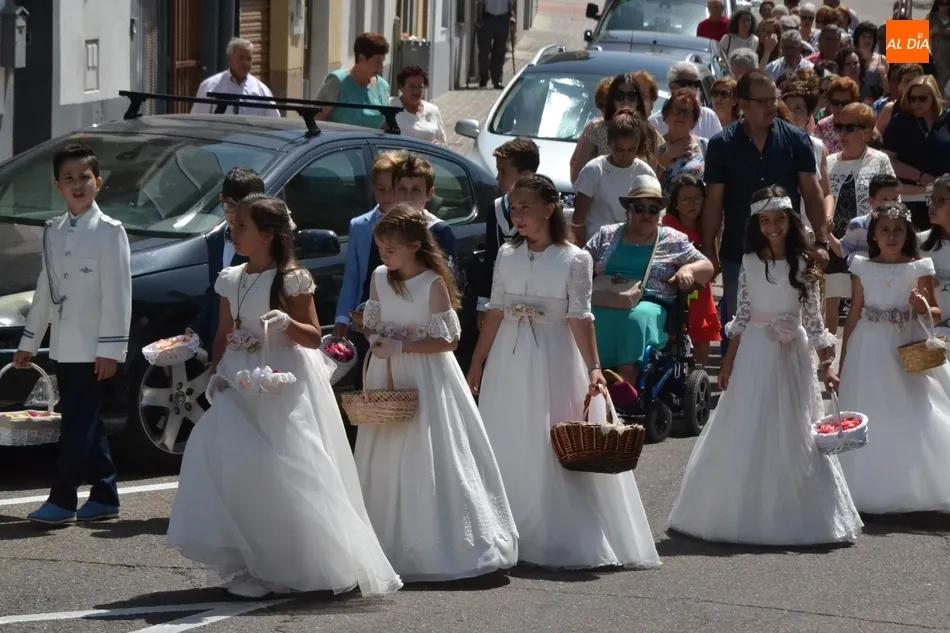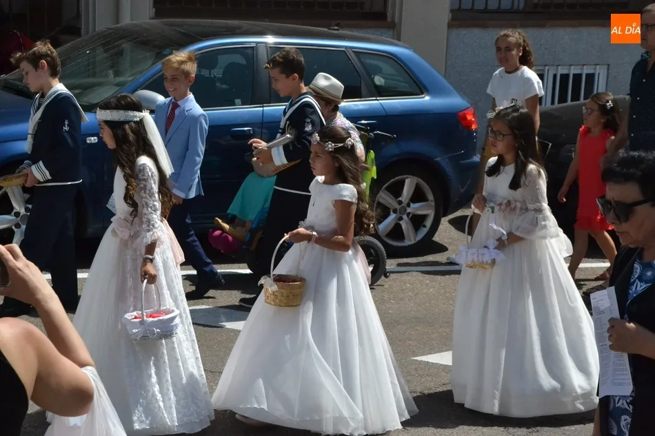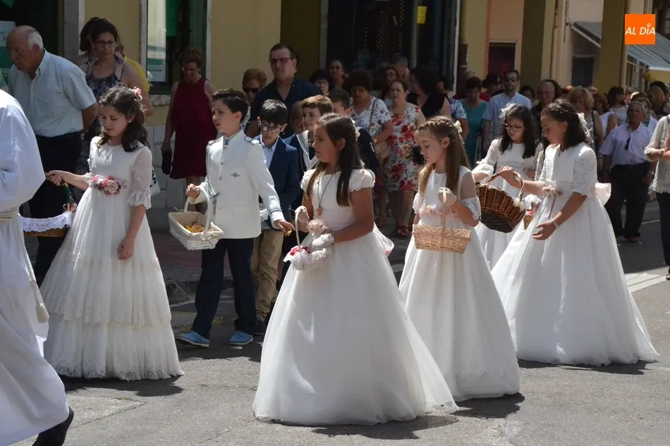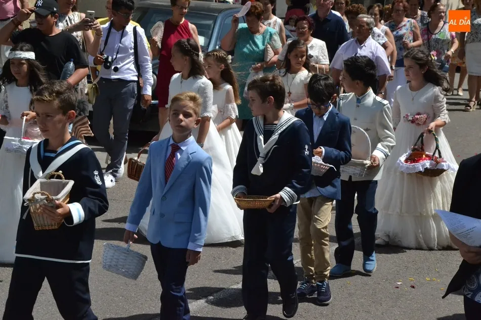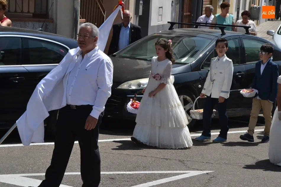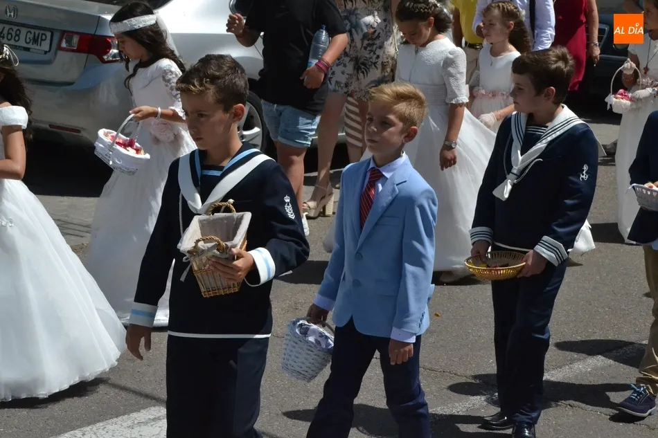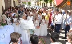 En esos actos, participaron una docena de niños que han tomado la Primera Comunión esta primavera en esa Parroquia, siendo protagonistas especiales en la procesión, desfilando repartidos en un par de filas unos metros por delante del Santísimo, que procesionó bajo palio portado por el sacerdote Domingo Peinado, que está colaborando con esta Parroquia tras su jubilación como párroco de Santa Marina.