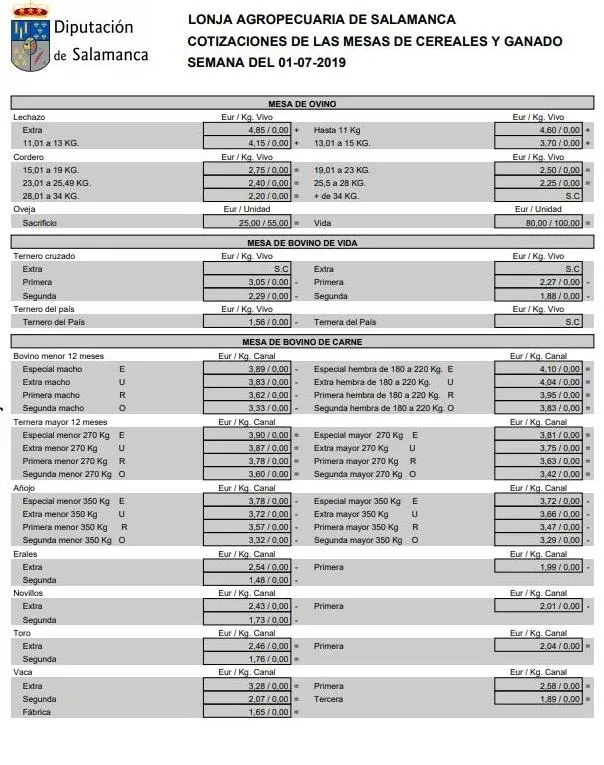 | Vaca | Extra | 3,28 / 0,00 | 3,28 / 0,00 | 0,00 | Eur / Kg. Canal | ![]() | 01-07-2019 |