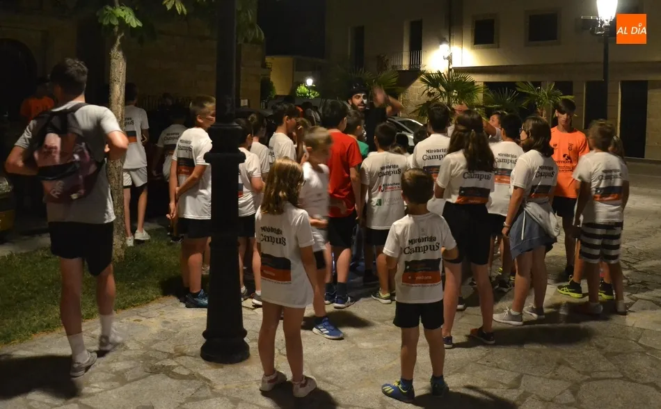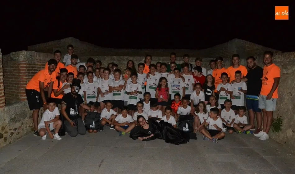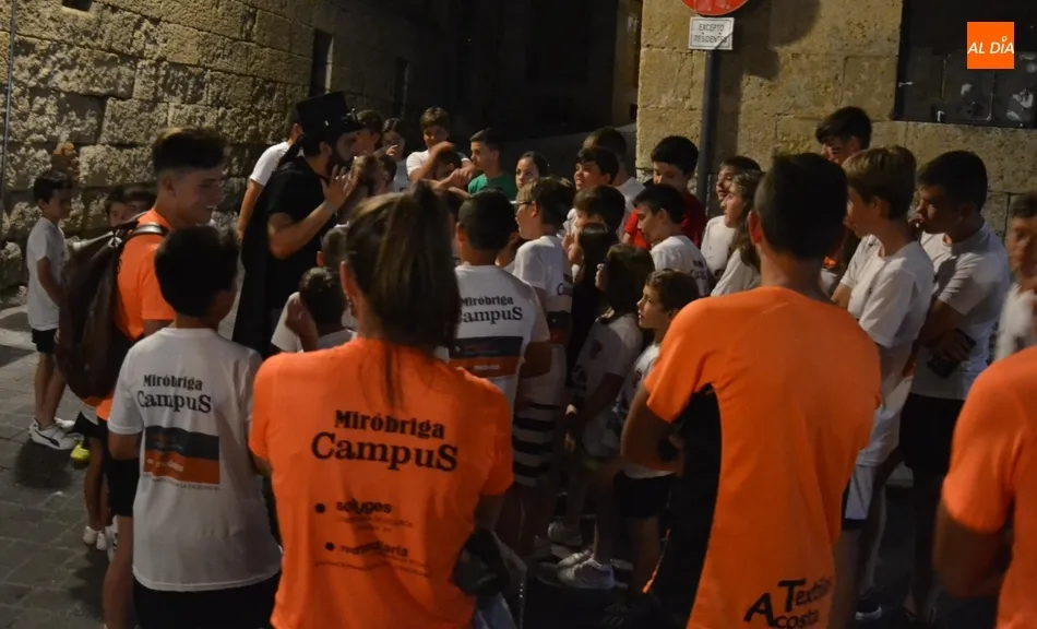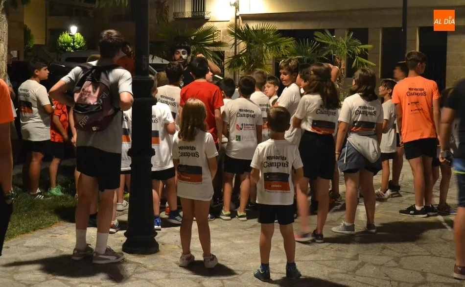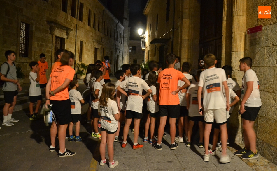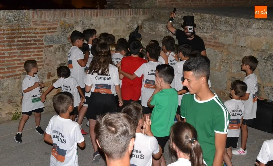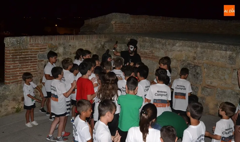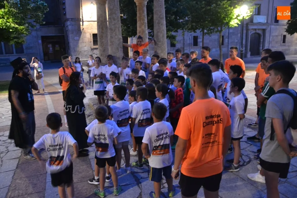 El Miróbriga Campus que promueven los jugadores del Ciudad Rodrigo CF Gabri de Aller y David Risueño tuvo en la noche del miércoles la primera de las actividades nocturnas de esta edición, que reunió a todos los chavales inscritos esta semana, así como a sus monitores, en el centro histórico para disfrutar de una versión especial de la popular Ruta de los Malditos.