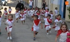 Tras ello, llegó el momento de llevar a cabo unas cuantas carreras delante de su propio toro, en las cuales no faltaron las caídas e incluso una pequeña ?montonera? que provocó algunas lágrimas que no pasaron a mayores. Finalizado el encierro, y tras cantar de nuevo al Santo, los alumnos (perfectamente ataviados para la ocasión con vestimenta blanca, pañuelo rojo, fajín rojo, y el periódico enrollado) degustaron unas galletas en la calle antes de retornar a la Escuela.