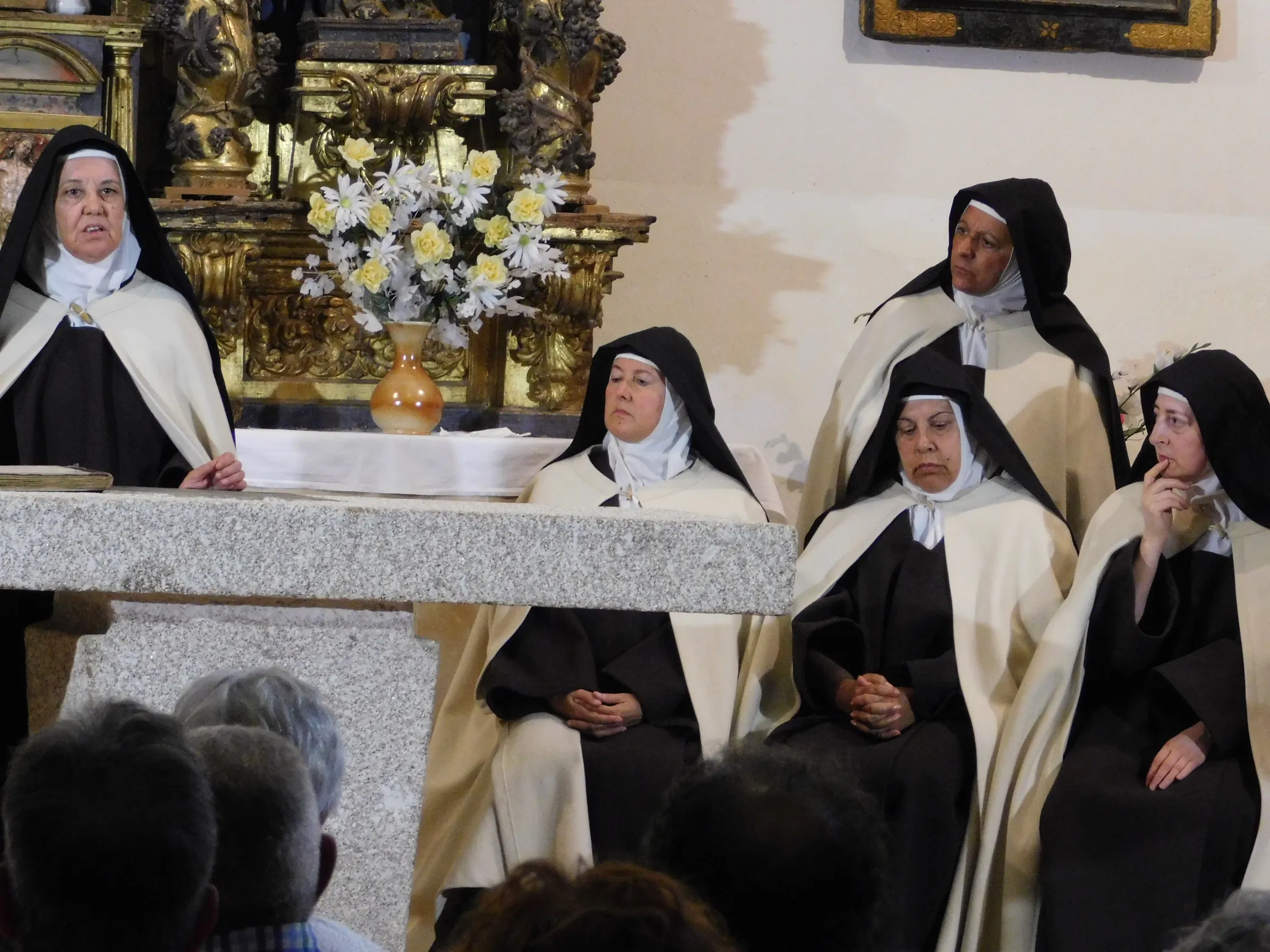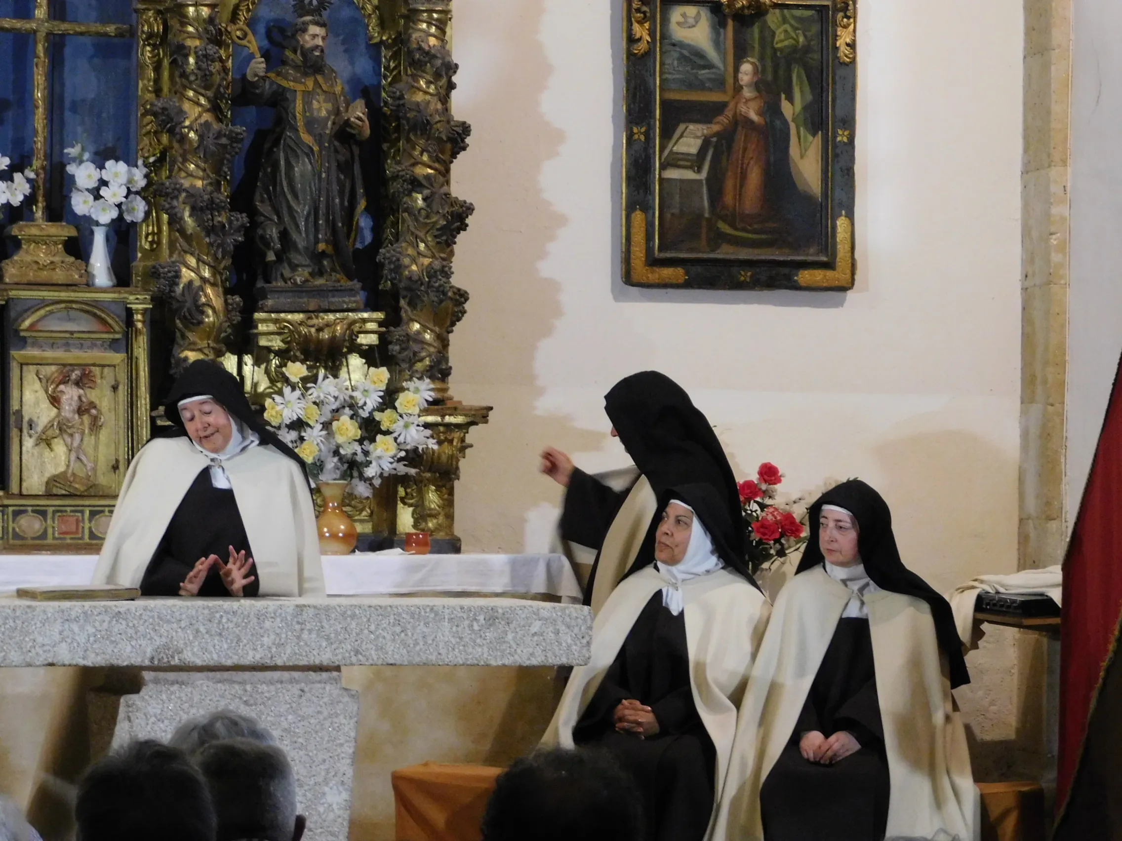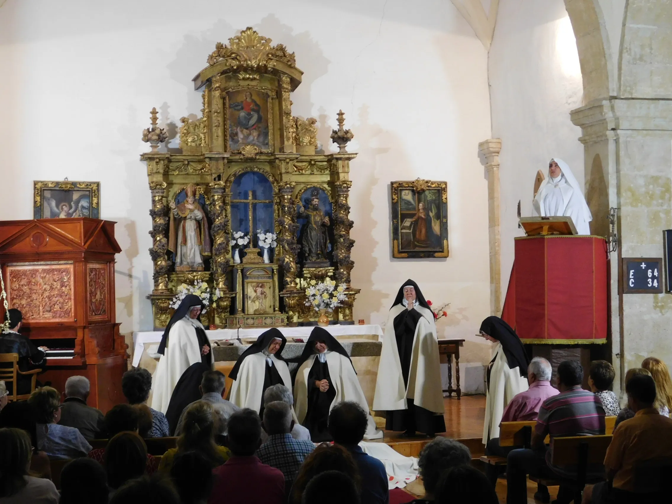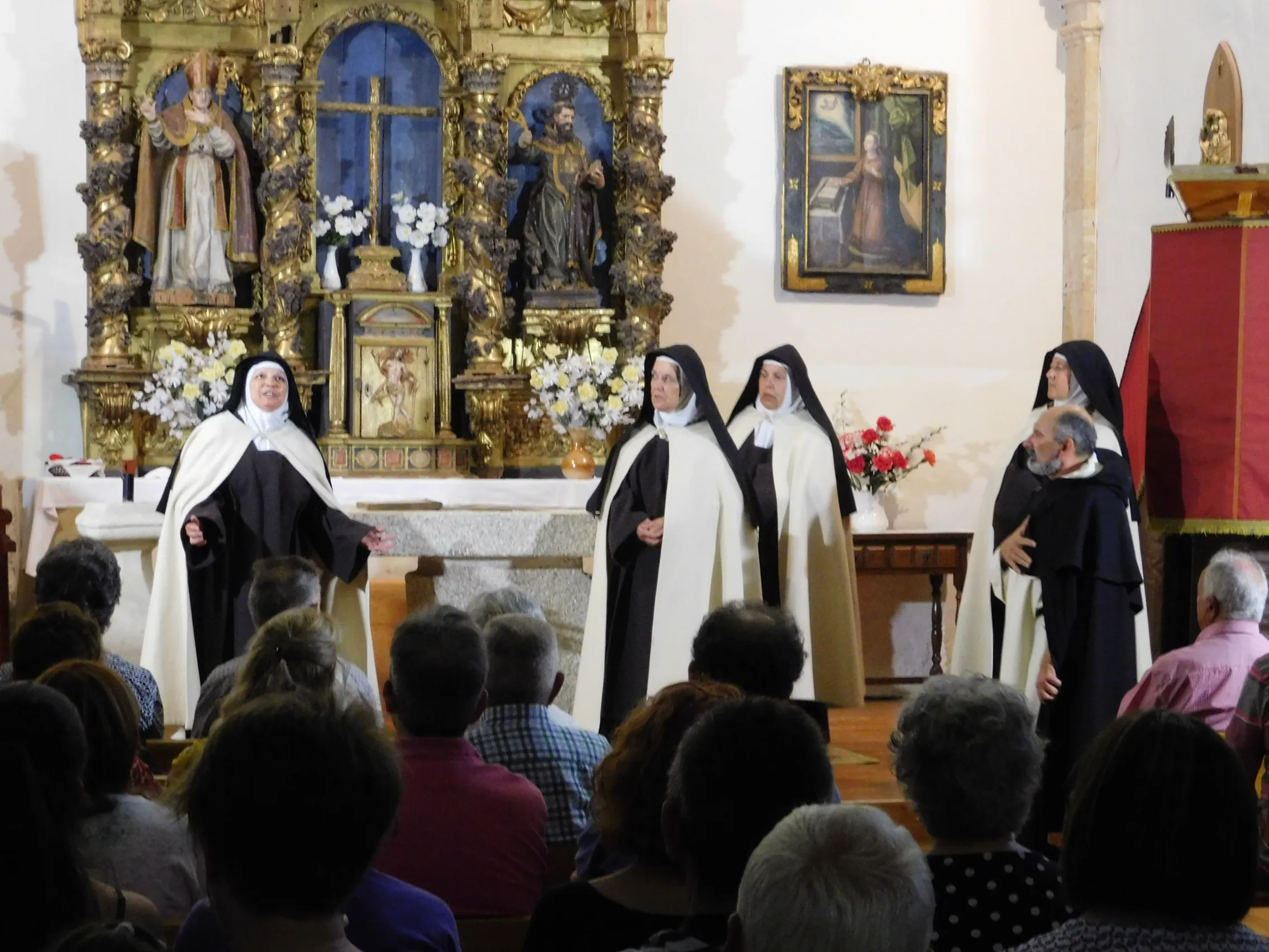 El auténtico a la vez que valioso retablo del XVI, que preside el Altar Mayor de la iglesia de la Exaltación de la Cruz de Parada de Arriba acompaña en su cronología a la vida que se nos cuenta en escena. Hasta él han llegado un grupo de monjas bien reconocibles en sus hábitos de estameña de la época que viven, y que llegan hasta el convento de Alba de Tormes para acompañar a su madre en su hora final. Antes, sorprendidas por la voz inquisitorial que les llega desde un púlpito, reclamando la presencia de la moribunda, deben blindarse ante un padre dominico que demanda sus respuestas, que puedan incriminar a la mujer que les ha enseñado a ser libres. No hay nada que defender. Diálogos frescos, irónicos, valientes, acompañados por la bella obra lírica de la madre, sus cartas, su vida fundacional dedicada a ellas, acaban con un cuadro que nada bueno augura en sus comienzos. La libertad y entrega de una mujer libre y entregada a todos y por todos, arranca al cabo de una hora la ovación de unos espectadores, que vuelven a ser conscientes de lo vivido en su parroquia de Parada de Arriba, que se había convertido para ellos en el convento albense, donde Teresa vivió sus últimos momentos. Despiden así, una vez más a unas carmelitas que vuelven a su túnel del tiempo, universal gracias a su maestra, seguros de que irán a reposar sus cansados pies en la cercana fuente de Piedra, que aunque construida en el XIX, se hará también intemporal para ellas como Teresa. La música genial de un órgano tocado por las manos geniales de un músico renacentista, queda flotando hasta la próxima vez.