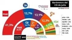 En el sondeo de julio, el PSOE se anota un voto directo sobre el voto emitido del 41,3%, 1,8 puntos más que el mes anterior, anotándose así un nuevo récord de voto socialista. Según la encuesta, los de Pedro Sánchez obtendrían ahora 12,52 puntos más del 28,68% de apoyo que lograron en las elecciones del pasado 28 de abril.