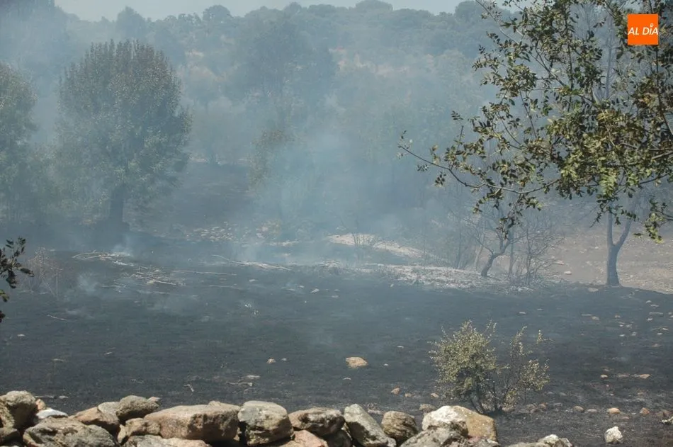 Bomberos de Vitigudino, los helicópteros de Guadramiro y el Bodón y otros medios terrestres trabajan para sofocar un violento incendio en el término municipal de Bogajo, concretamente en la conocida finca El Zancao. El fuego, que se inició a las 13.38 horas, ha arrasado 15 hectáreas, de ellas 14 de pasto, según recoge el parte emitido por la Junta de Castilla y León.