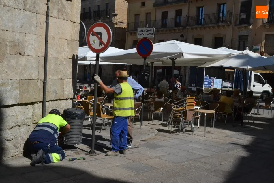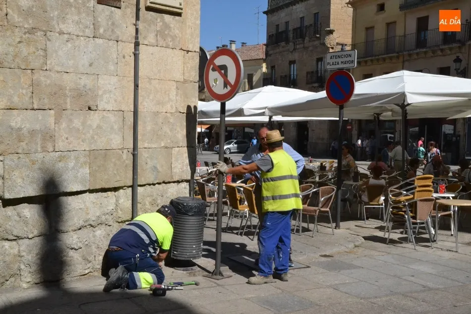 Para recordar a todos los conductores estas prohibiciones de giros en la Plaza Mayor, operarios municipales estuvieron instalando durante la mañana del jueves las correspondientes señales de tráfico a la entrada a la Plaza por Julián Sánchez y la calle San Juan.