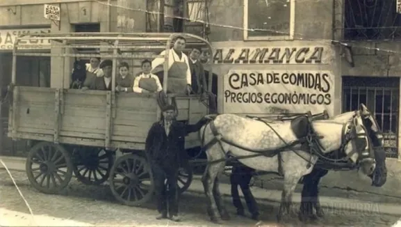 La fotografía adjunta muestra una de ellas. Como si de un gran hotel se tratara, podemos ver a los trabajadores de la Casa de Comidas Bailón posar ante el fotógrafo subidos en un carretón de carga.