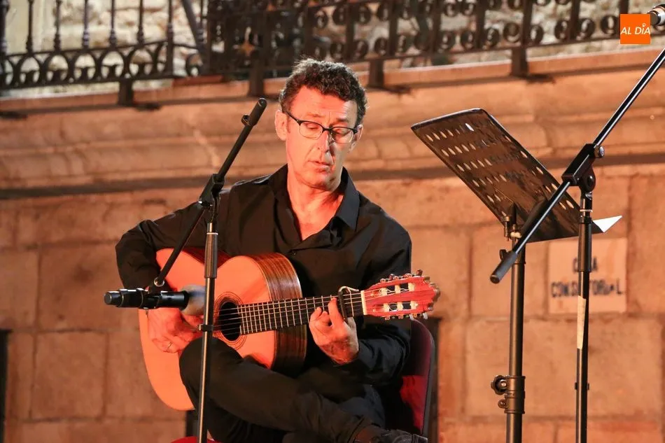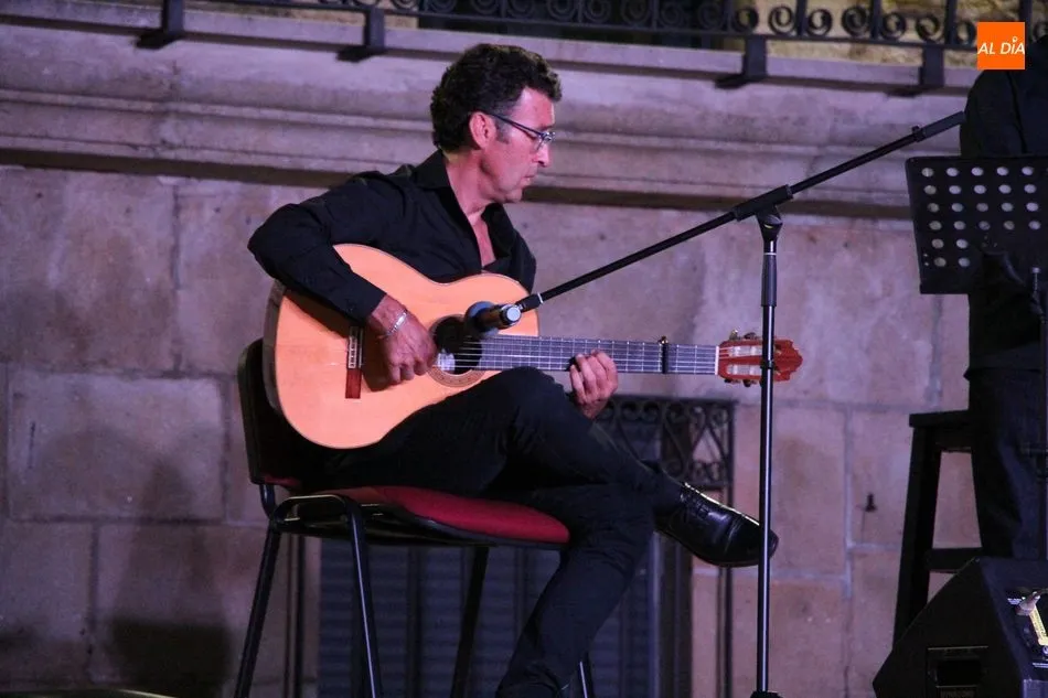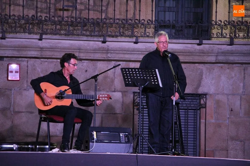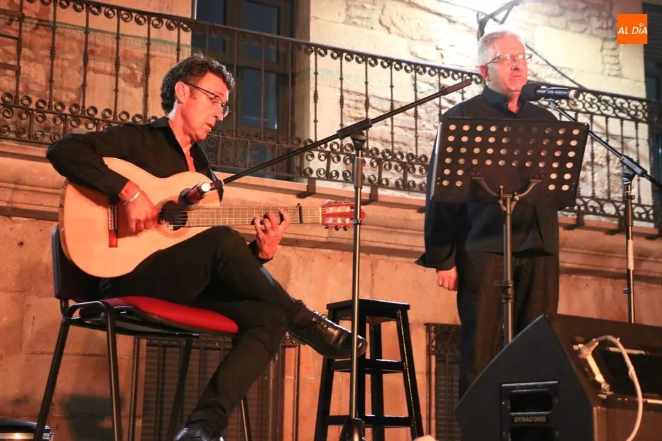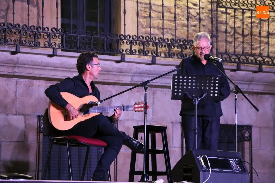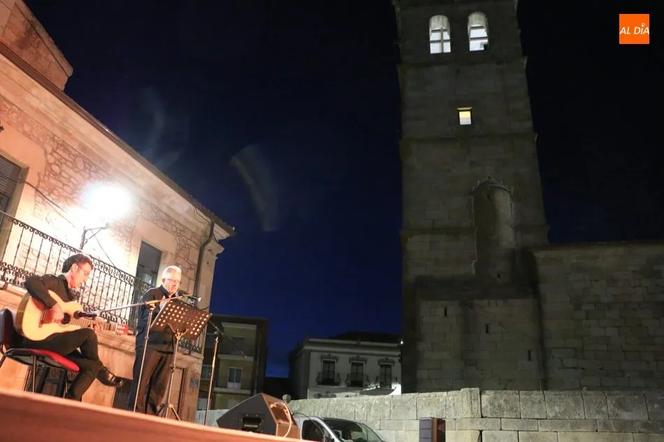 Una bella mirada a la poesía de siempre bajo los acordes de la guitarra española en un marco como la Plaza de España y con ?Petrus?, la torre de la iglesia, de centinela.