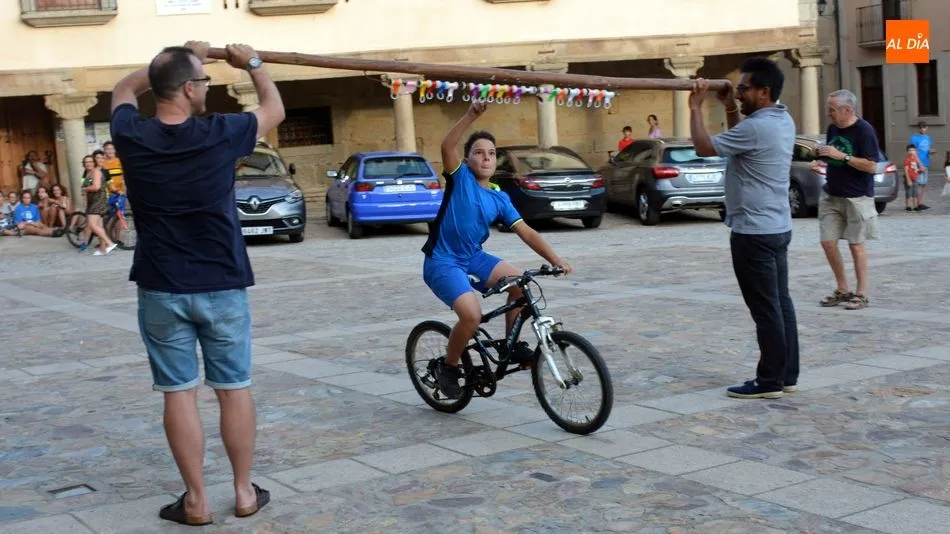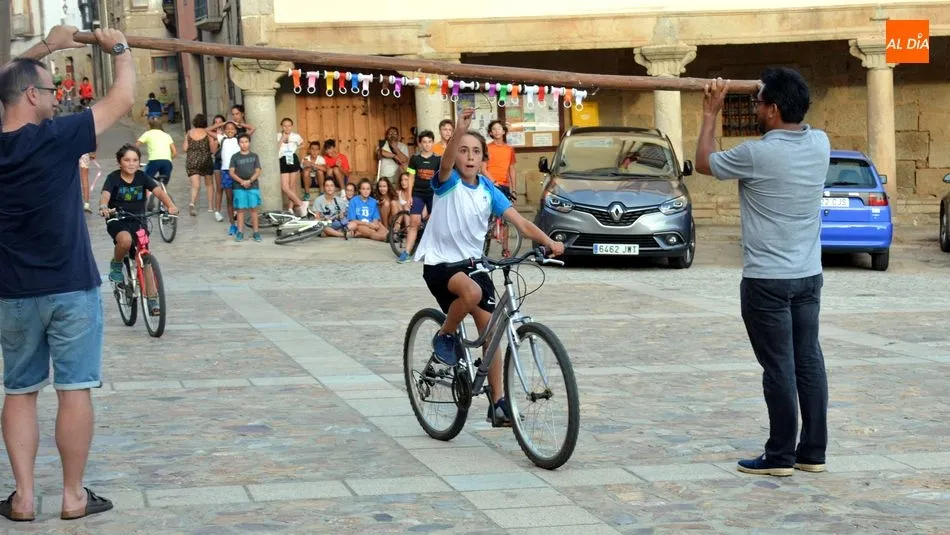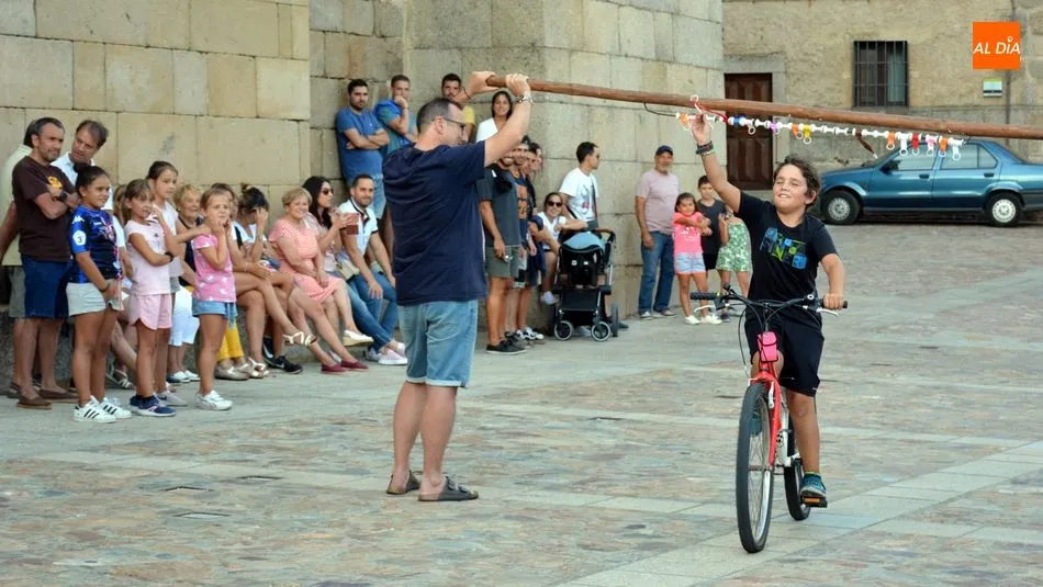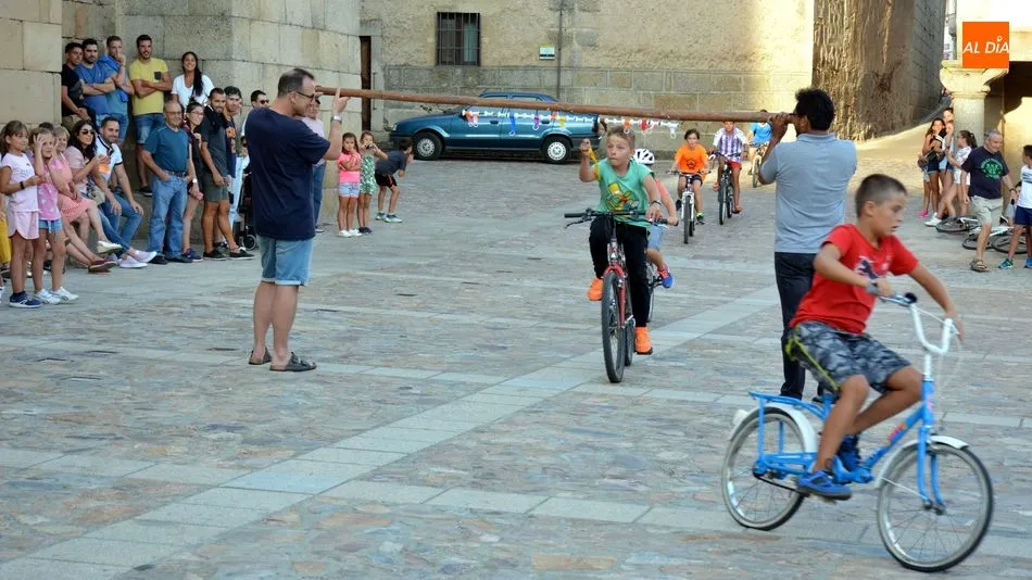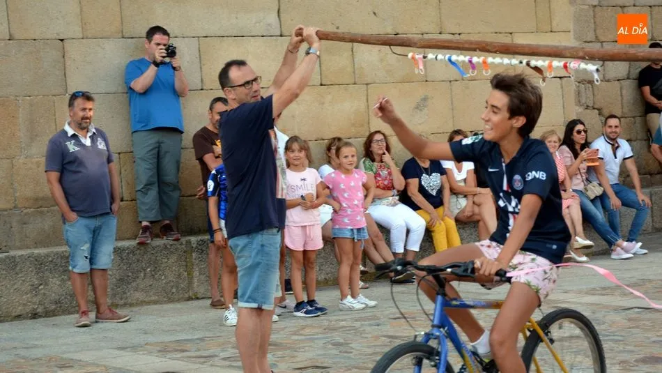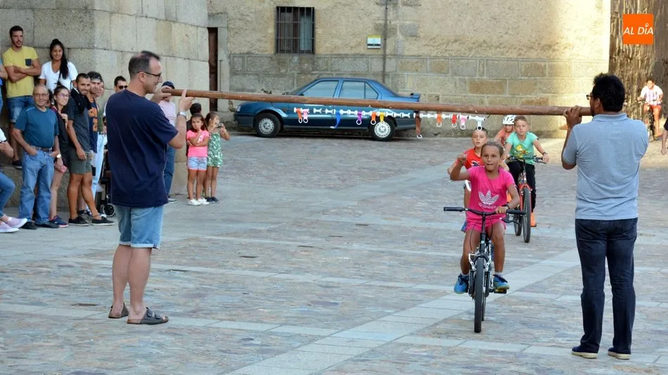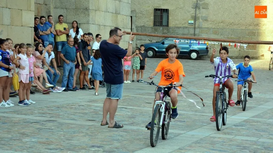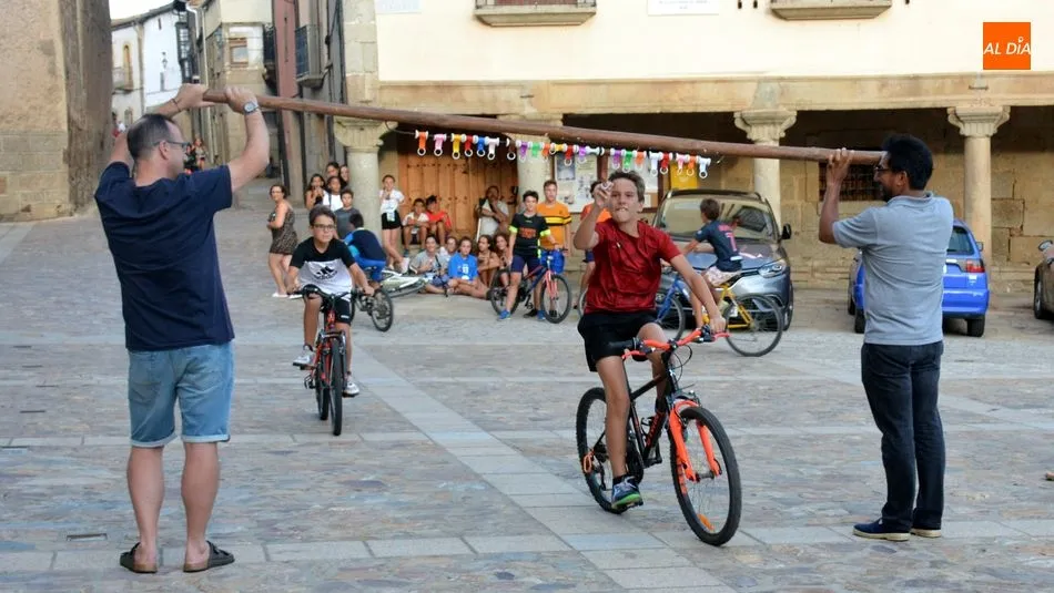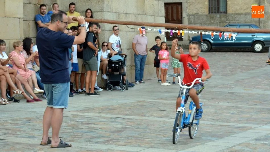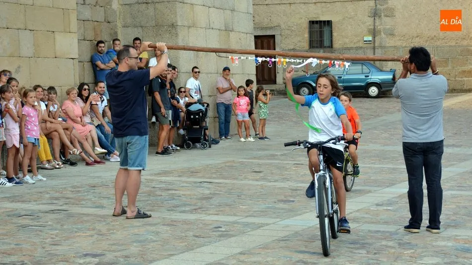 La Plaza de España de San Felices de los Gallegos ha sido escenario la tarde del jueves, 8 de agosto, del tradicional juego de la carrera de cintas, una divertida competición que durante muchos años protagonizaban los Quintos de cada año el Domingo de Resurrección. Los corredores que participaron en el espectáculo eran mucho más jóvenes que los Quintos de entonces y los burros fueron sustituidos por bicicletas. Los niños del pueblo y los muchos pequeños que pasan sus vacaciones en la villa de San Felices se divirtieron intentando coger las cintas que colgaban de un palo, que sujetaban dos voluntarios, pasando por debajo montados en sus bicicletas. Las carreras de los pequeños y sobre todo los éxitos de los que conseguían coger una de las cintas al pasar, eran reconocidos por los aplausos de los espectadores, madres, padres, abuelos y muchos vecinos de la villa que no quisieron perderse el espectáculo.