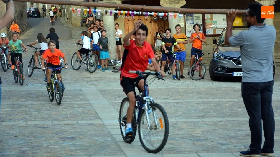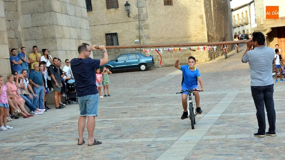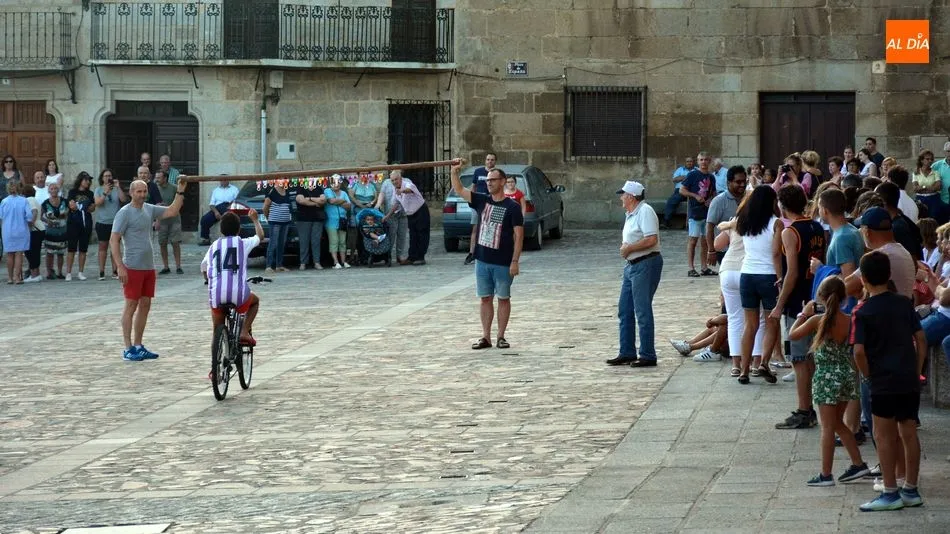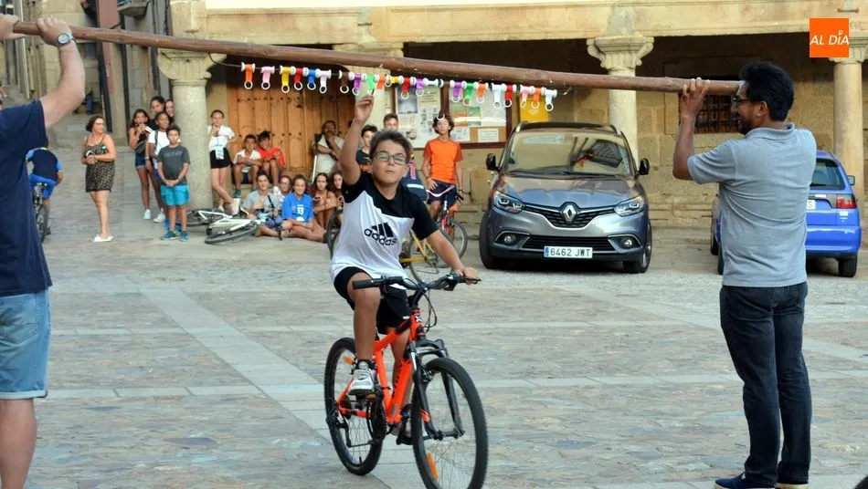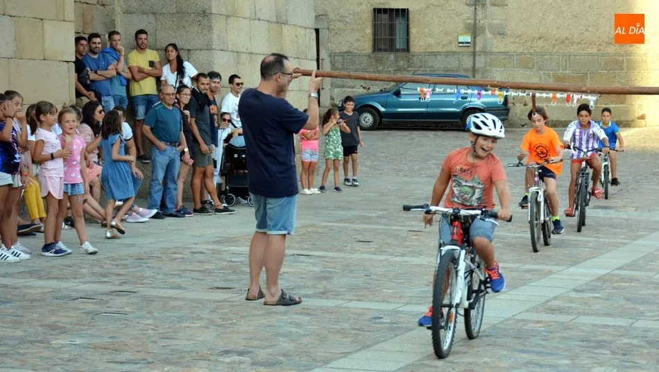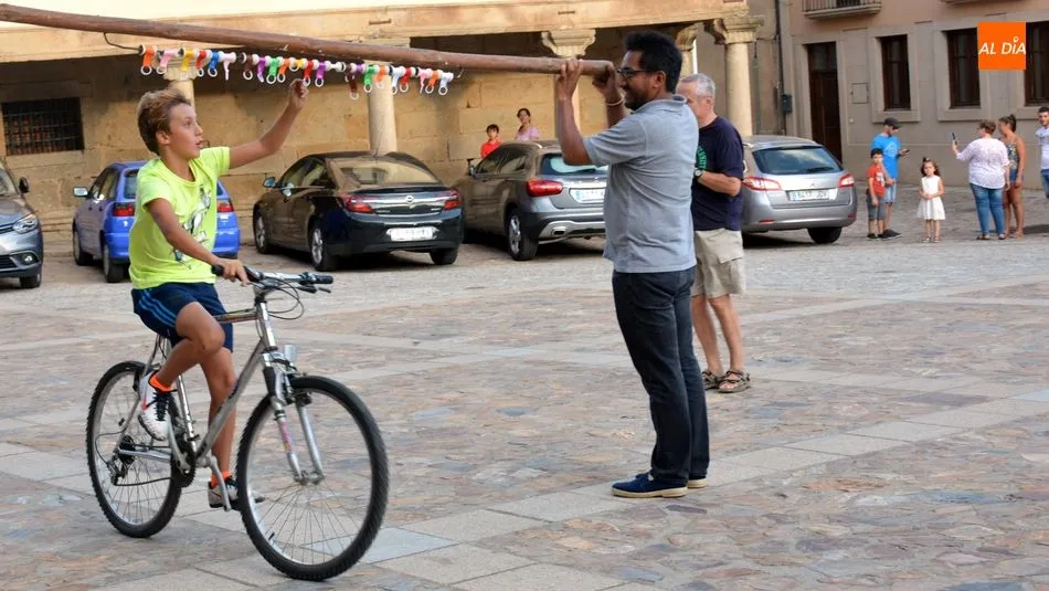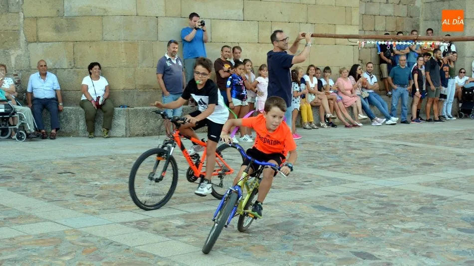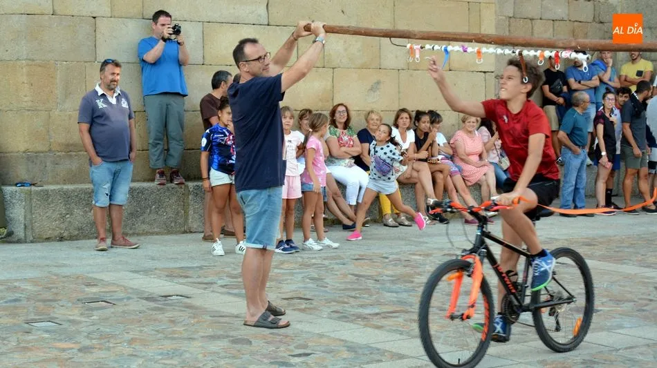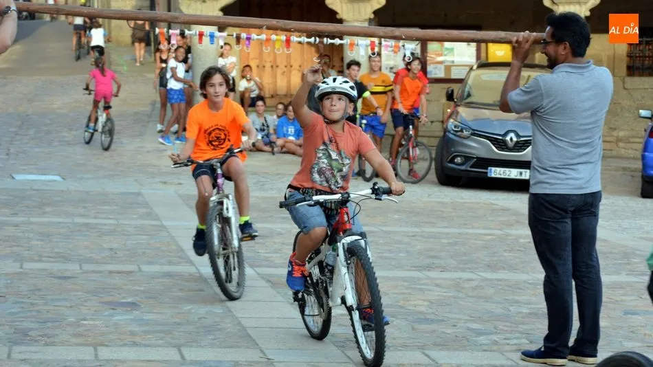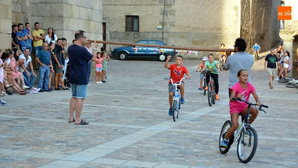 La Plaza de España de San Felices de los Gallegos ha sido escenario la tarde del jueves, 8 de agosto, del tradicional juego de la carrera de cintas, una divertida competición que durante muchos años protagonizaban los Quintos de cada año el Domingo de Resurrección. Los corredores que participaron en el espectáculo eran mucho más jóvenes que los Quintos de entonces y los burros fueron sustituidos por bicicletas. Los niños del pueblo y los muchos pequeños que pasan sus vacaciones en la villa de San Felices se divirtieron intentando coger las cintas que colgaban de un palo, que sujetaban dos voluntarios, pasando por debajo montados en sus bicicletas. Las carreras de los pequeños y sobre todo los éxitos de los que conseguían coger una de las cintas al pasar, eran reconocidos por los aplausos de los espectadores, madres, padres, abuelos y muchos vecinos de la villa que no quisieron perderse el espectáculo.