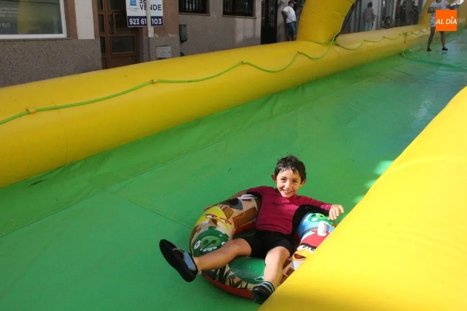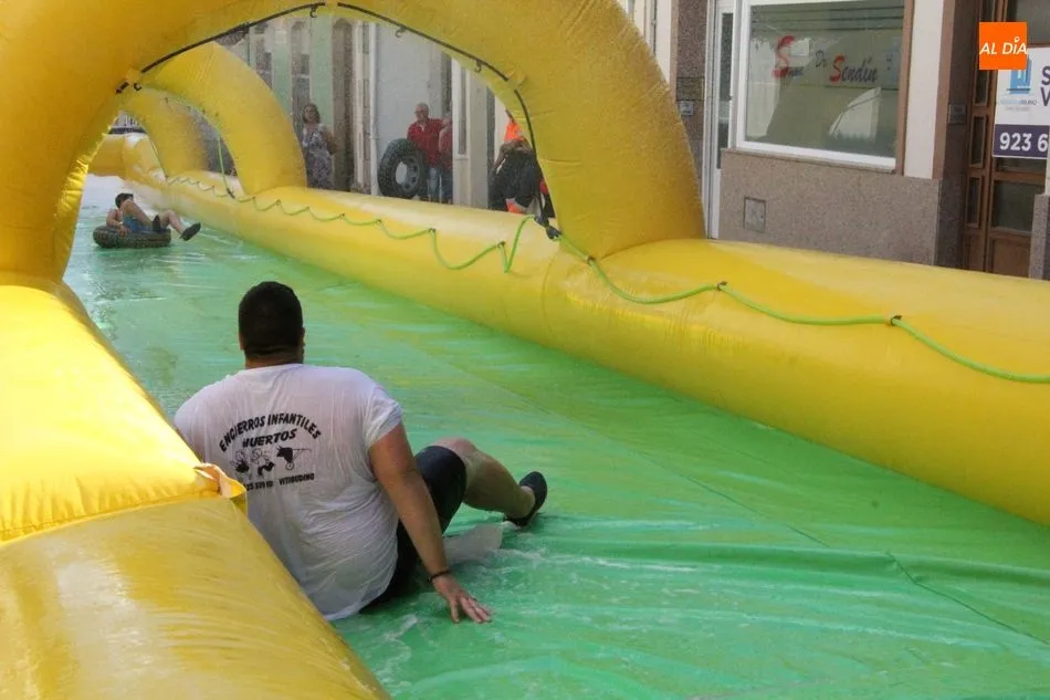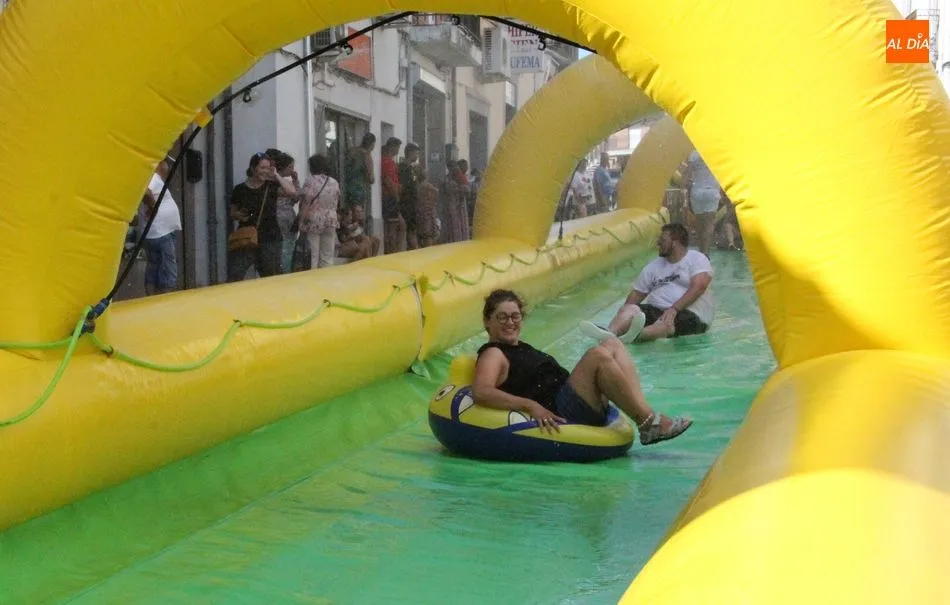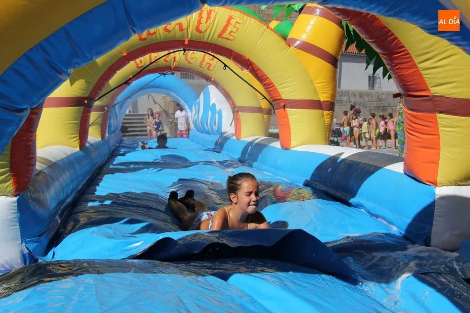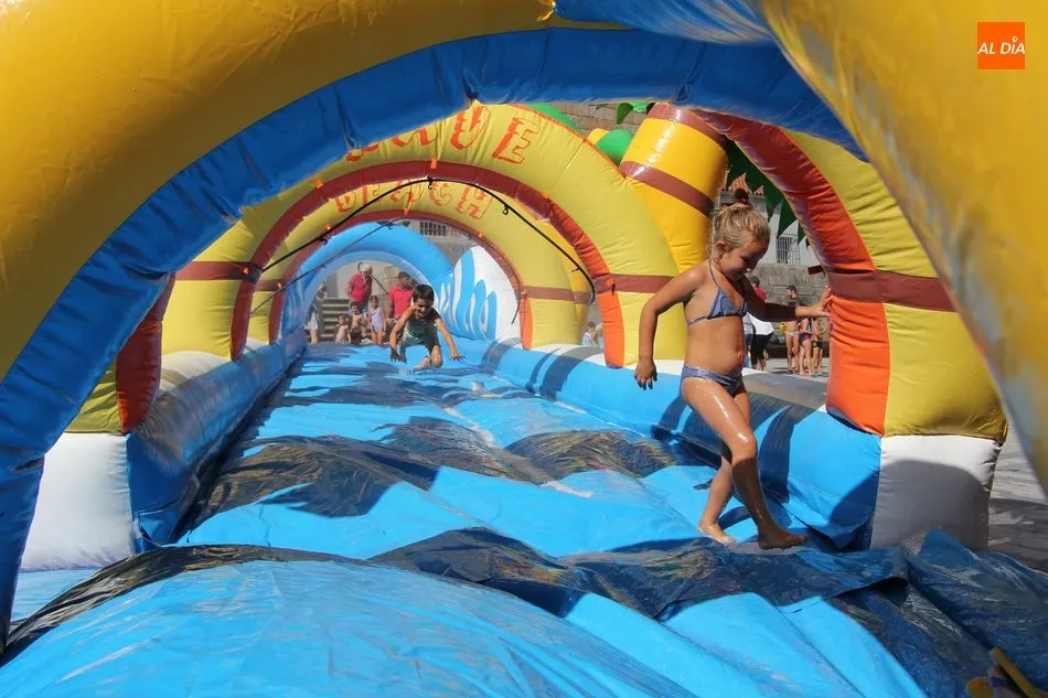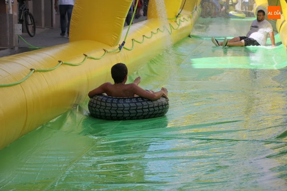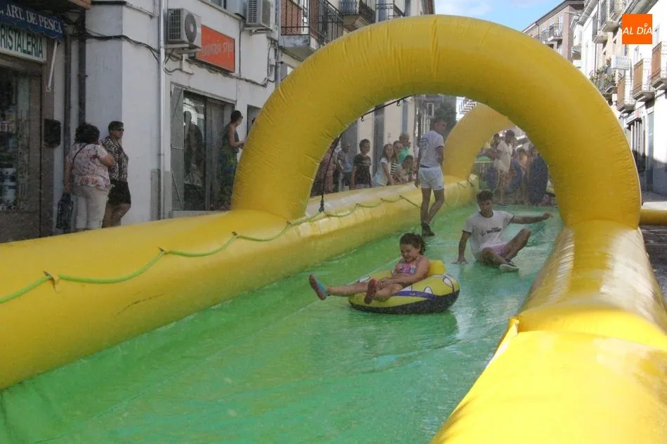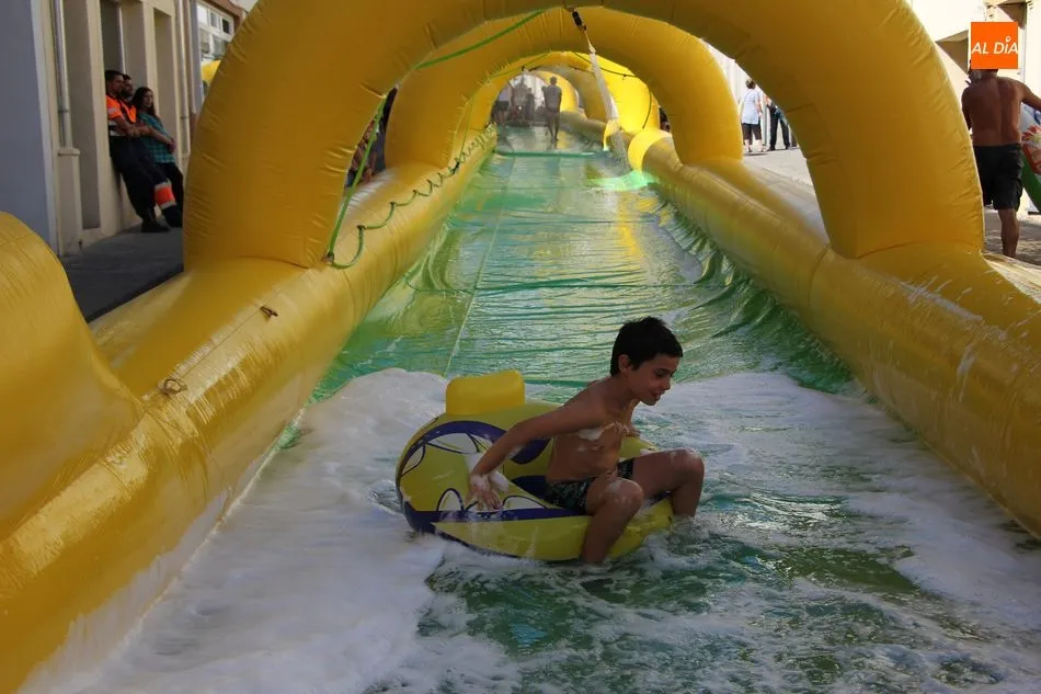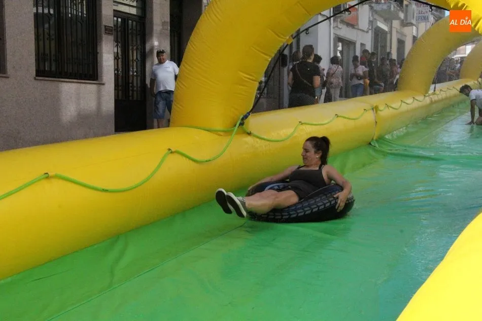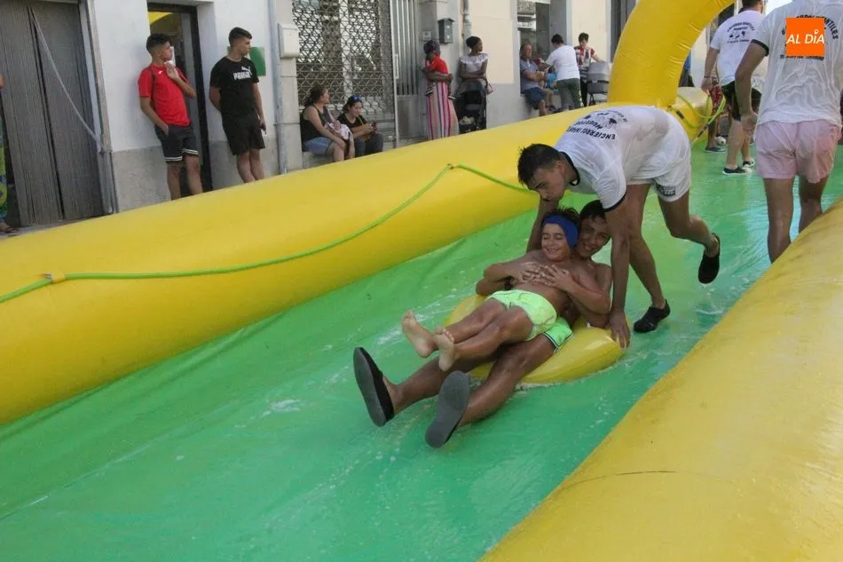 El epicentro de Vitigudino parecía la tarde de este jueves un auténtico parque acuático tras la instalación de dos grande toboganes. La Plaza de España y la calle Santa Ana se convertían en un hervidero de niños dispuestos a disfrutar de una de las atracciones de las Ferias y Fiestas de Vitigudino 2019, aunque algunos mayores también aprovecharon la oportunidad para sentirse niños por unos instantes.