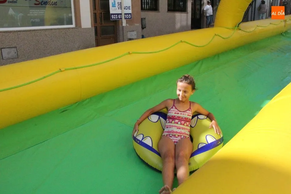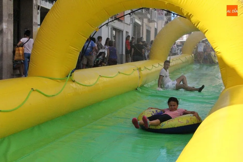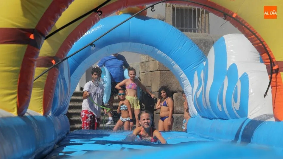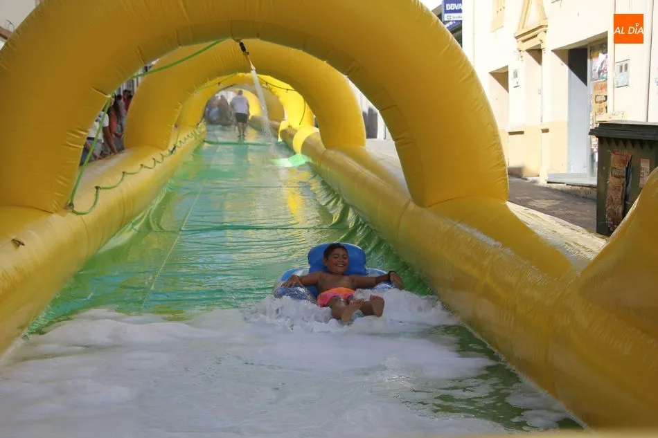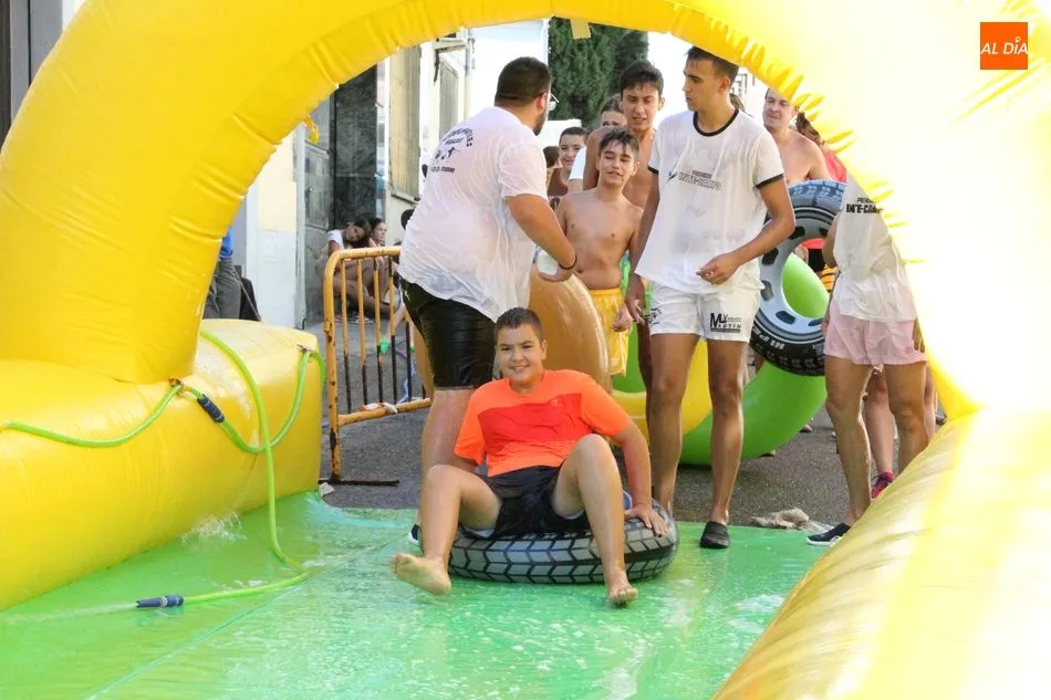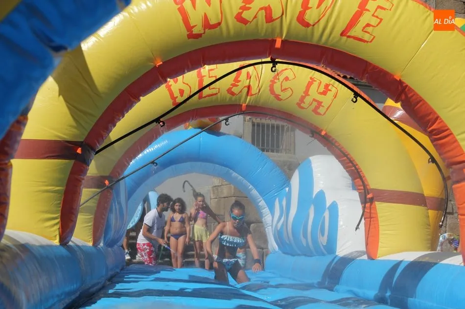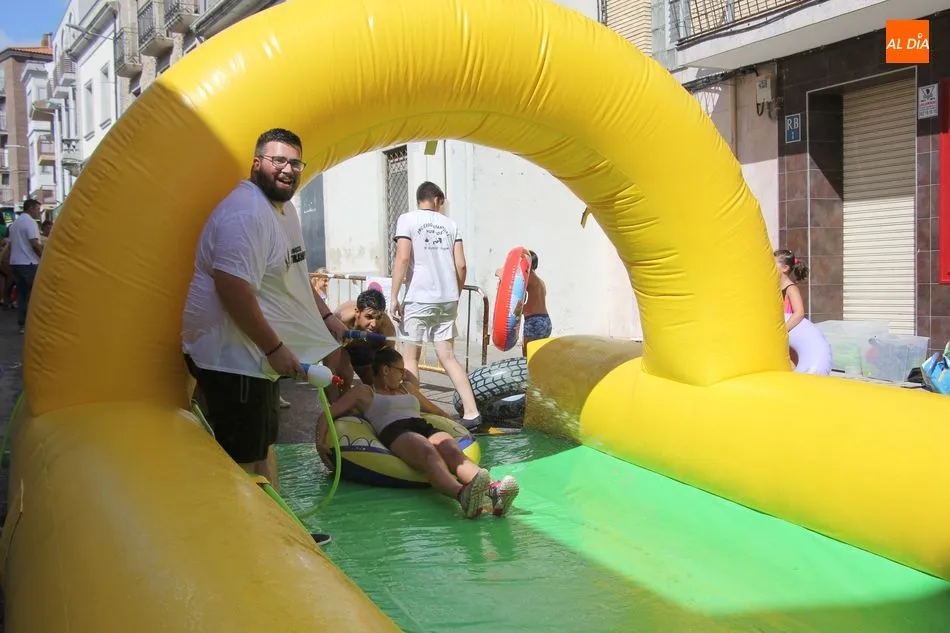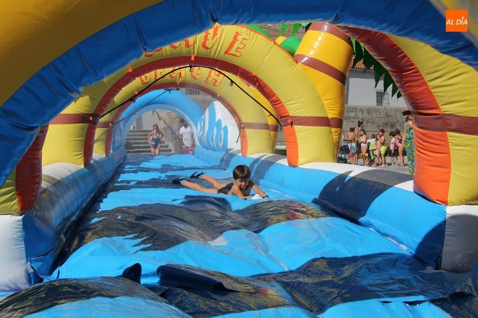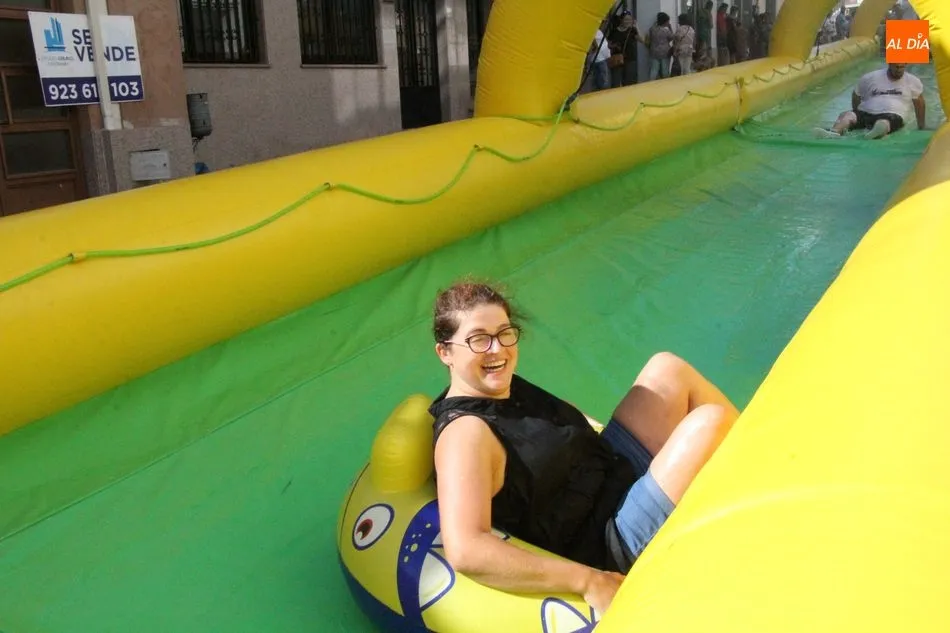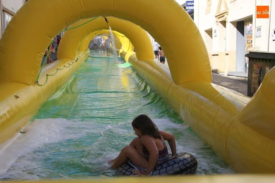 El epicentro de Vitigudino parecía la tarde de este jueves un auténtico parque acuático tras la instalación de dos grande toboganes. La Plaza de España y la calle Santa Ana se convertían en un hervidero de niños dispuestos a disfrutar de una de las atracciones de las Ferias y Fiestas de Vitigudino 2019, aunque algunos mayores también aprovecharon la oportunidad para sentirse niños por unos instantes.