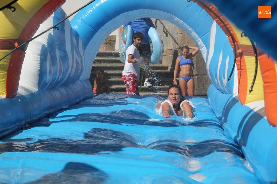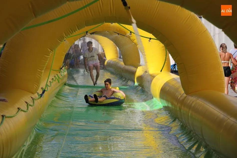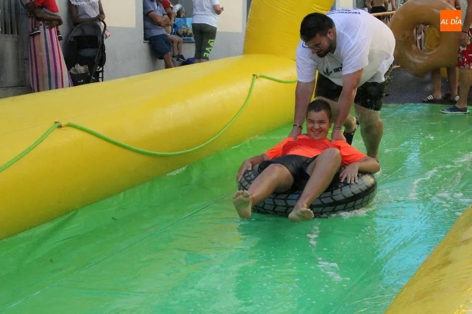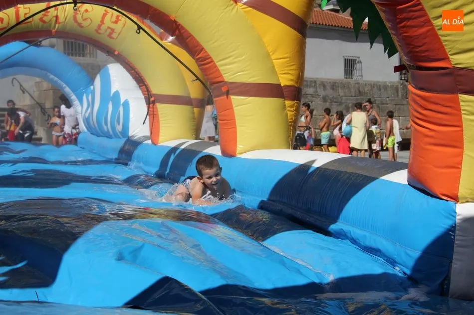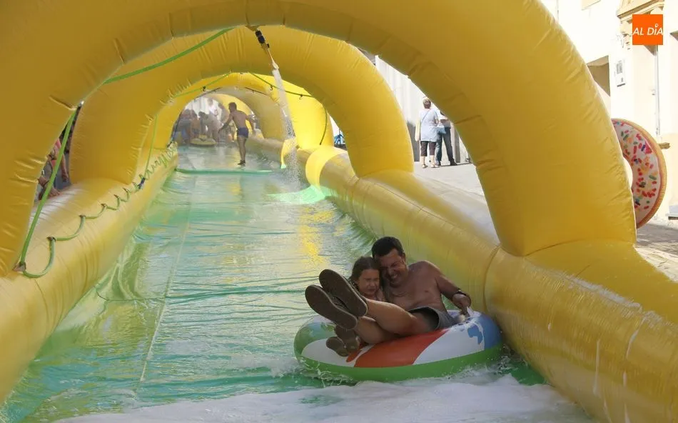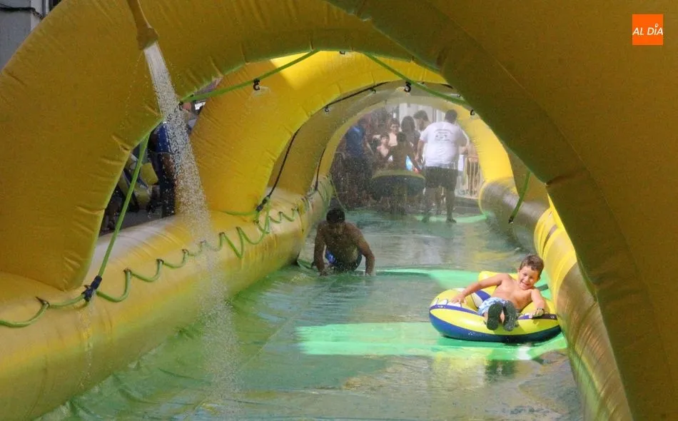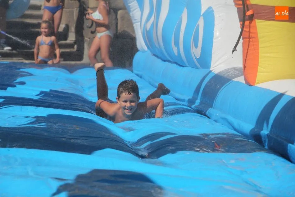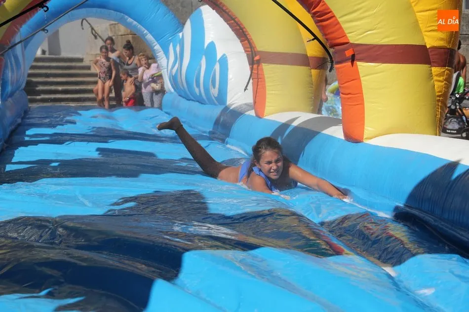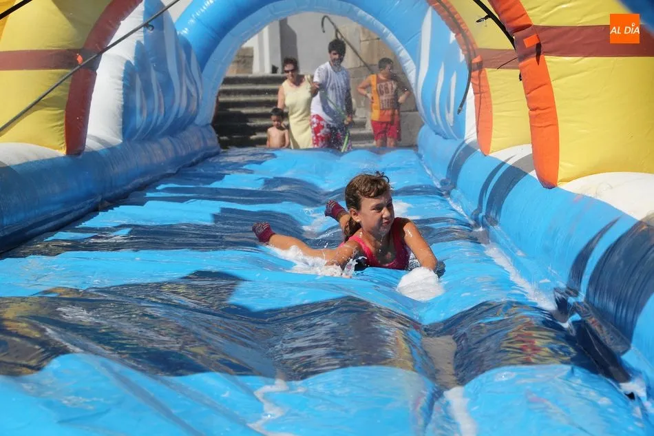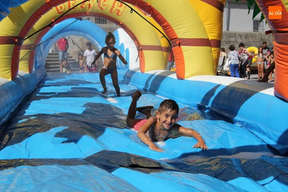 El epicentro de Vitigudino parecía la tarde de este jueves un auténtico parque acuático tras la instalación de dos grande toboganes. La Plaza de España y la calle Santa Ana se convertían en un hervidero de niños dispuestos a disfrutar de una de las atracciones de las Ferias y Fiestas de Vitigudino 2019, aunque algunos mayores también aprovecharon la oportunidad para sentirse niños por unos instantes.