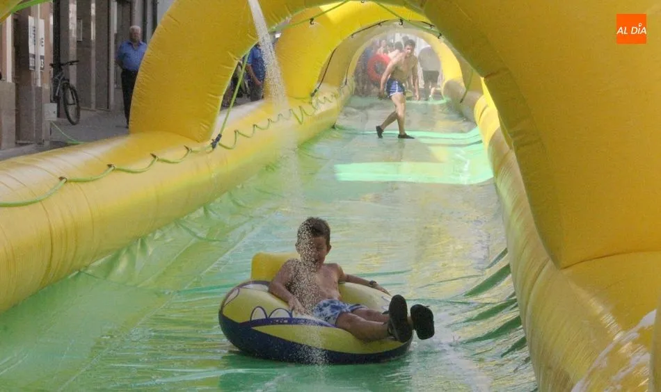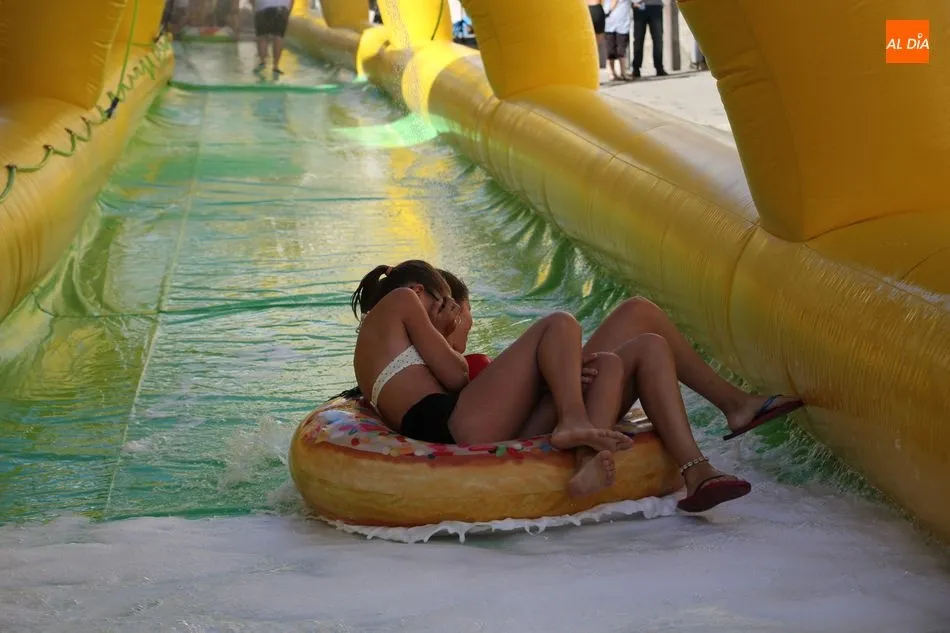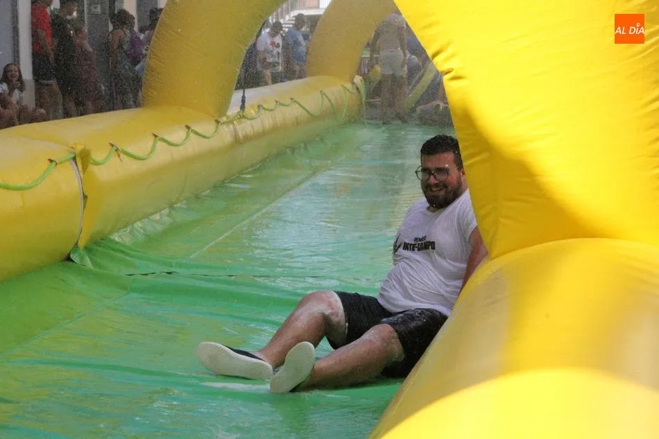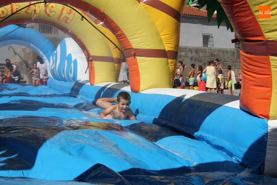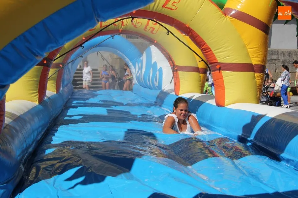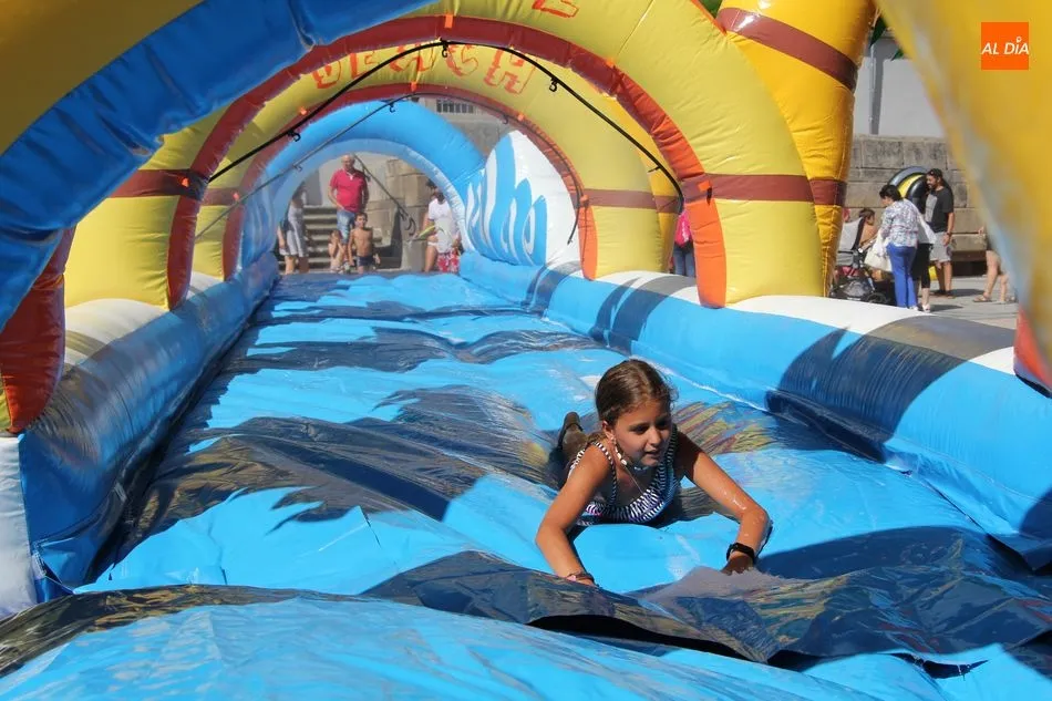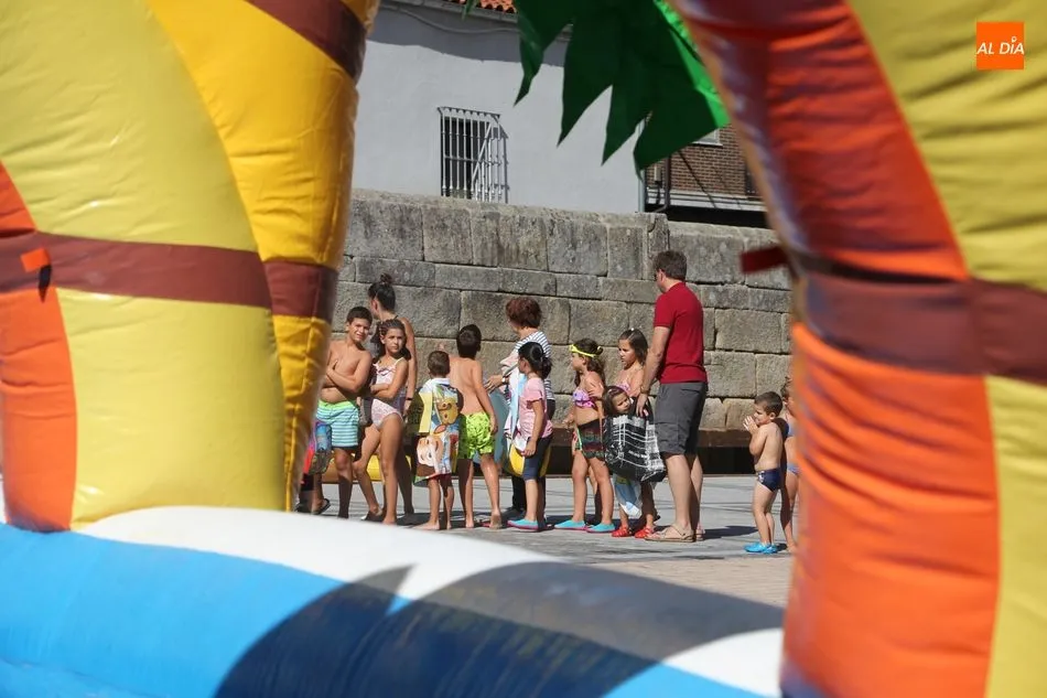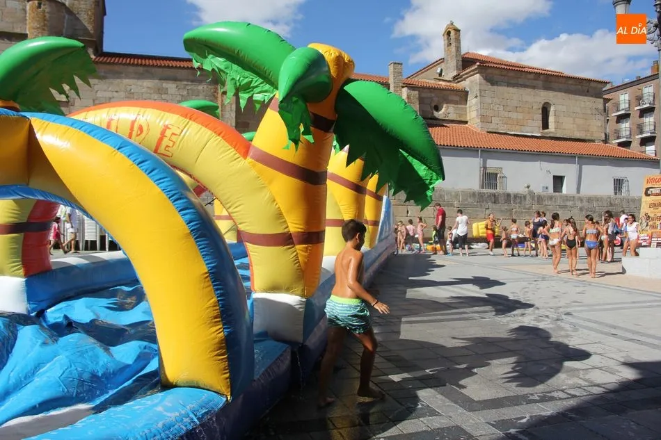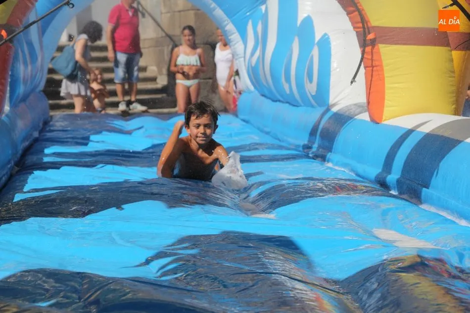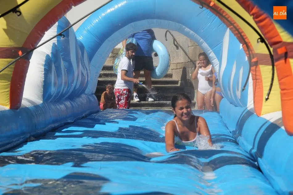 El epicentro de Vitigudino parecía la tarde de este jueves un auténtico parque acuático tras la instalación de dos grande toboganes. La Plaza de España y la calle Santa Ana se convertían en un hervidero de niños dispuestos a disfrutar de una de las atracciones de las Ferias y Fiestas de Vitigudino 2019, aunque algunos mayores también aprovecharon la oportunidad para sentirse niños por unos instantes.