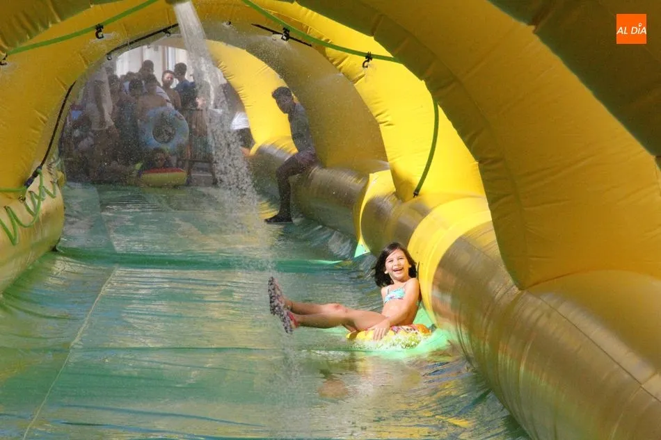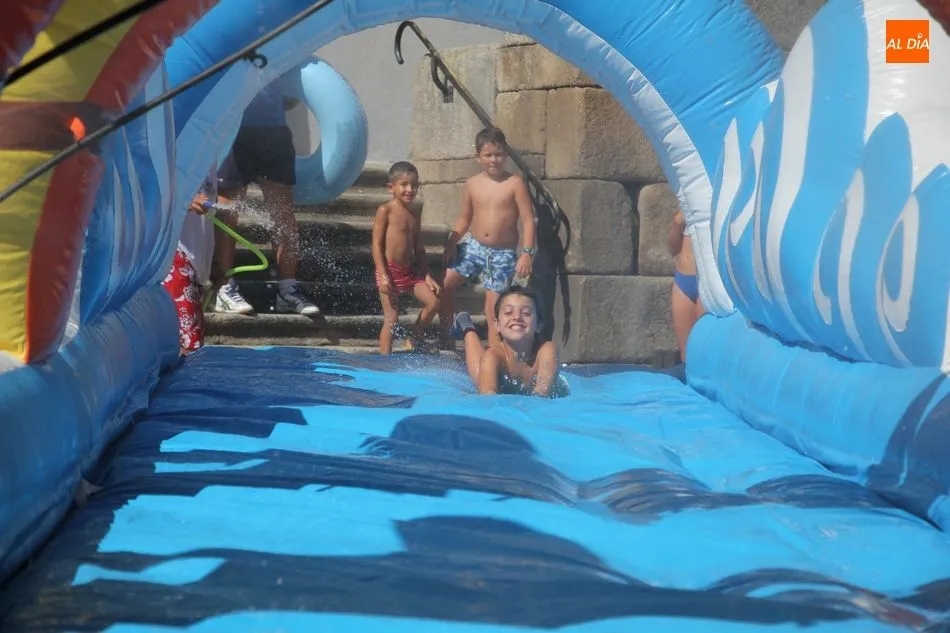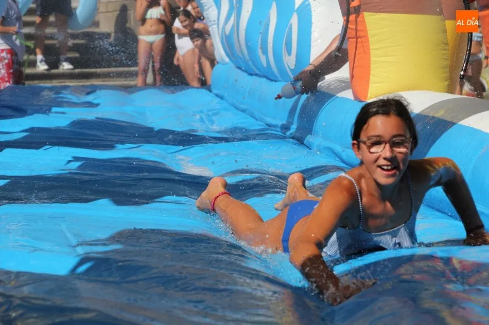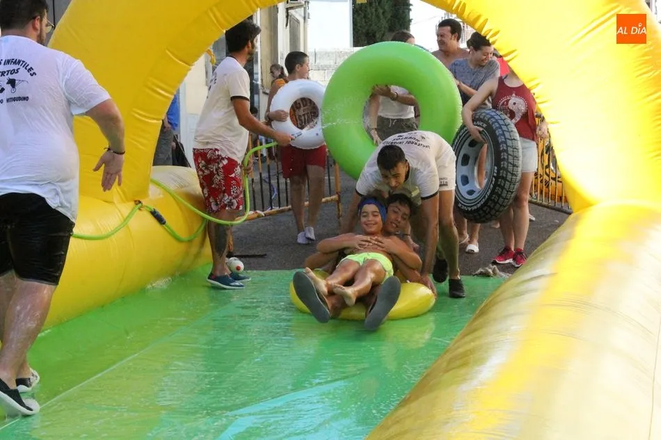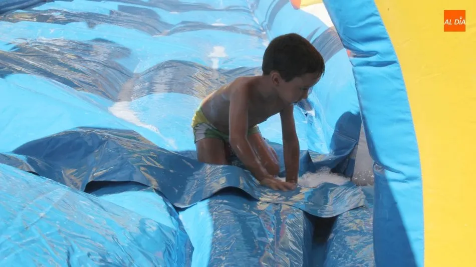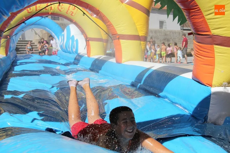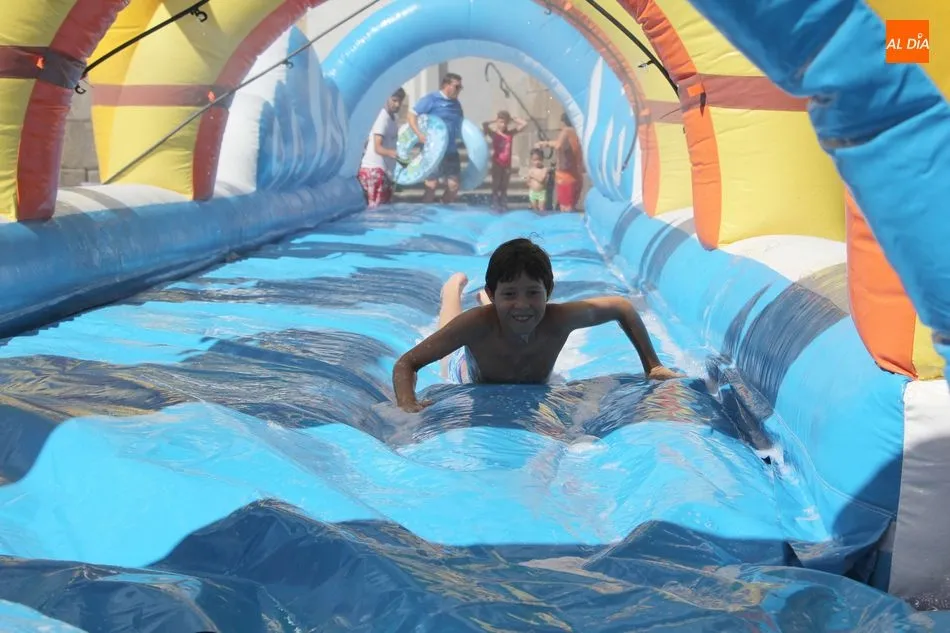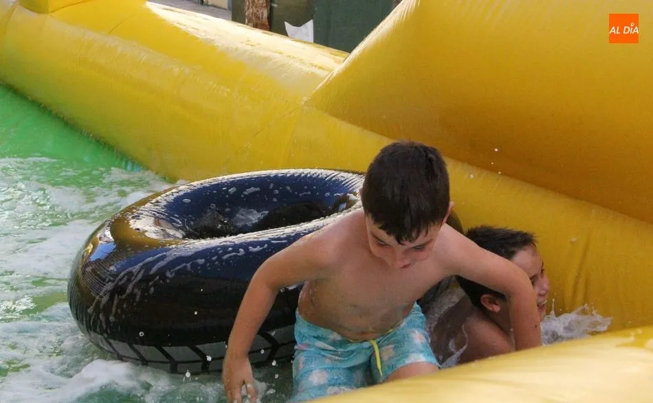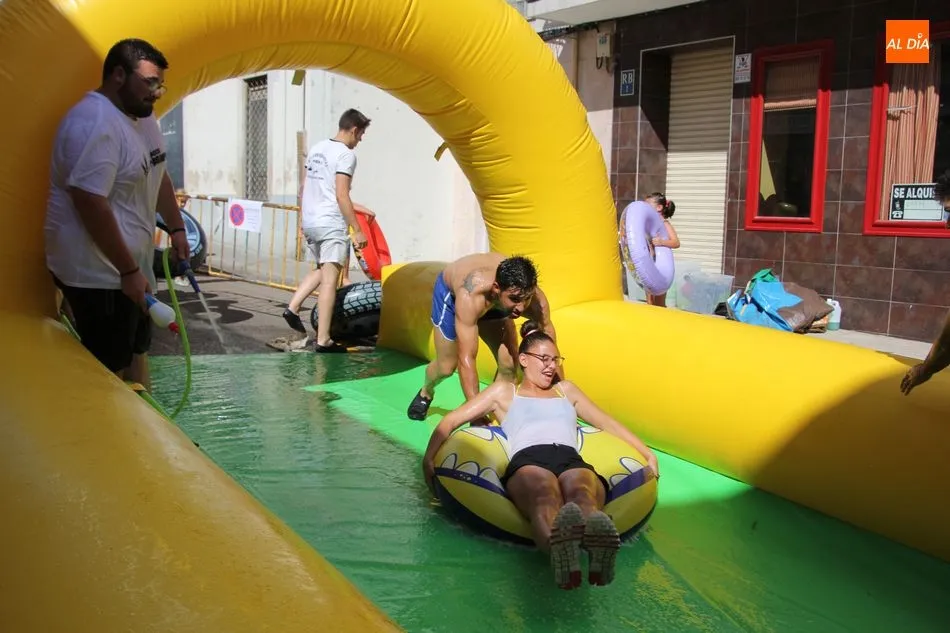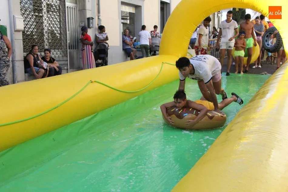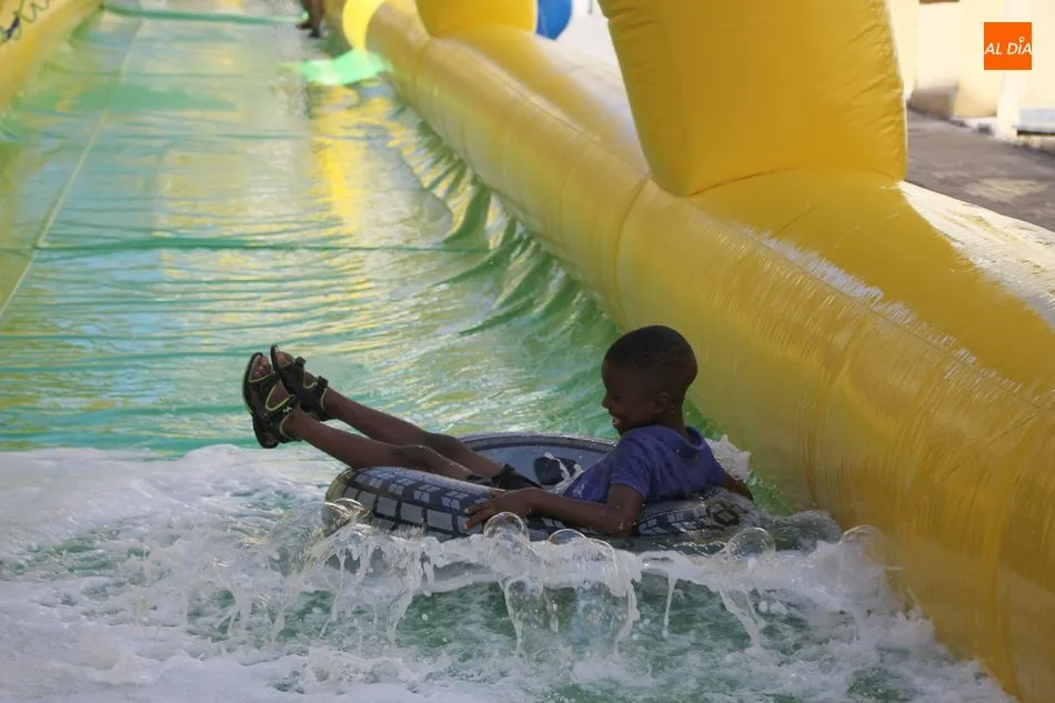 El epicentro de Vitigudino parecía la tarde de este jueves un auténtico parque acuático tras la instalación de dos grande toboganes. La Plaza de España y la calle Santa Ana se convertían en un hervidero de niños dispuestos a disfrutar de una de las atracciones de las Ferias y Fiestas de Vitigudino 2019, aunque algunos mayores también aprovecharon la oportunidad para sentirse niños por unos instantes.