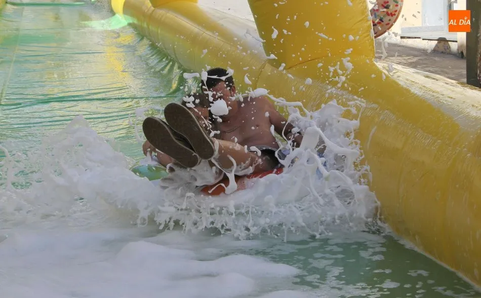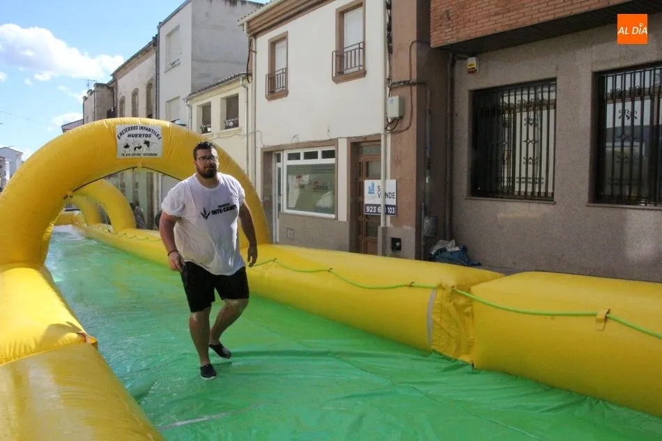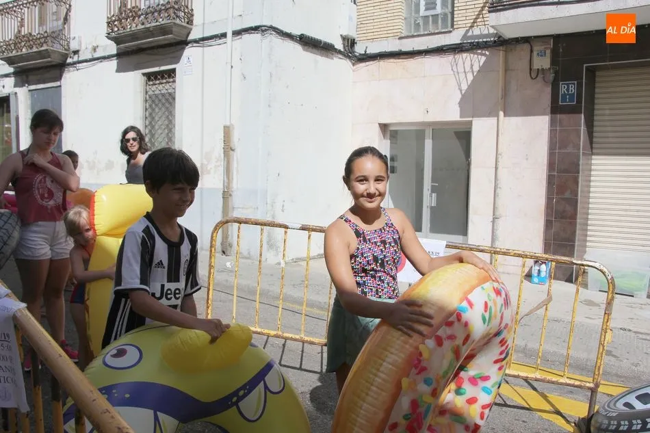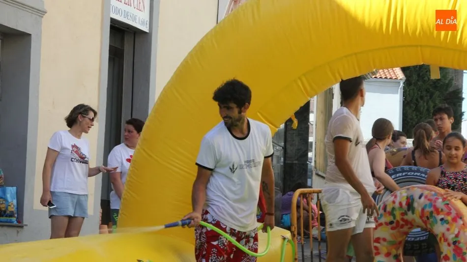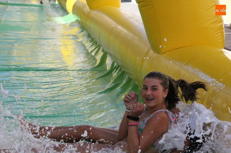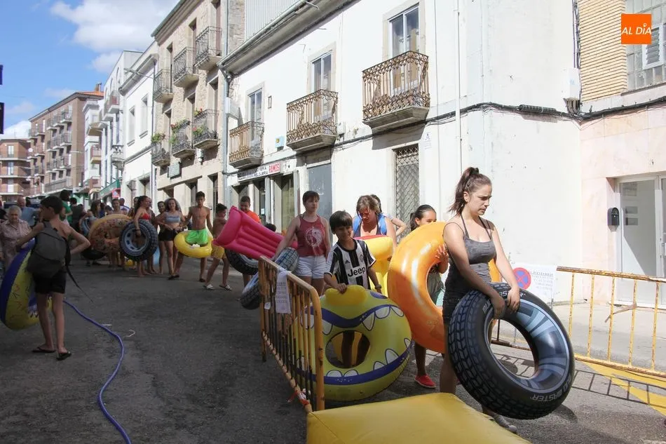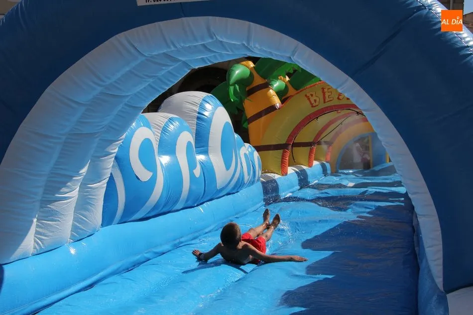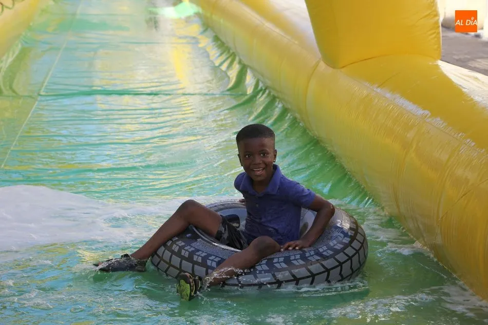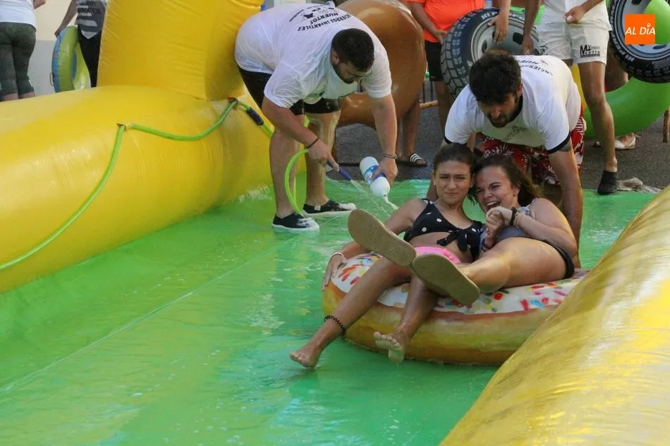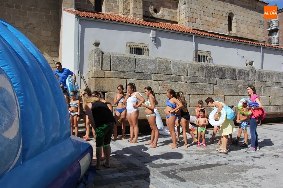 El epicentro de Vitigudino parecía la tarde de este jueves un auténtico parque acuático tras la instalación de dos grande toboganes. La Plaza de España y la calle Santa Ana se convertían en un hervidero de niños dispuestos a disfrutar de una de las atracciones de las Ferias y Fiestas de Vitigudino 2019, aunque algunos mayores también aprovecharon la oportunidad para sentirse niños por unos instantes.