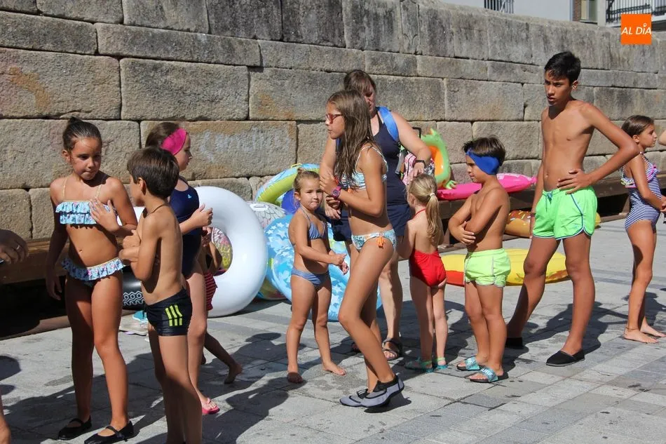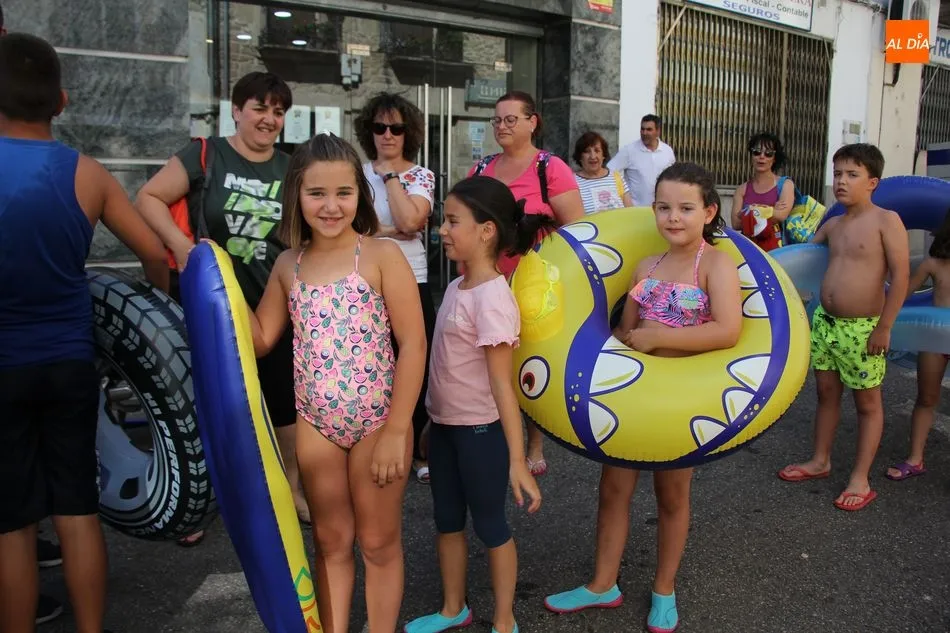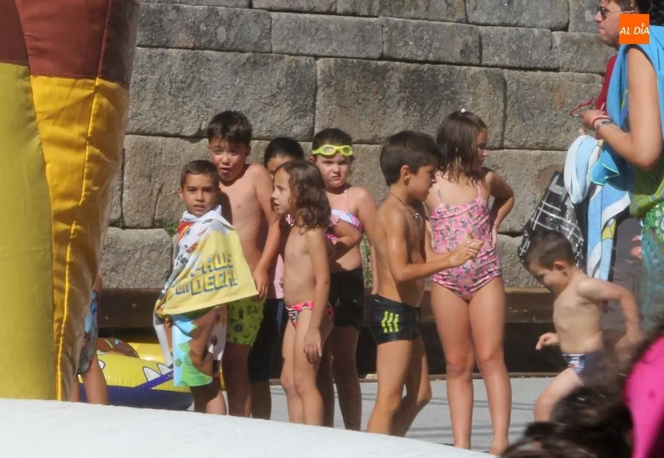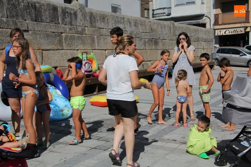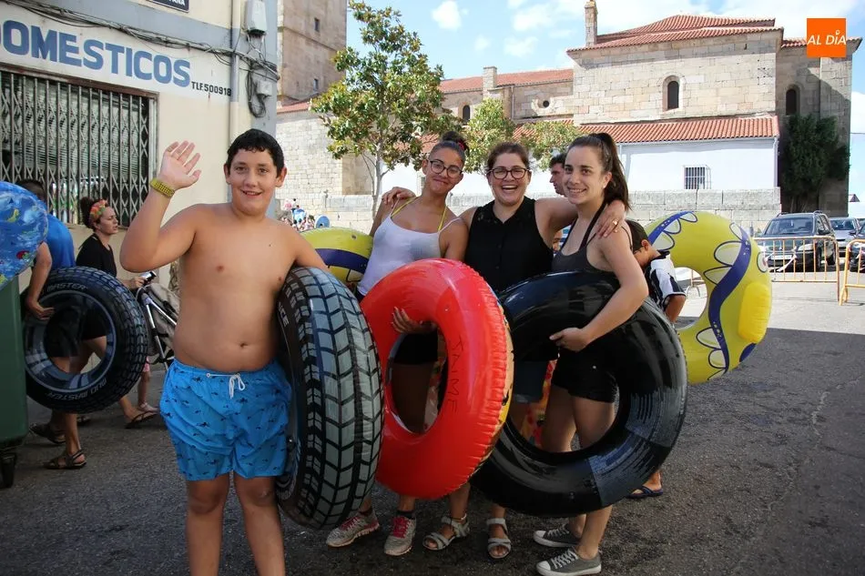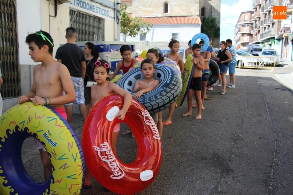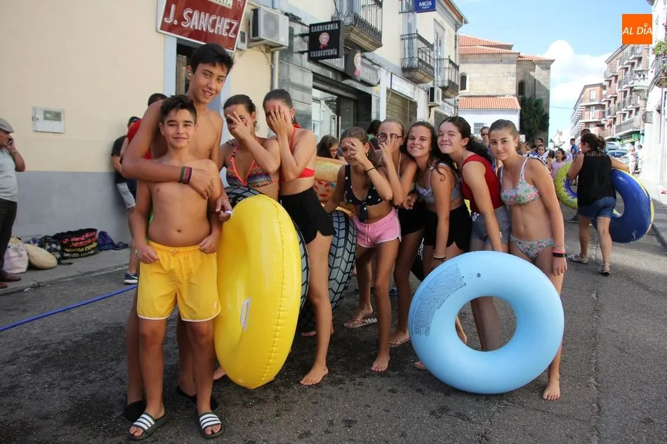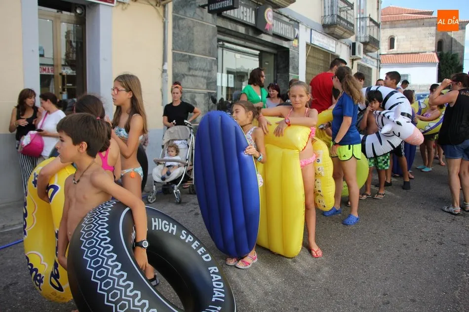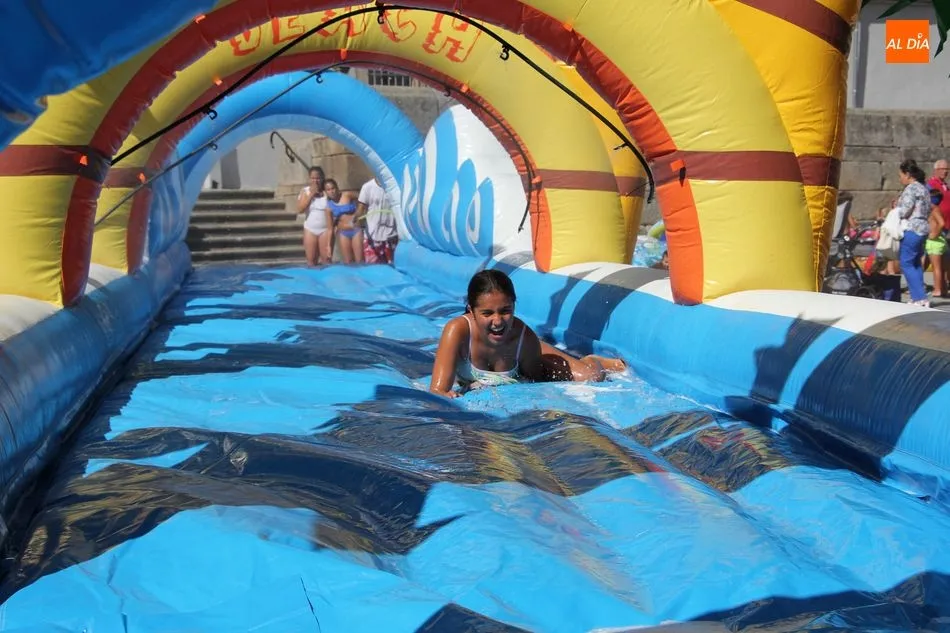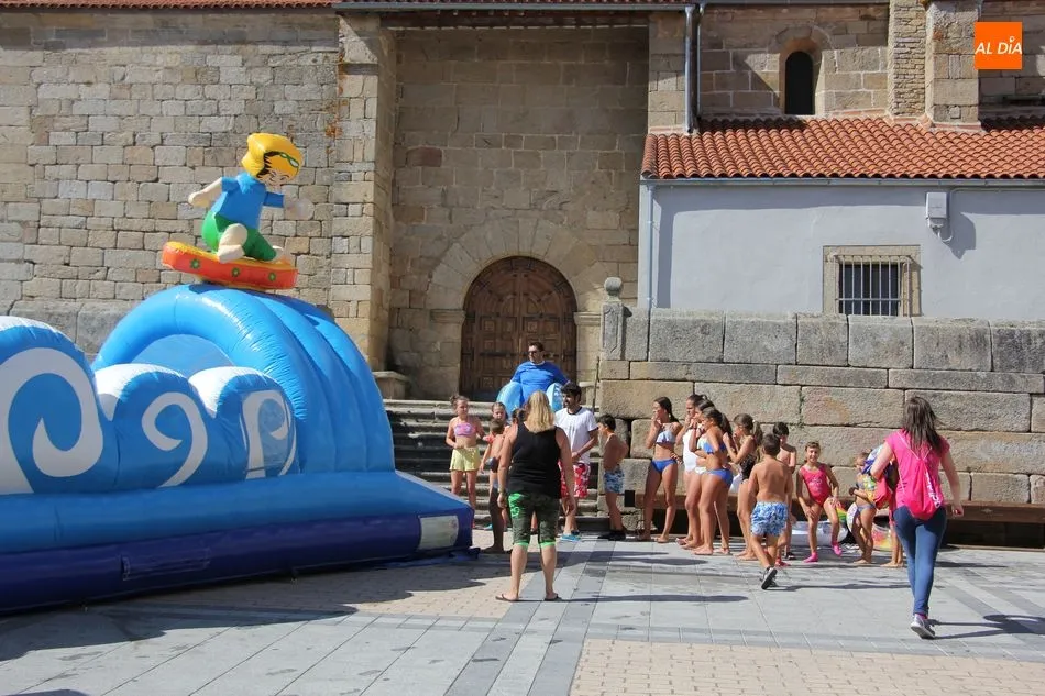 El epicentro de Vitigudino parecía la tarde de este jueves un auténtico parque acuático tras la instalación de dos grande toboganes. La Plaza de España y la calle Santa Ana se convertían en un hervidero de niños dispuestos a disfrutar de una de las atracciones de las Ferias y Fiestas de Vitigudino 2019, aunque algunos mayores también aprovecharon la oportunidad para sentirse niños por unos instantes.