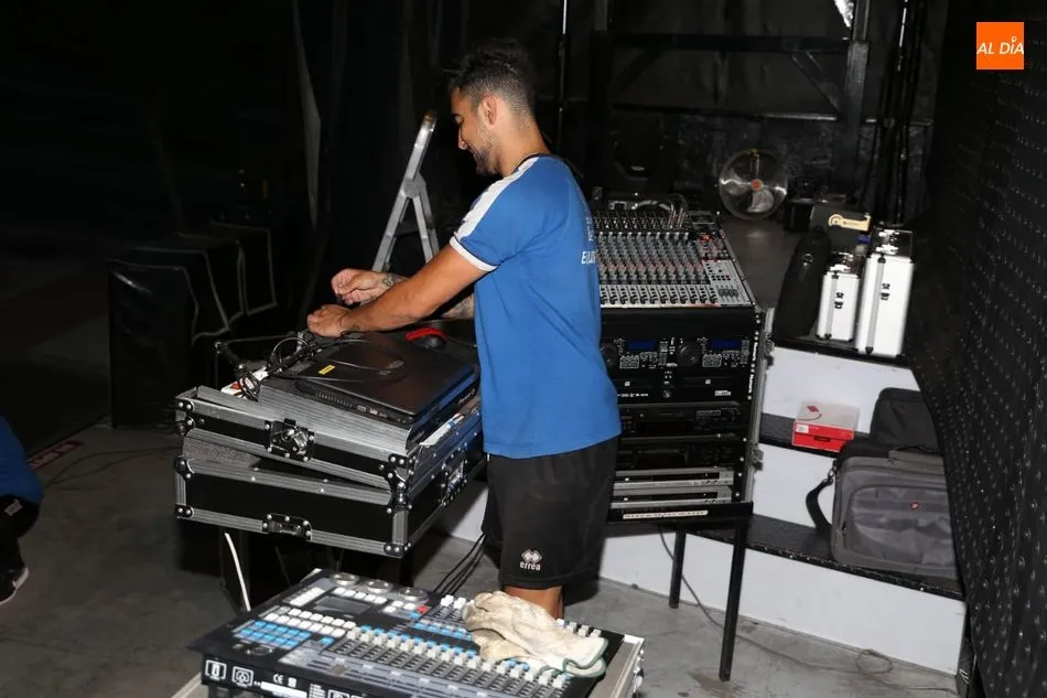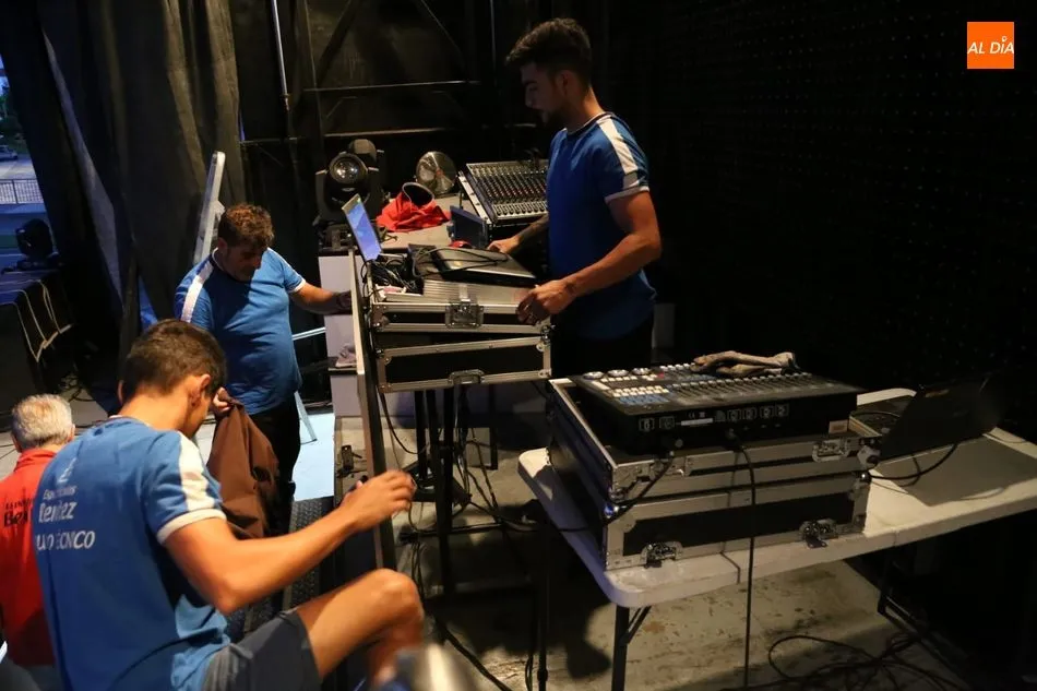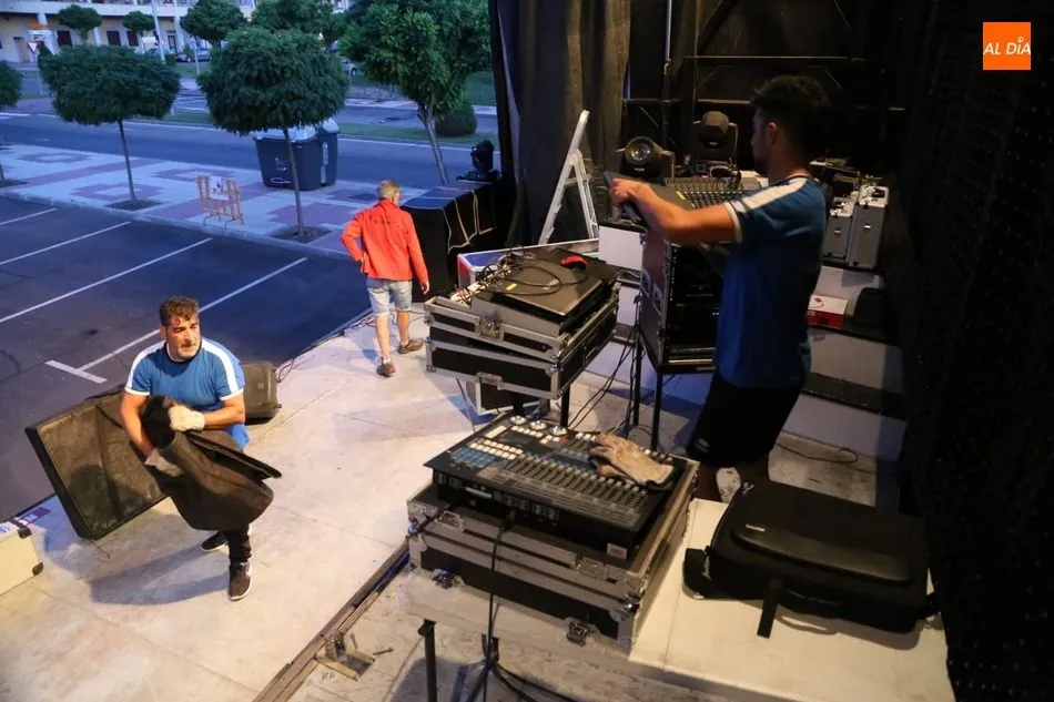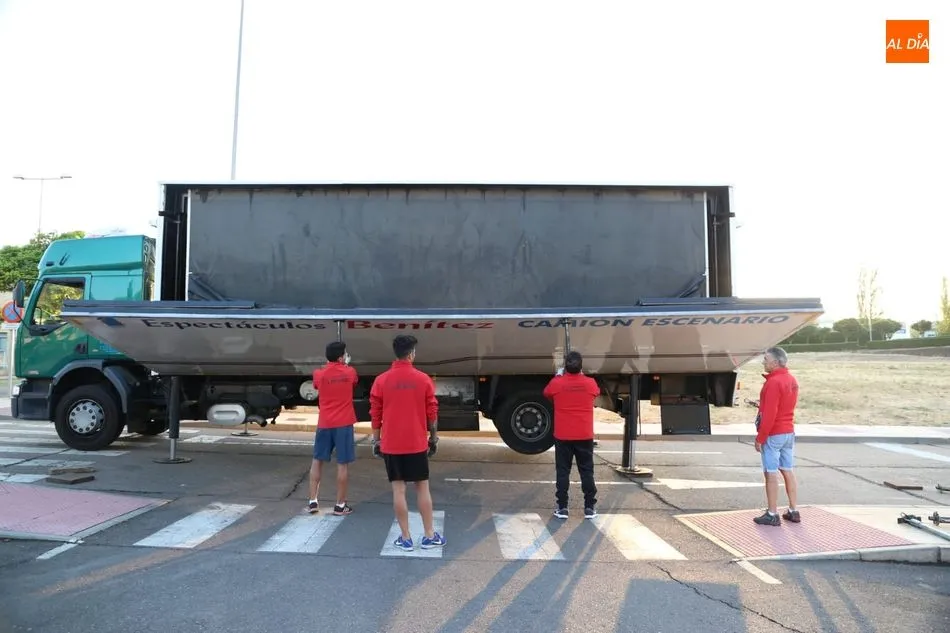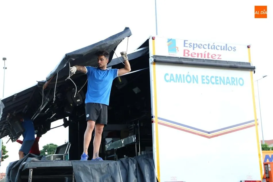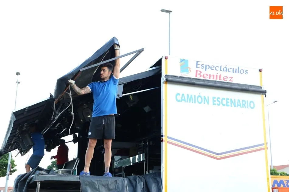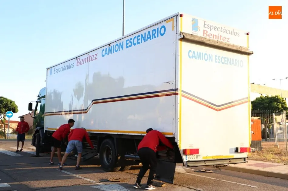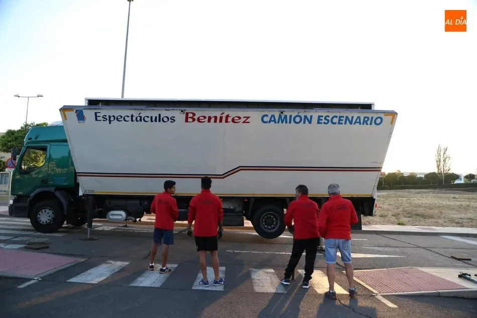 El camión de Espectáculos Benítez llega a Carbajosa de la Sagrada tres horas antes de la actuación. Aquí comienza el trabajo de los técnicos de luz y sonido, que trabajan contra reloj para tenerlo todo listo antes del comienzo de la actuación.