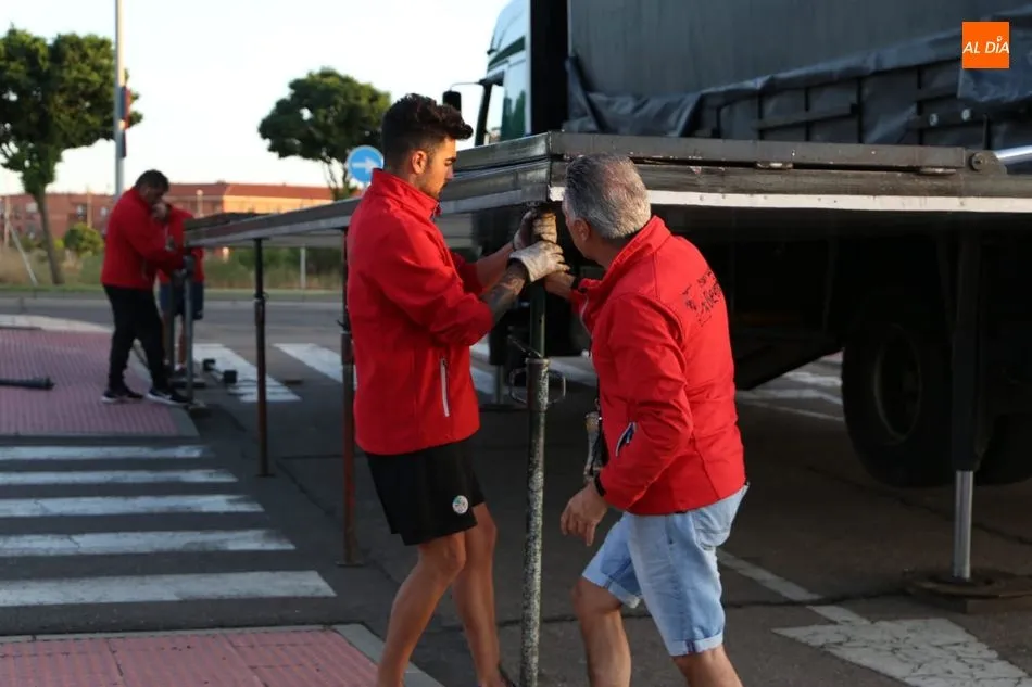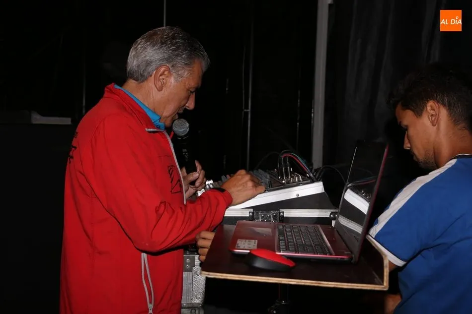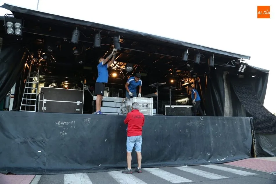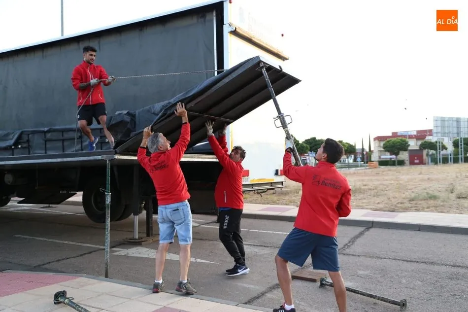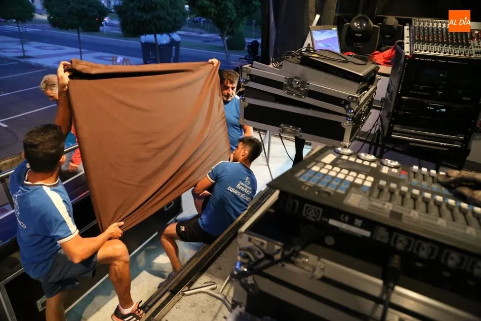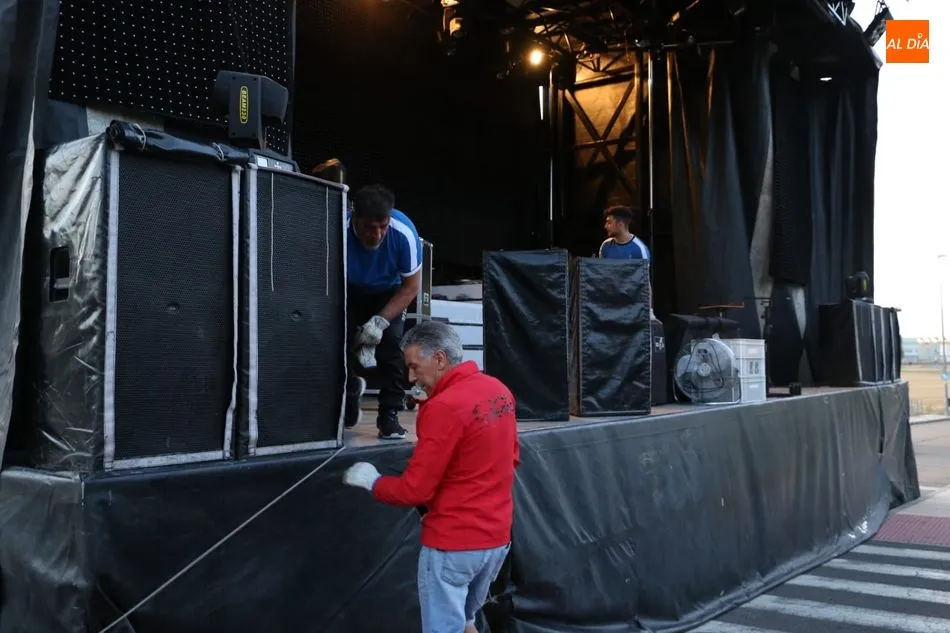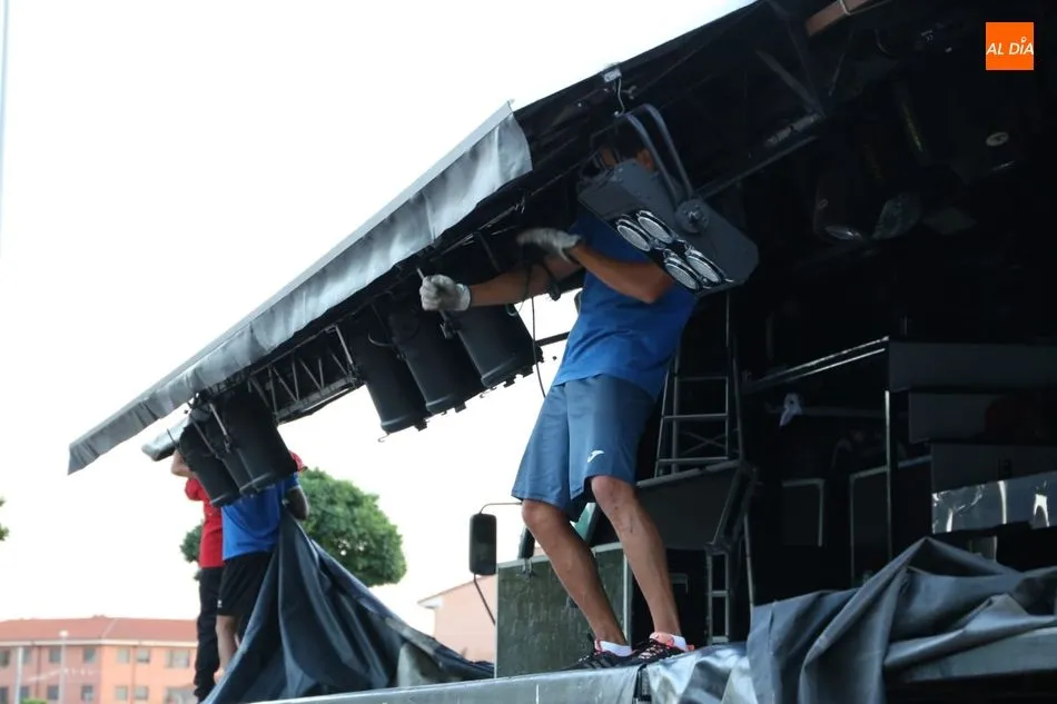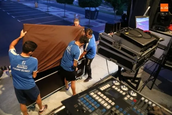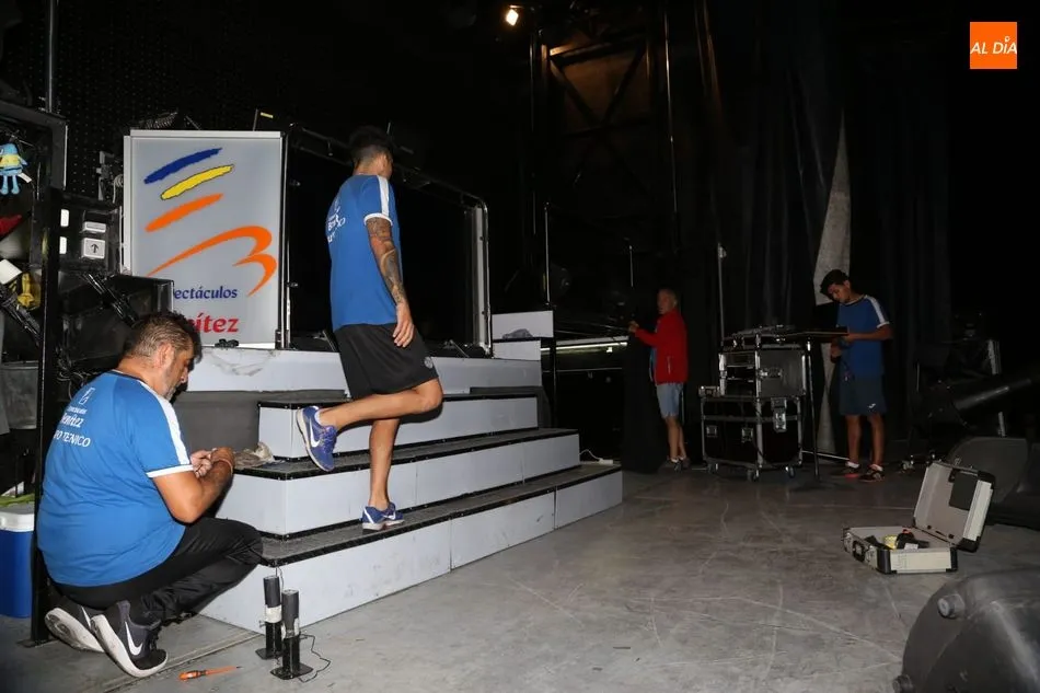 El camión de Espectáculos Benítez llega a Carbajosa de la Sagrada tres horas antes de la actuación. Aquí comienza el trabajo de los técnicos de luz y sonido, que trabajan contra reloj para tenerlo todo listo antes del comienzo de la actuación.