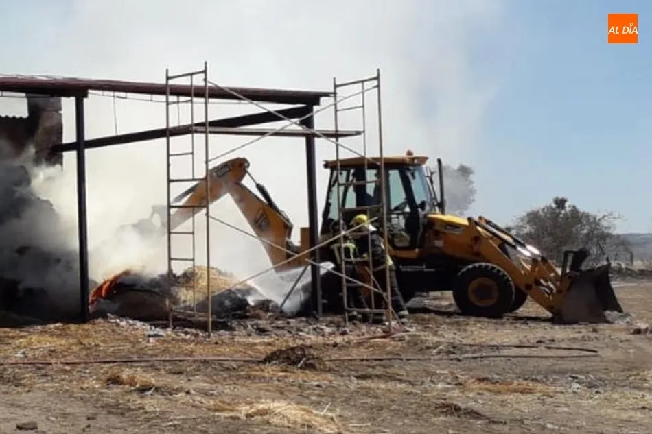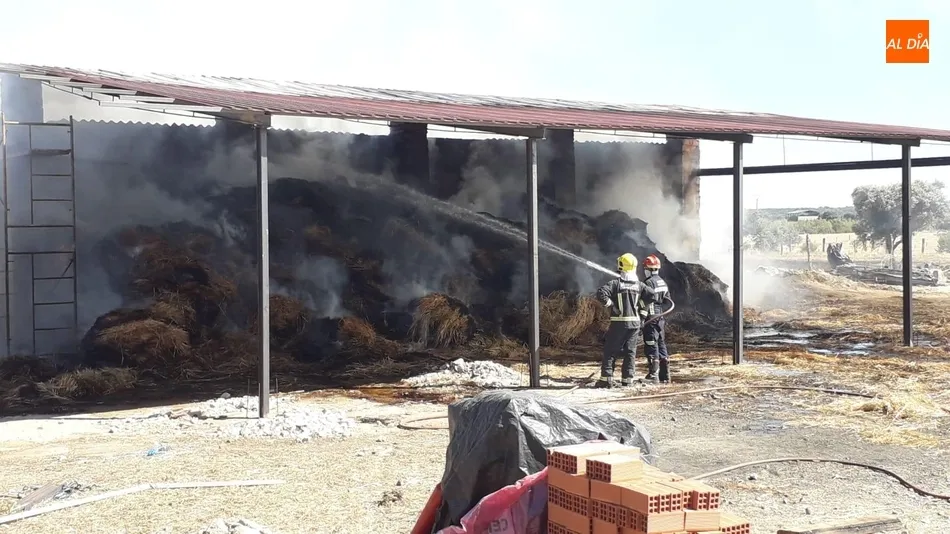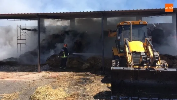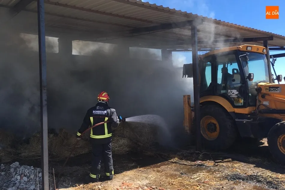 Cuando son las cinco y media de la tarde de este miércoles, 14 de agosto, los bomberos de Lumbrales trabajan para sofocar las llamas en la nave ganadera.