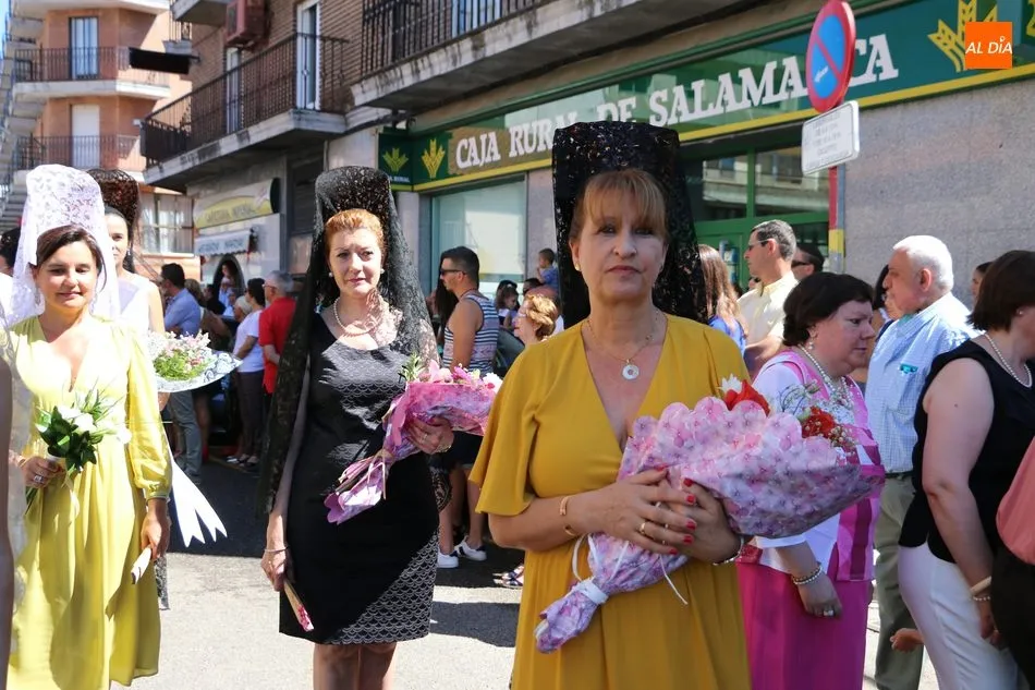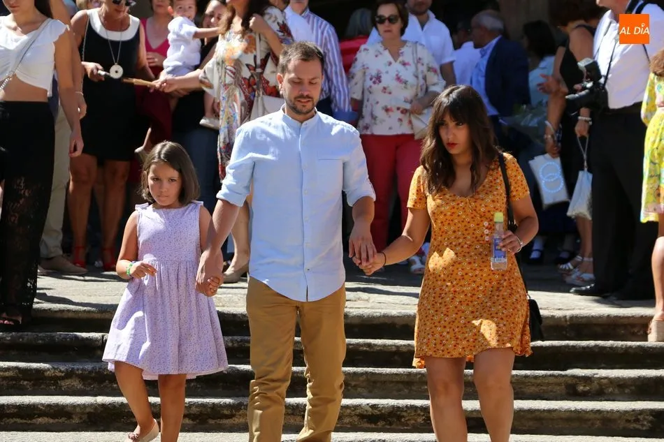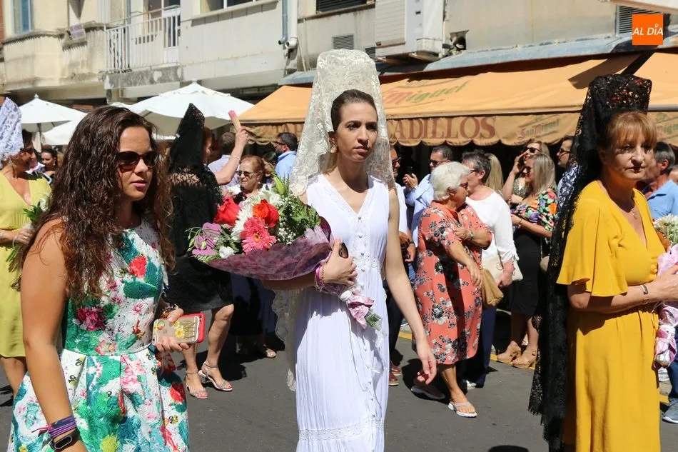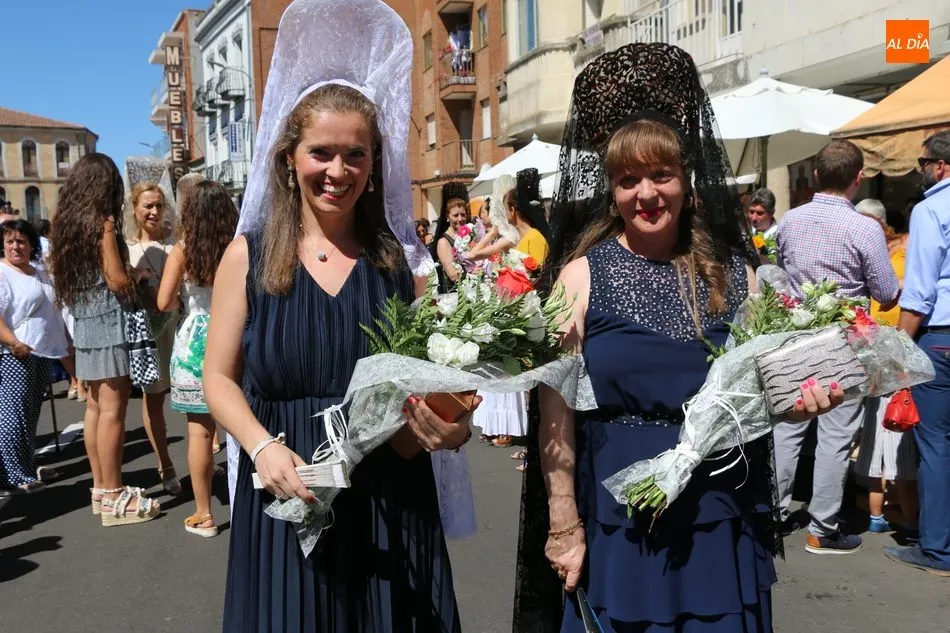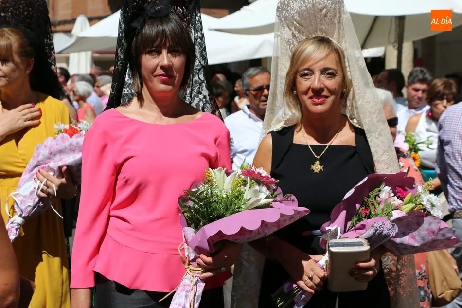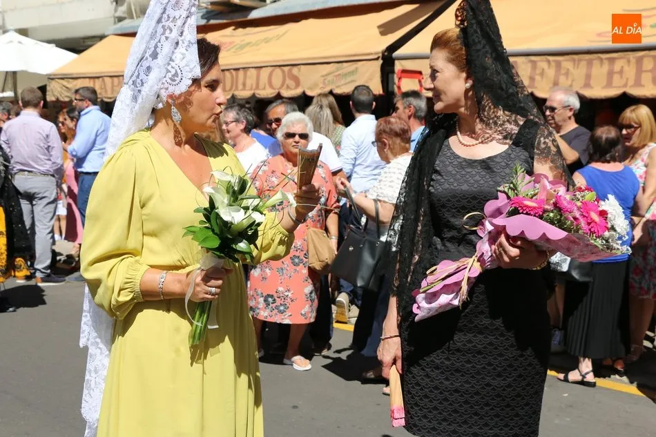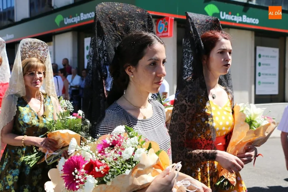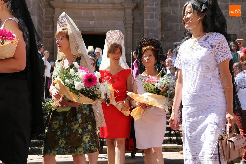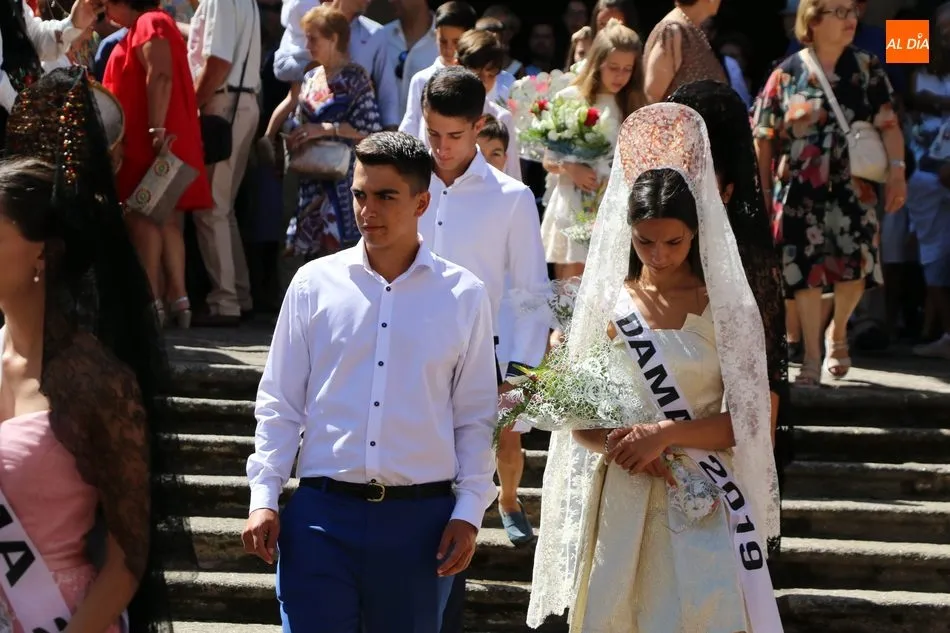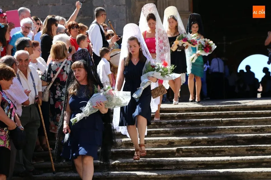 A continuación, el repique de campanas rompía el murmullo del público mientras la Corte de Honor lucía toda su belleza conformando dos filas delante de los mayordomos y mujeres tocadas con peinetas. La procesión comenzaba Santa Ana abajo dirección al Socorro, aunque antes, parada en la plaza del Convento para saludar a las monjas de Santo Toribio, Agustinas Recoletas que desde hace más de 400 años viven con intensidad este momento. El público acompañaba a las religiosas en su canción dedicada a la Virgen, y Organza repetía su ofrenda con un nuevo baile interpretado por David Vicente con la gaita y el tamboril.