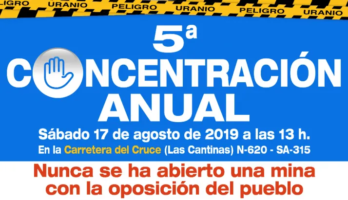 Como en años anteriores, la protesta tendrá lugar a las 13.00 horas en el Cruce de La Fuente de San Esteban (en la intersección de la Nacional 620 con la carretera comarcal SA-315), con la finalidad de ?mostrar el rechazo de la población del Campo Charro a la apertura de minas de uranio a cielo abierto en nuestra tierra?.