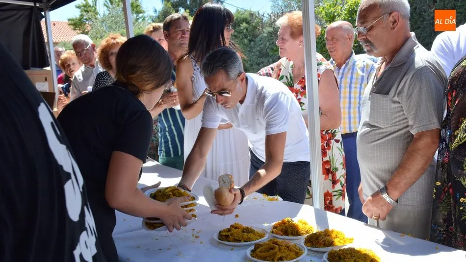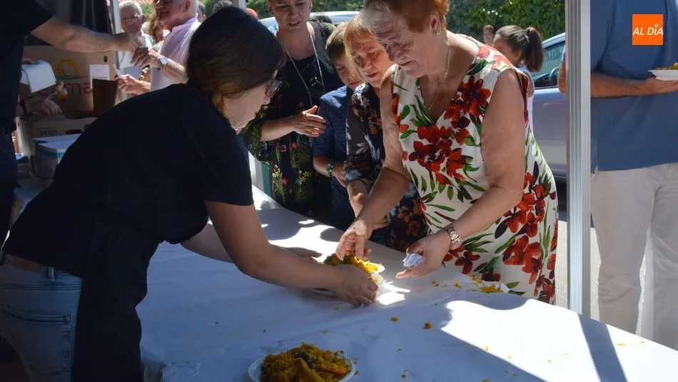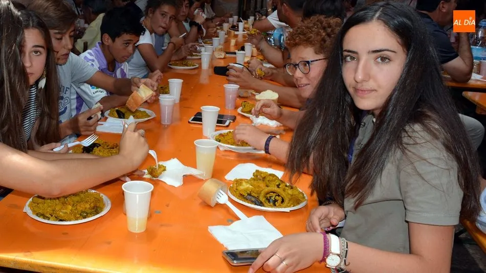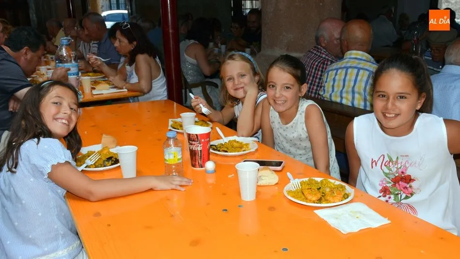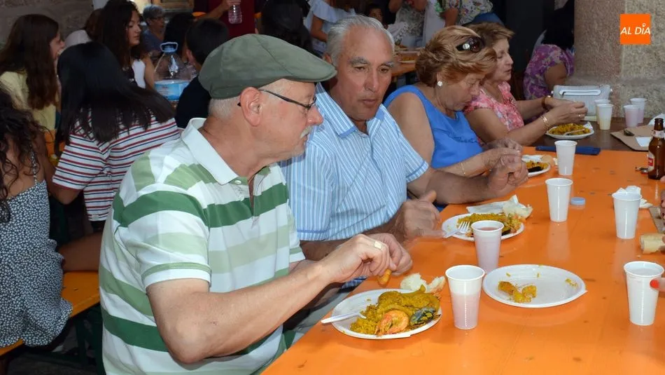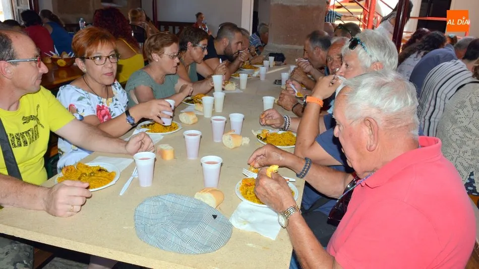 Más de 500 platos de paella se repartieron al mediodia de hoy en la plaza de La Alhóndiga. Los asistentes hicieron cola para recoger su plato y su bebida y llevarlos hasta la mesa que les esperaba en la casa de la cultura, la antigua Alhondiga de la villa. En el interior del histórico edificio, niños, jovenes, amigos y familias enteras degustaron la exquisita paella, preparada por la empresa de Bañobárez Paellas David.