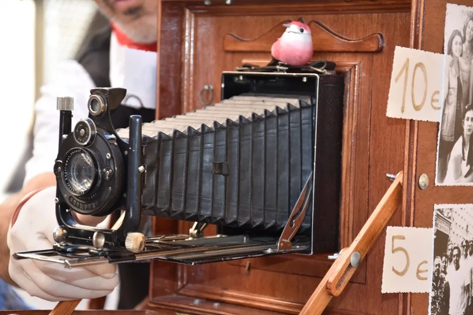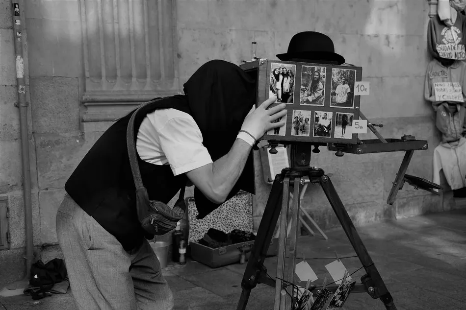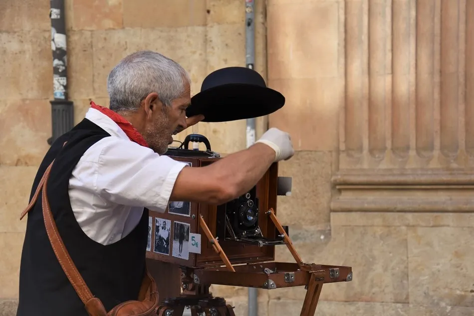 La calle, la nuestra, piedra y tiempo, tiene un habitante del pasado, elegante como un duende que rememora el aliento de la fotografía ambulante