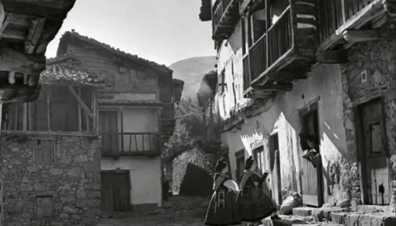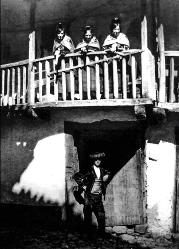 Candelario 1939. Mujeres con traje típico en el balcón y hombre apoyado en una batipuerta. Autor: José Ortiz Echagüe. Fuente: Candelario No Sabías que. Extraído de la revista Priplo, número 121, edición para España, de la editorial INCAFO. Texto de Juan José Zorrilla. By Joaquín Sierra.