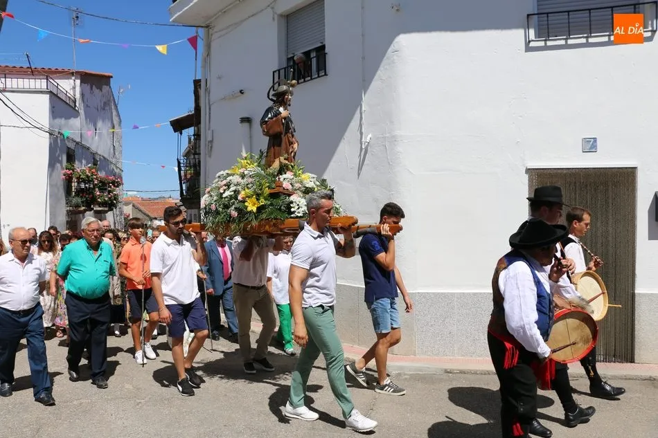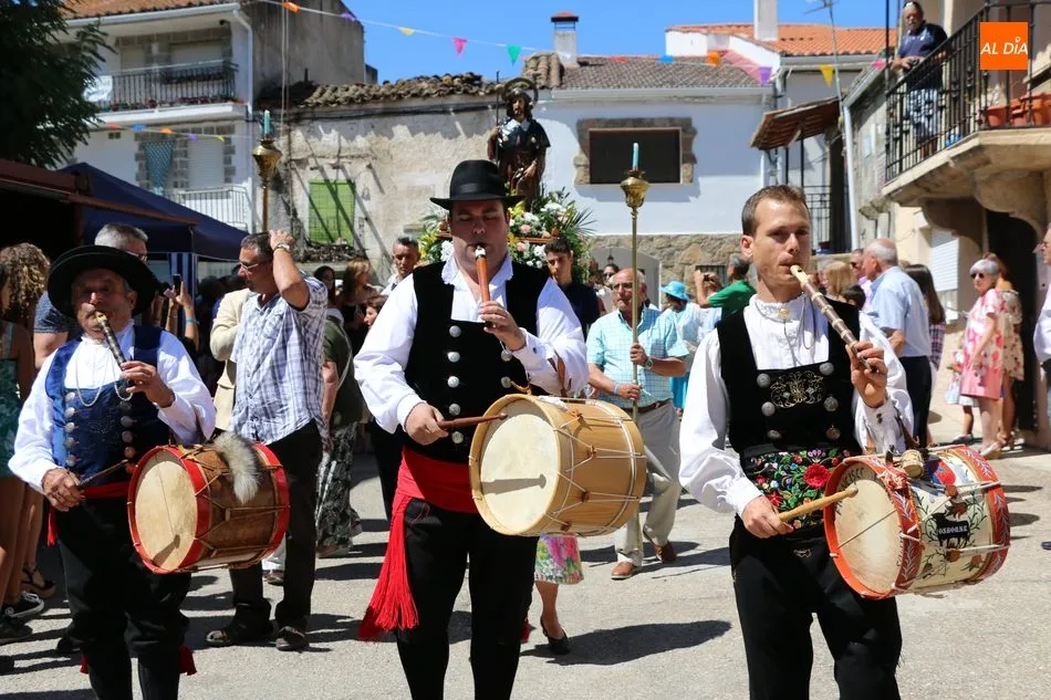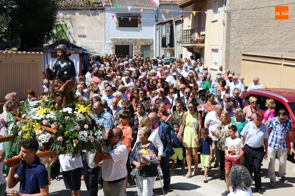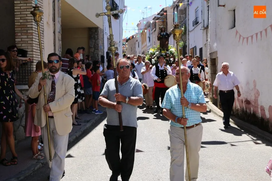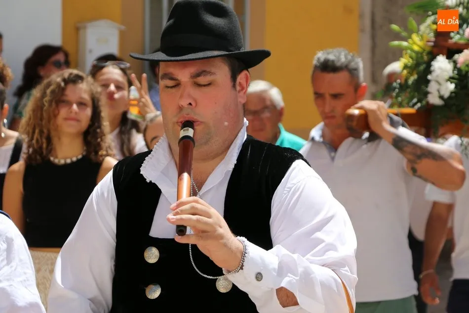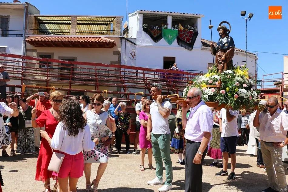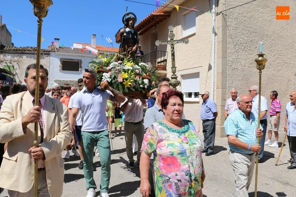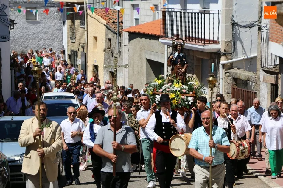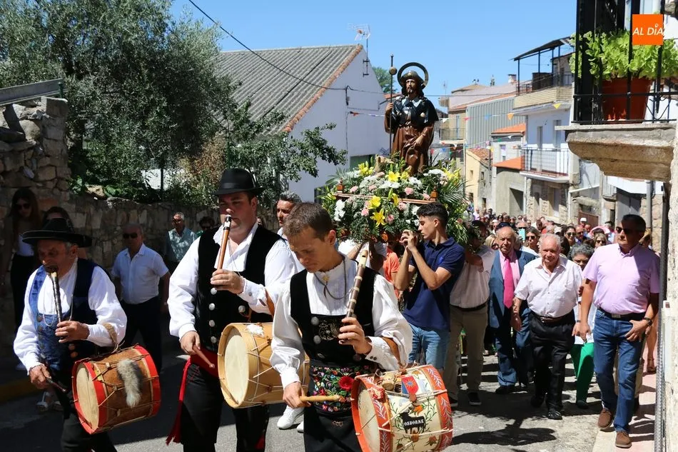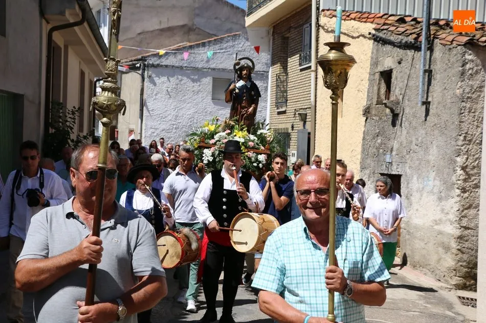 Tras la homilía oficiada por el párroco local, José Ramón Mateos, acoampñadp también por el sacerdote Ignacio Gómez, los vecinos sacaron al Patrón en procesión. La devoción a San Roque se percibía cada pocos metros con paradas para que todos pudieran llevar a hombros la peana del Santo, hasta su entrada en la Plaza Mayor, donde un grupo de charras le brindó un baile interpretado con la gaita y el tamboril por los tamborileros locales Fernando Corral, Javier Ramos y Jorge Martín.