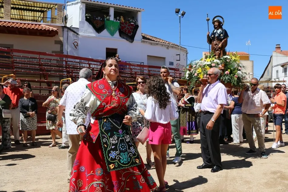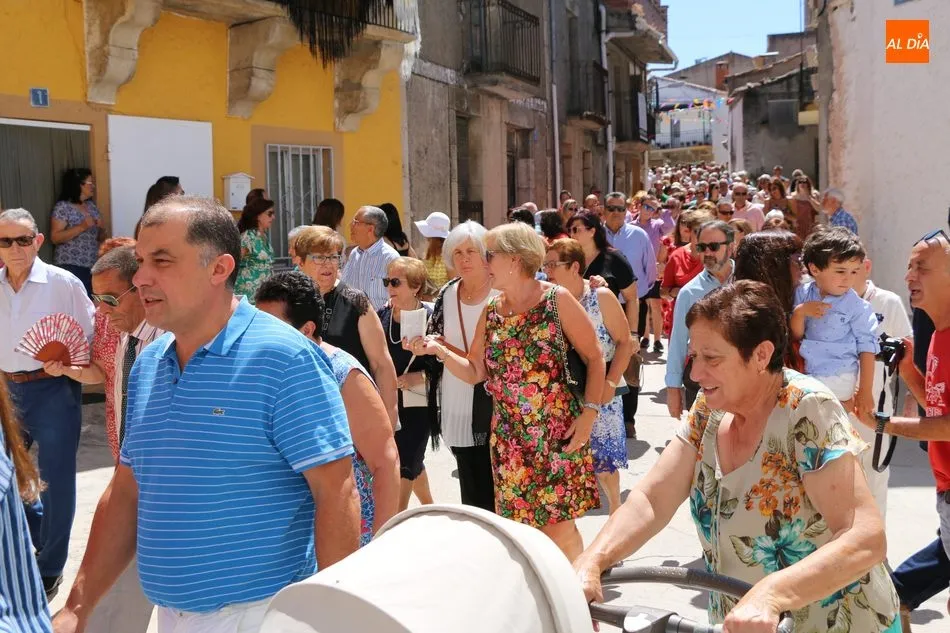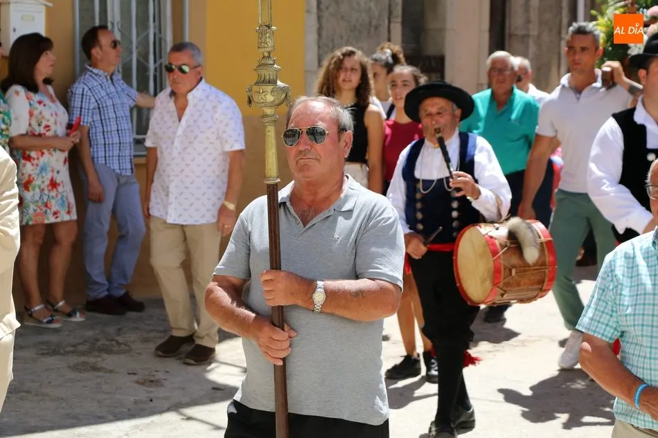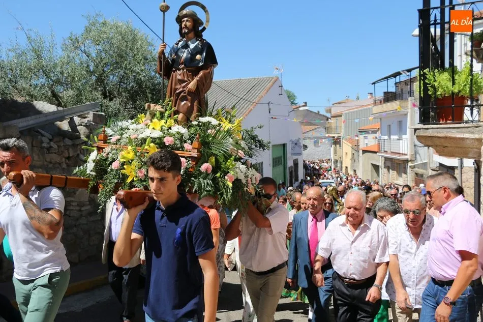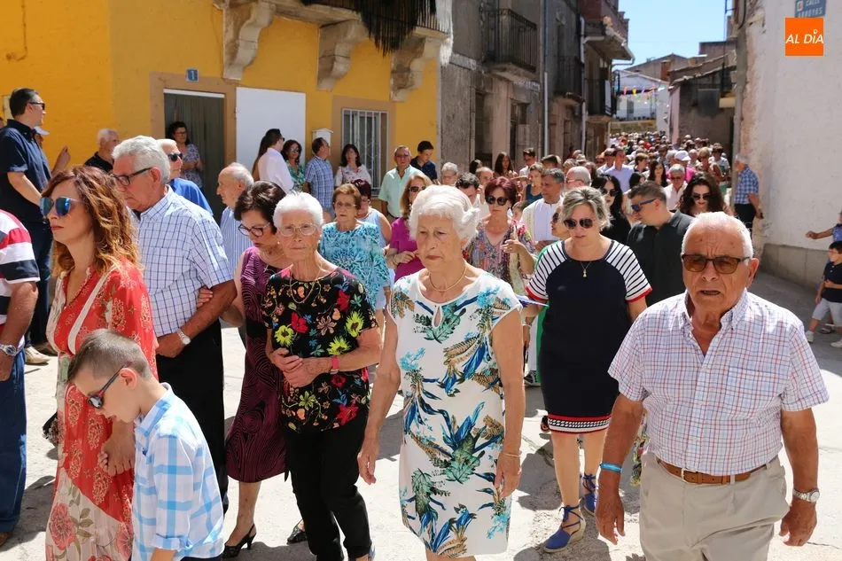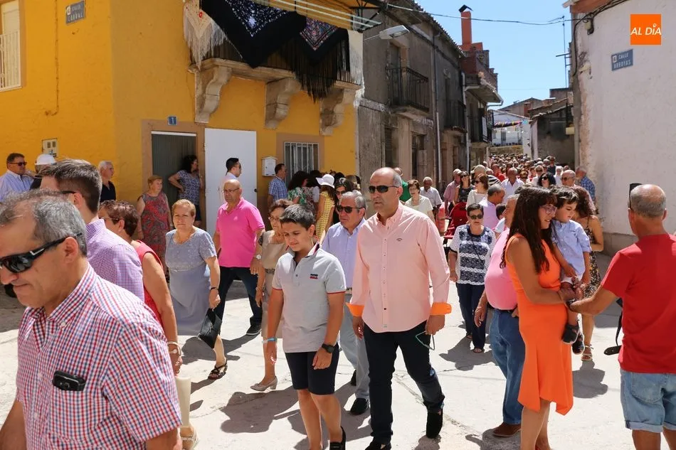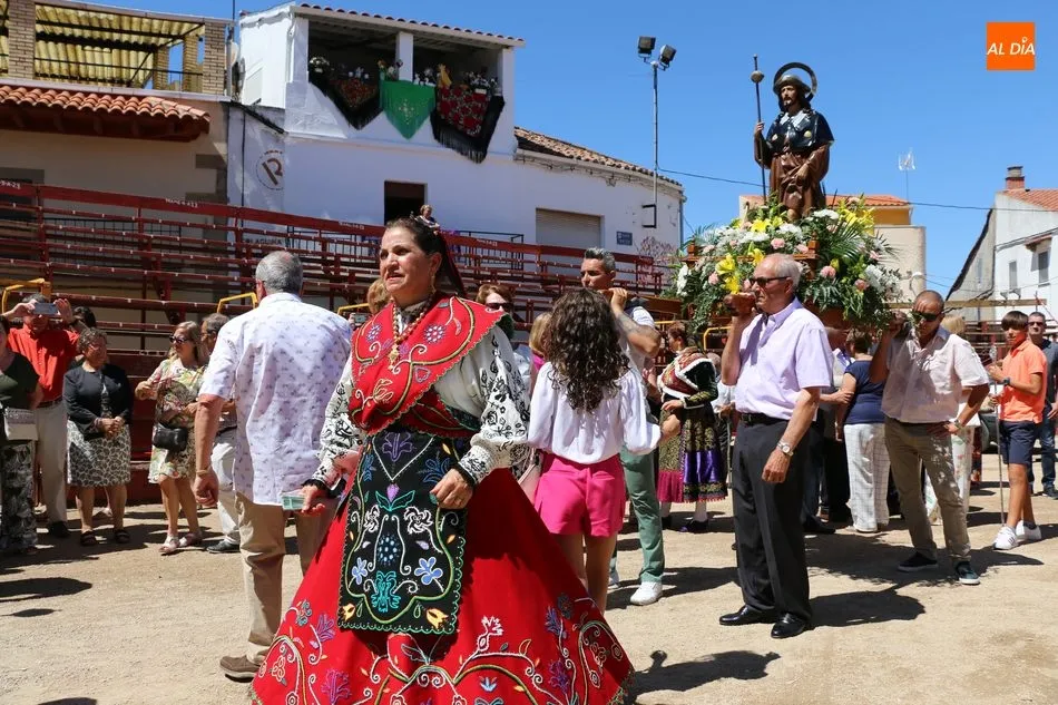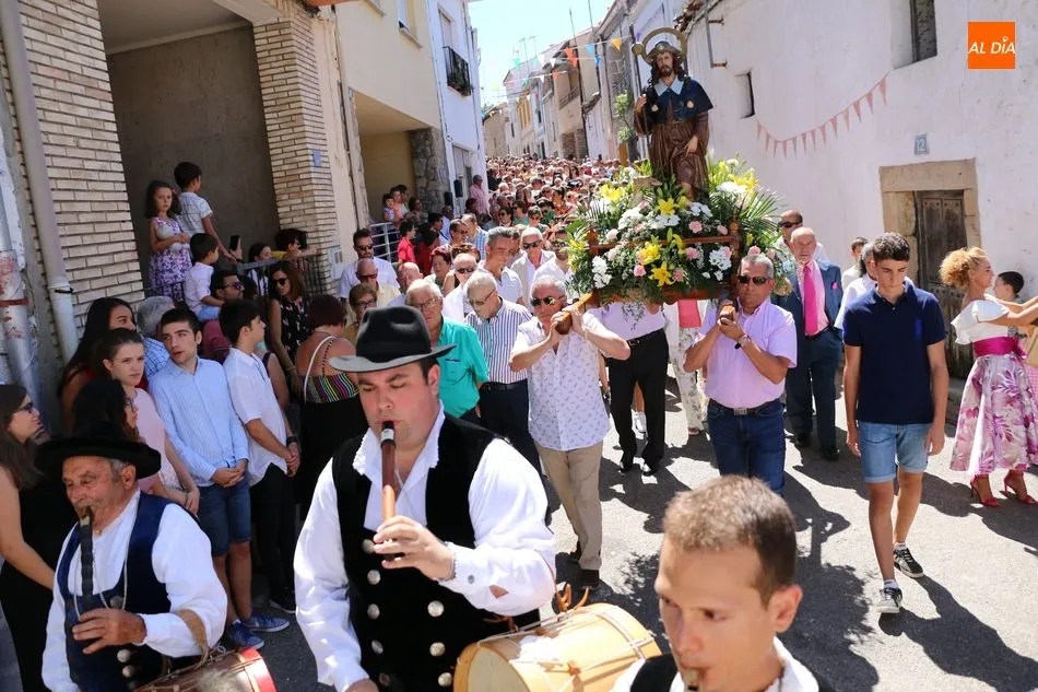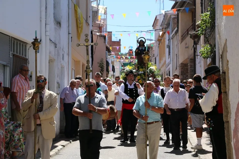 Tras la homilía oficiada por el párroco local, José Ramón Mateos, acoampñadp también por el sacerdote Ignacio Gómez, los vecinos sacaron al Patrón en procesión. La devoción a San Roque se percibía cada pocos metros con paradas para que todos pudieran llevar a hombros la peana del Santo, hasta su entrada en la Plaza Mayor, donde un grupo de charras le brindó un baile interpretado con la gaita y el tamboril por los tamborileros locales Fernando Corral, Javier Ramos y Jorge Martín.