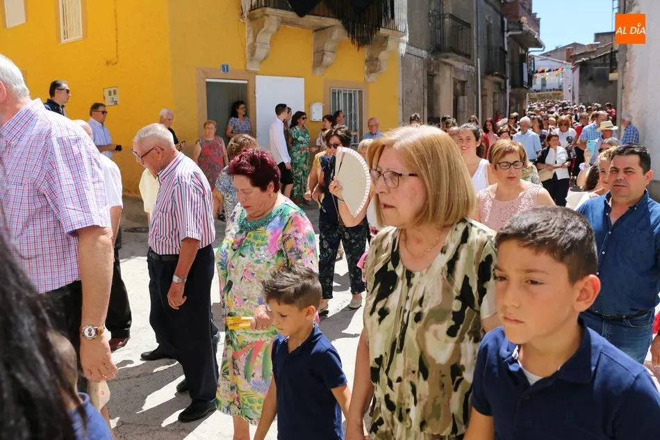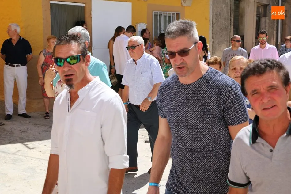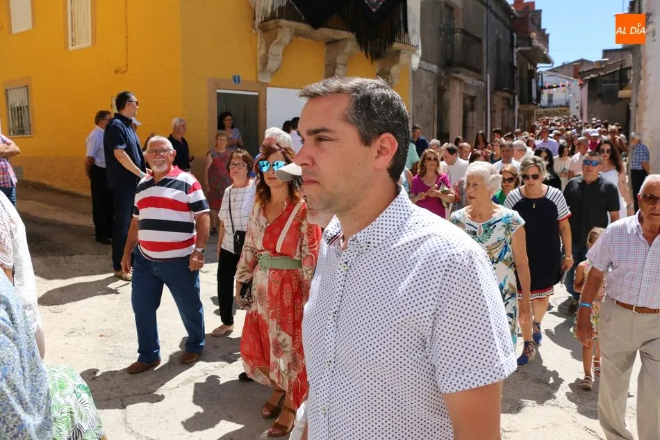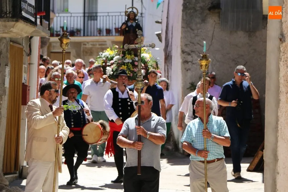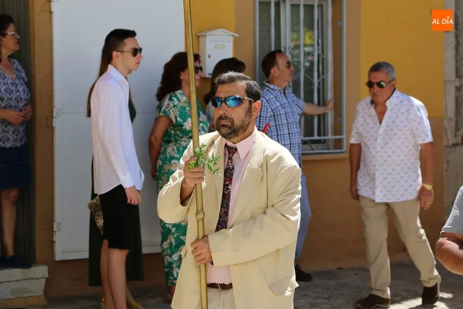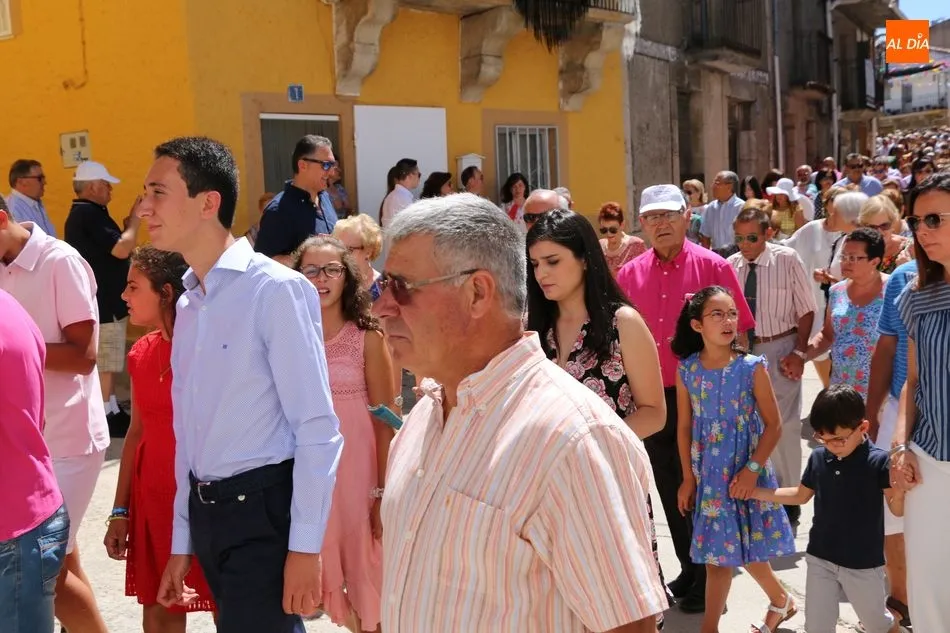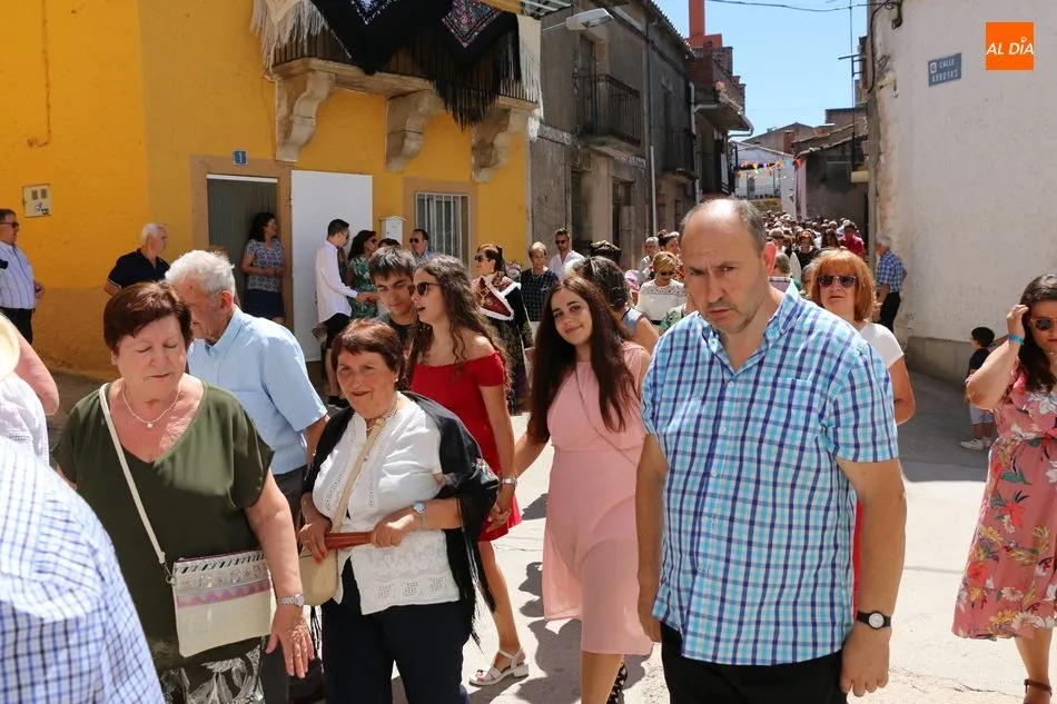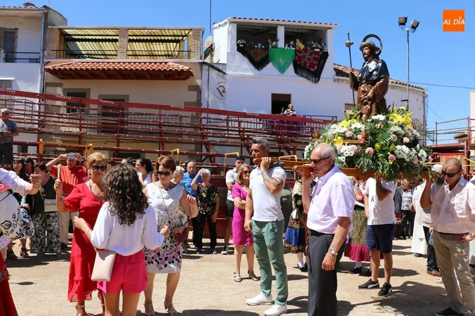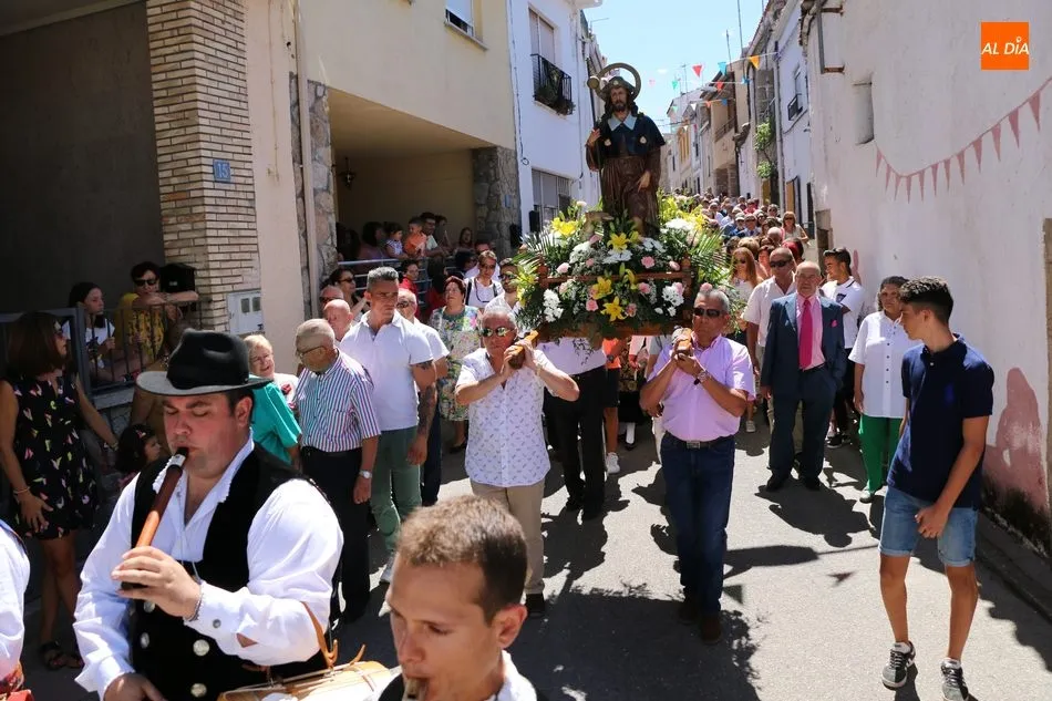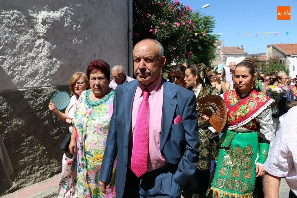 Tras la homilía oficiada por el párroco local, José Ramón Mateos, acoampñadp también por el sacerdote Ignacio Gómez, los vecinos sacaron al Patrón en procesión. La devoción a San Roque se percibía cada pocos metros con paradas para que todos pudieran llevar a hombros la peana del Santo, hasta su entrada en la Plaza Mayor, donde un grupo de charras le brindó un baile interpretado con la gaita y el tamboril por los tamborileros locales Fernando Corral, Javier Ramos y Jorge Martín.