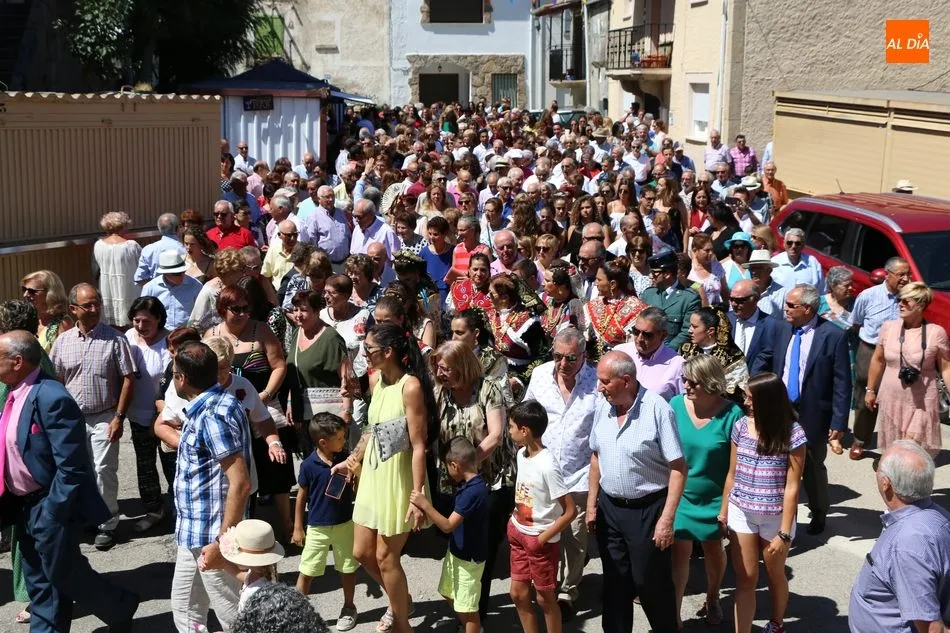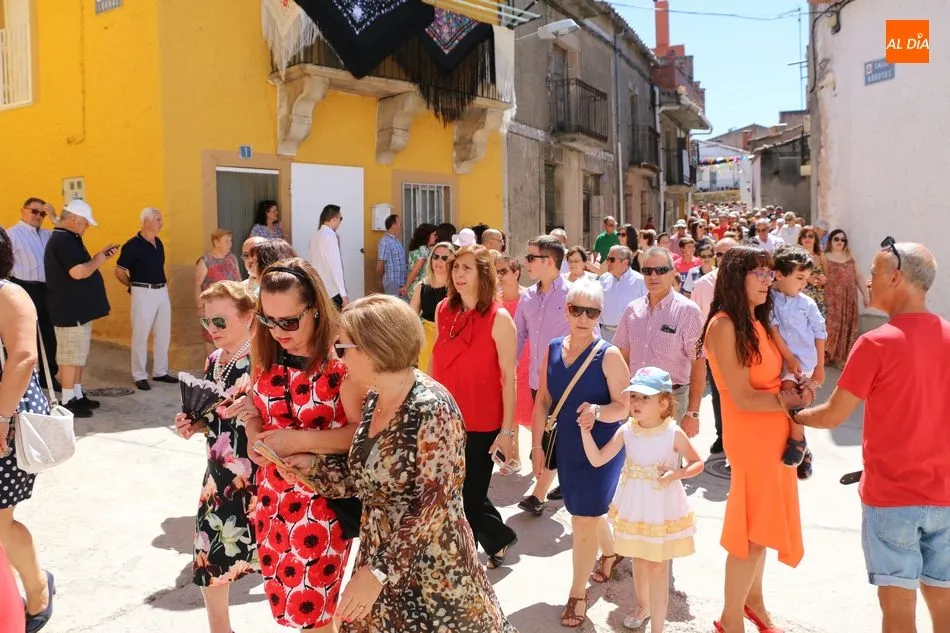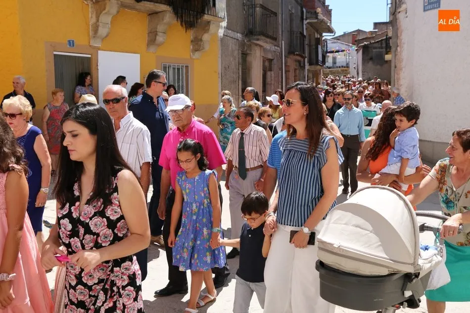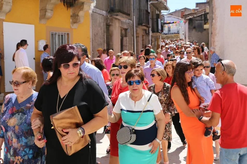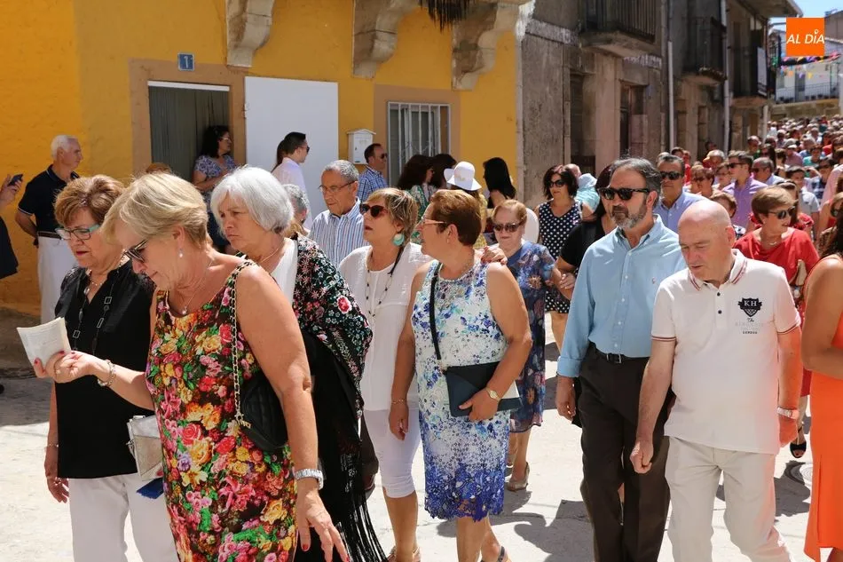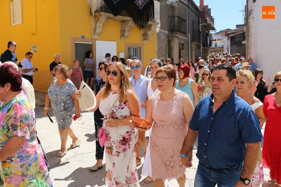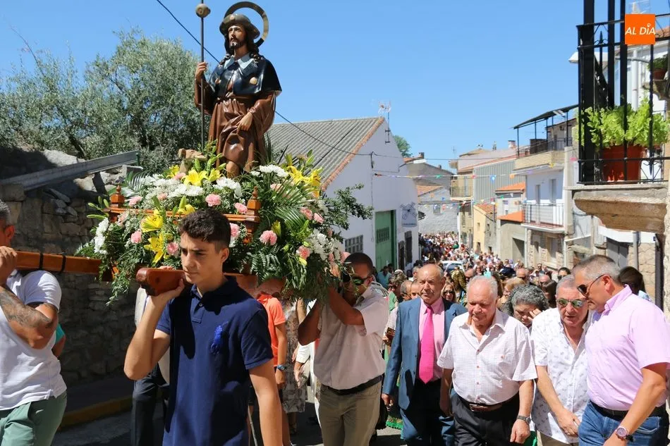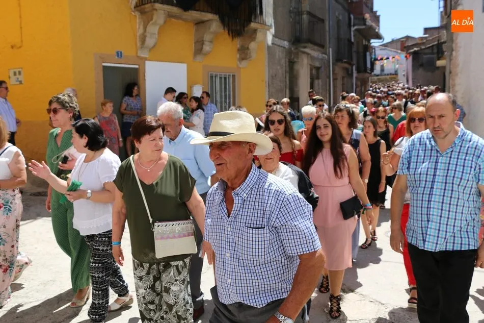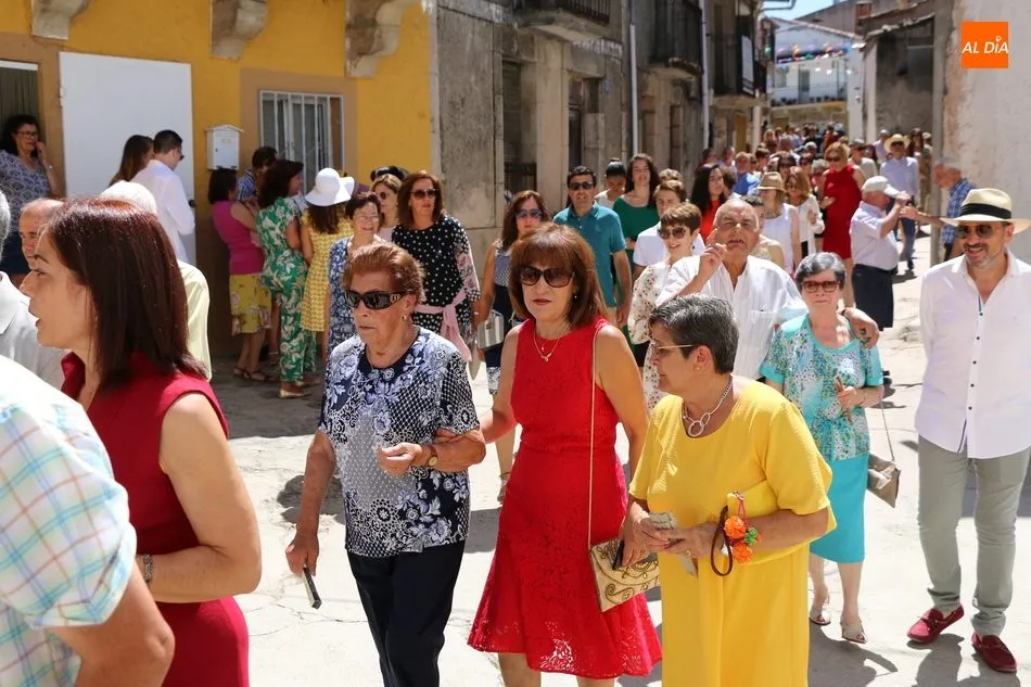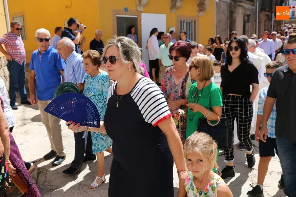 Tras la homilía oficiada por el párroco local, José Ramón Mateos, acoampñadp también por el sacerdote Ignacio Gómez, los vecinos sacaron al Patrón en procesión. La devoción a San Roque se percibía cada pocos metros con paradas para que todos pudieran llevar a hombros la peana del Santo, hasta su entrada en la Plaza Mayor, donde un grupo de charras le brindó un baile interpretado con la gaita y el tamboril por los tamborileros locales Fernando Corral, Javier Ramos y Jorge Martín.