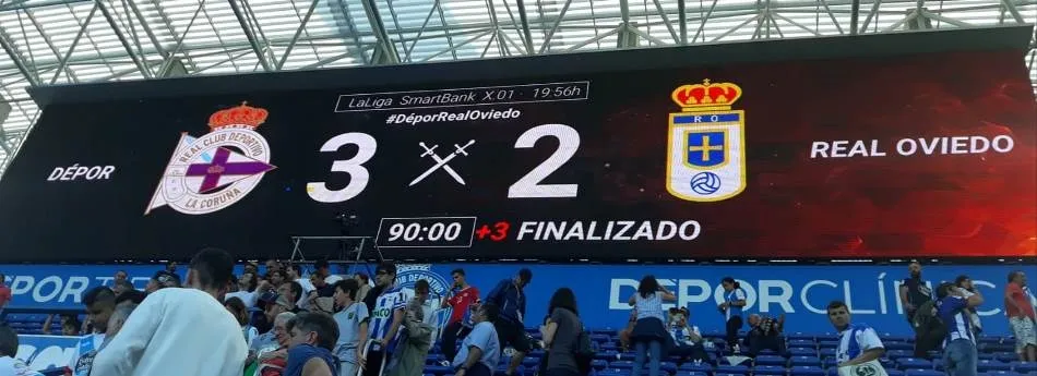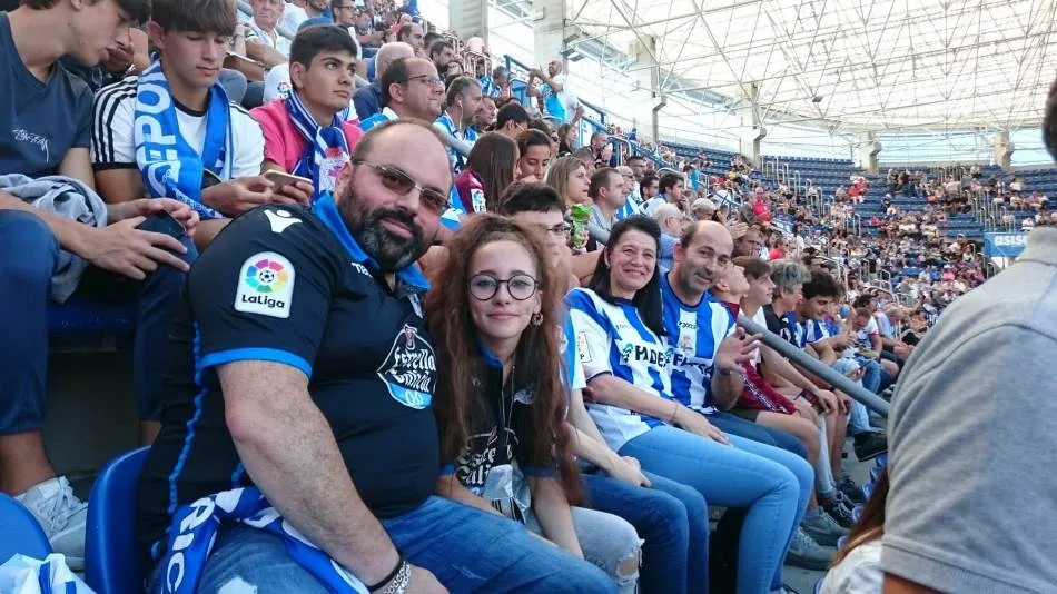 Por otro lado, integrantes de la Peña Deportivista Miróbriga realizaron un viaje mucho más largo, hasta La Coruña, para presenciar en el Estadio de Riazor el primer compromiso de Liga del Deportivo (dentro de la Liga SmartBank) frente a otro histórico del fútbol español, el Real Oviedo. Como se puede ver en la imagen, los miembros de esta Peña recientemente constituida lucieron una bandera con su escudo, en el que están integradas las III Columnas.