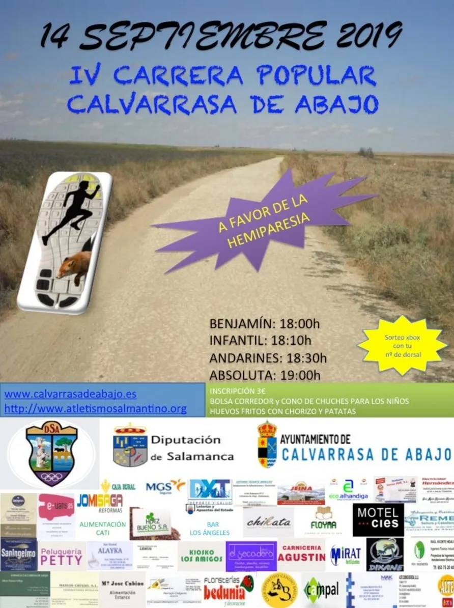El recorrido de la prueba, organizada por el Ayuntamiento de Calvarrasa de Abajo y la Diputación de Salamanca, comenzará en la trasera del frontón nuevo y transcurrirá tanto por el casco urbano como por caminos cercanos a la localidad. La prueba comenzará a las 19 horas. La salida para los menores será a las 18 horas. Los andarines comenzarán a las 18:30 horas.