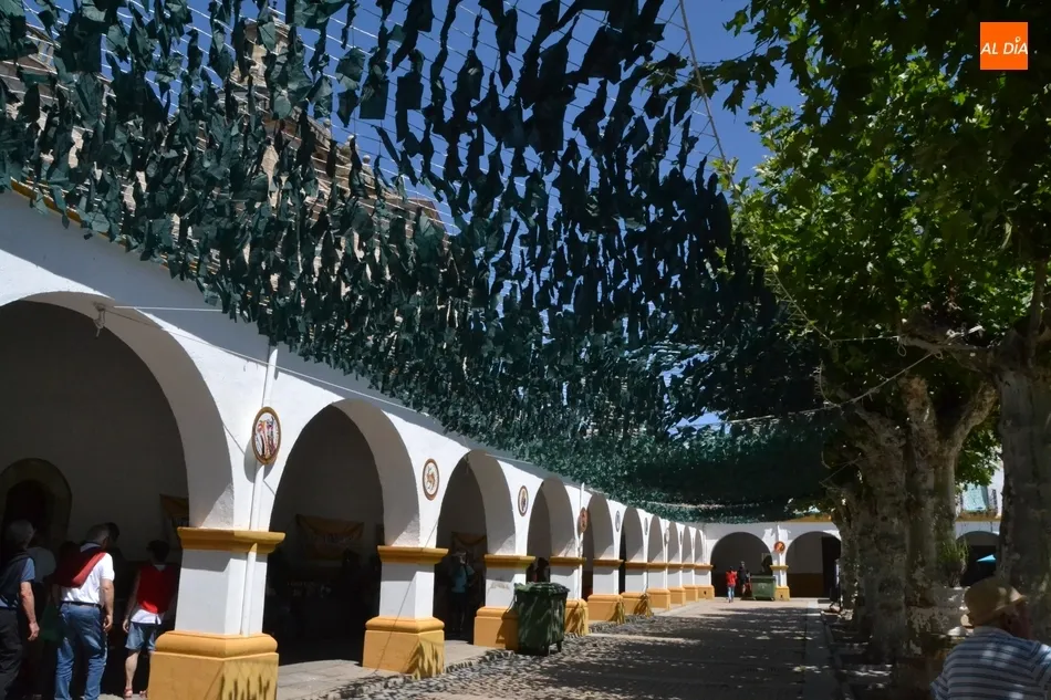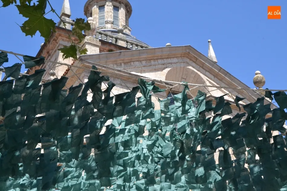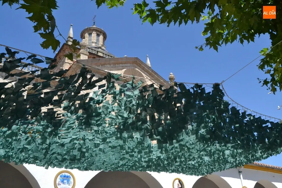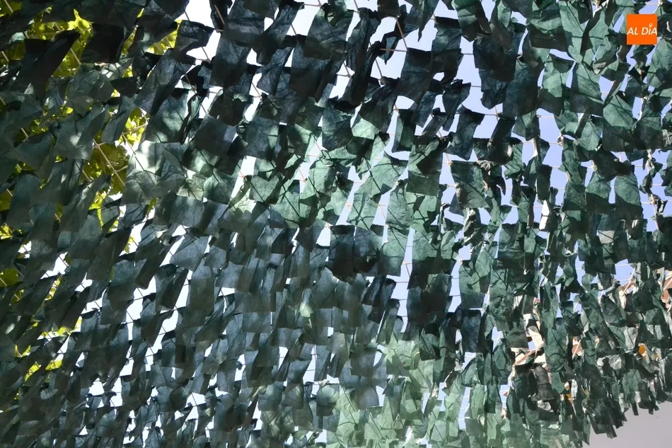 Por otro lado, a última hora de la mañana del martes ya estaba instalado el ?techo? de uno de los laterales de la Plazuela, a base de pequeños papeles de color verde (algunos de los cuales se estaban desprendiendo producto del intenso viento que hacía) colgando de una red. Asimismo, durante ese tramo de la mañana se estaba ultimando la entrada, donde figuran por ejemplo elementos referentes al vestuario, como maniquíes, prendas de ropa o zapatos.