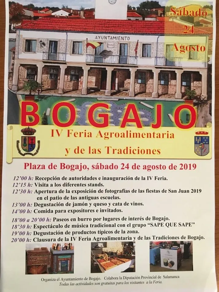 Un total de 25 expositores participarán en la IV Feria Agroalimentaria y de las Tradiciones que se celebrará el sábado, 24 de agosto, en Bogajo. En esta nueva edición no faltarán las degustaciones de productos típicos de la zona ni los paseos en burro por lugares de interés y, además, este año se incluye una exposición de fotografías de las fiestas de San Juan 2019.