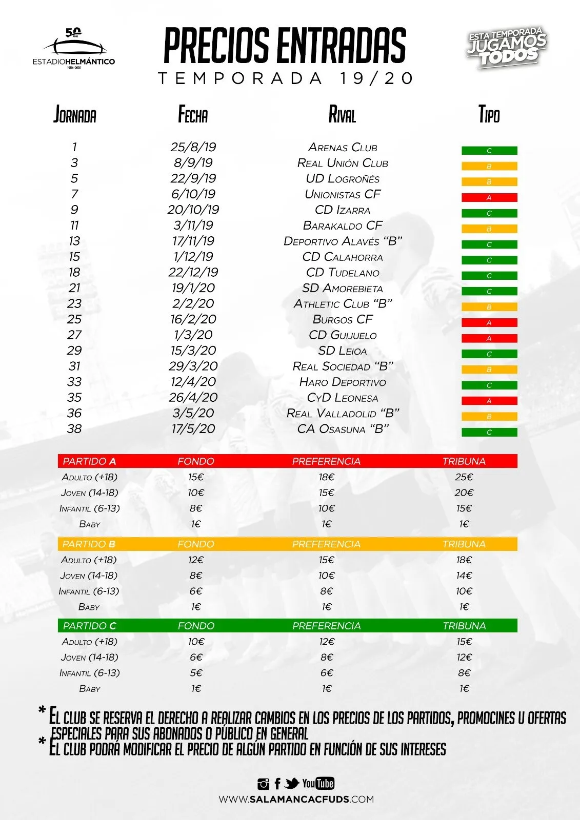 Los encuentros de tipo A son los más caros, dado que cuestan entre 15 y 25 euros para los mayores de 18 años, mientras que en la 2018/2019 llegaron a alcanzar los 32 euros. En este bloque se encuentran los duelos frente a Unionistas, Burgos, Guijuelo y Cultural Leonesa.