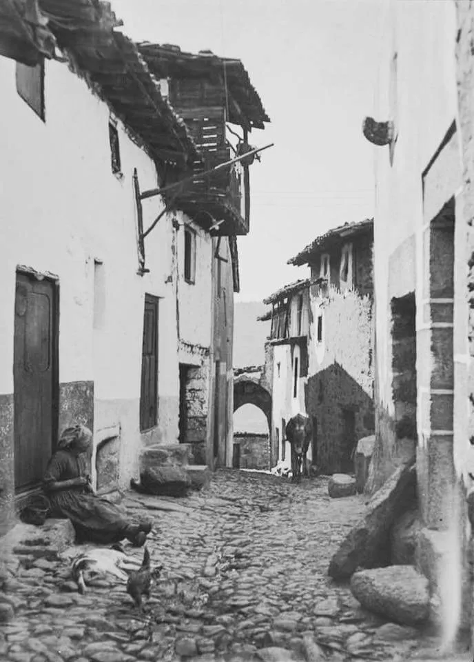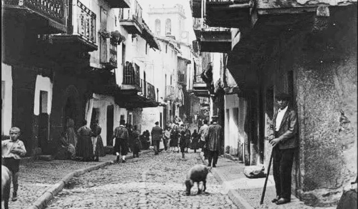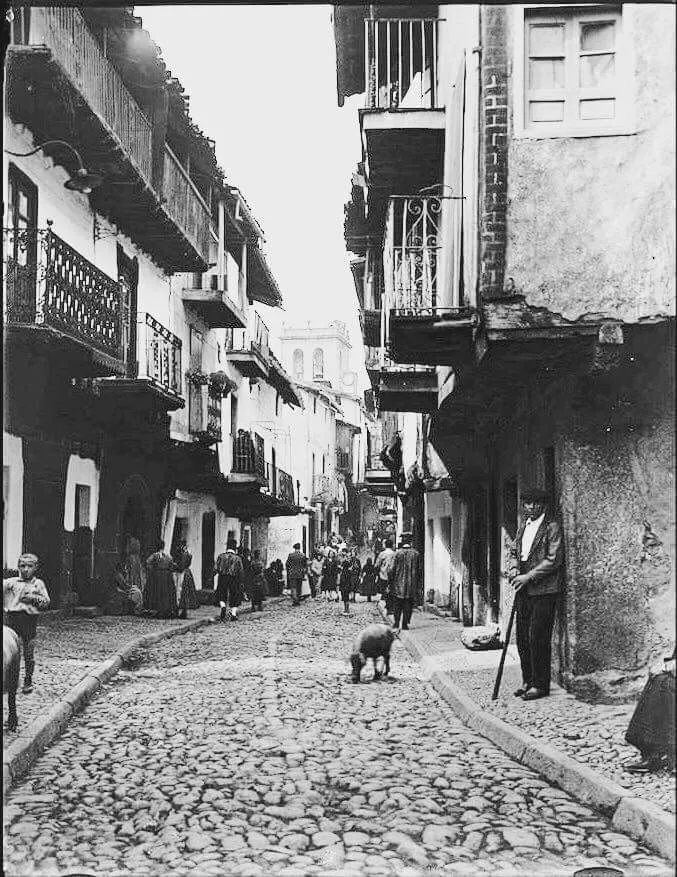 - Calle principal, con casas abalconadas y el campanario al fondo. Entre 1928 y 1936.