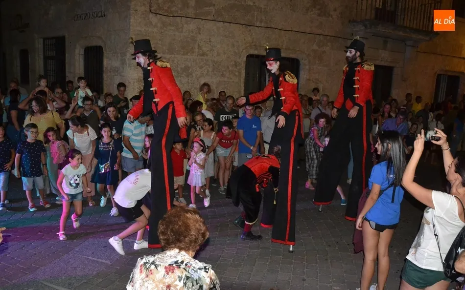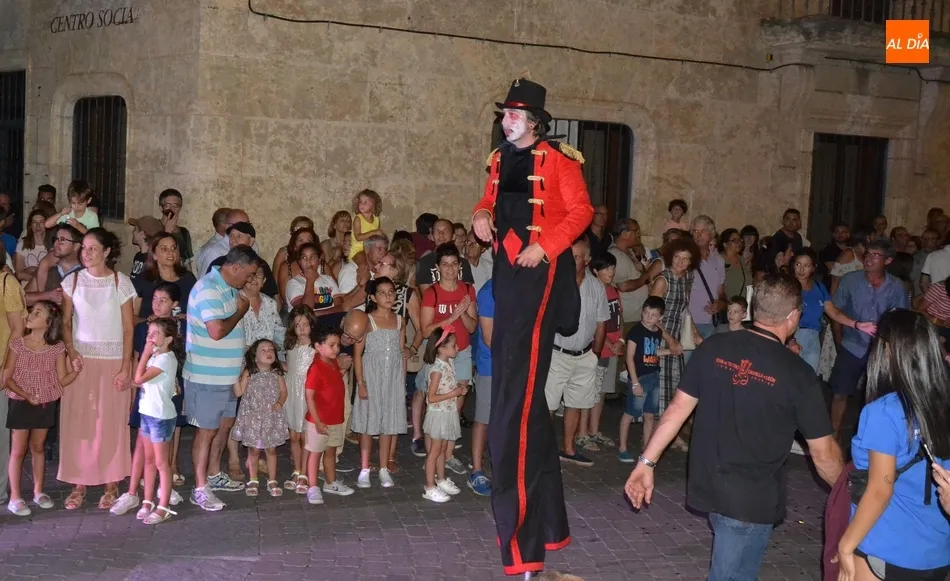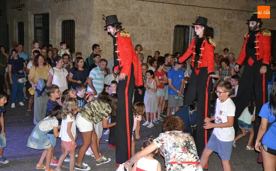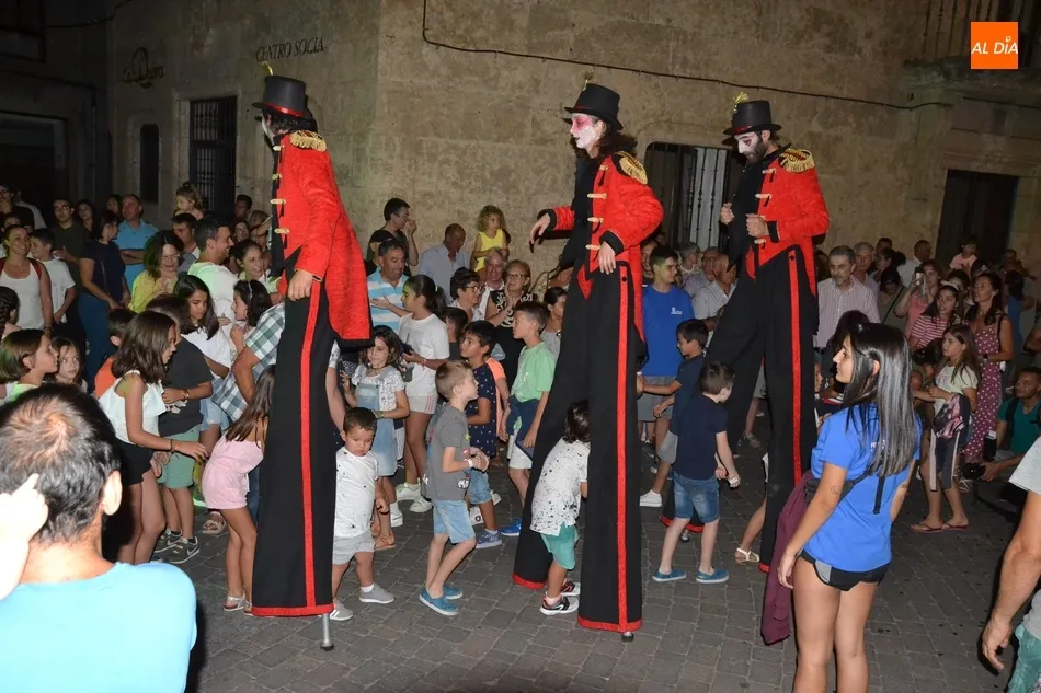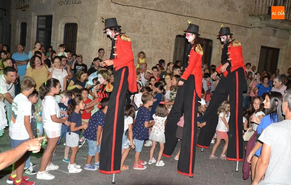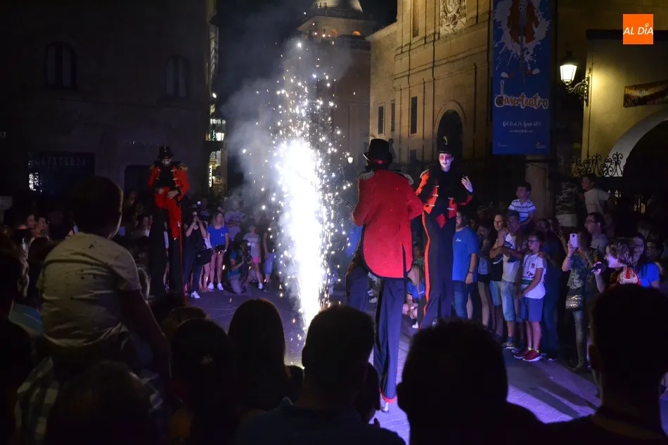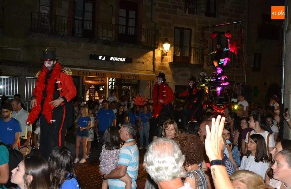 Durante este nuevo pasacalles, los mozos de Klez 80 Circus repitieron algunos de los momentos de espectáculo de la mañana, como coger a niños del público, o permitirles pasar entre sus piernas, pero también hubo algunas novedades, como pequeños fuegos de artificio.